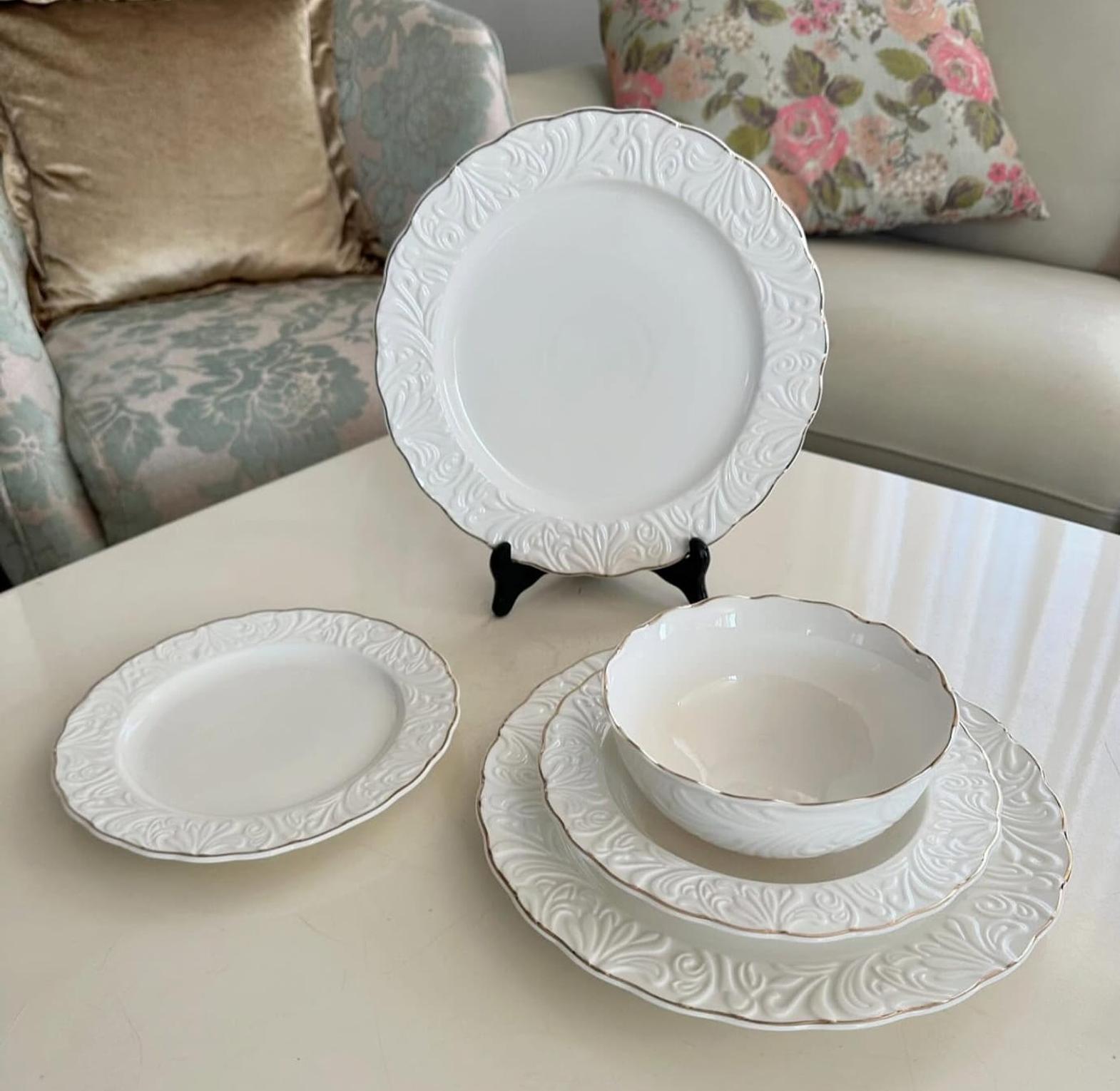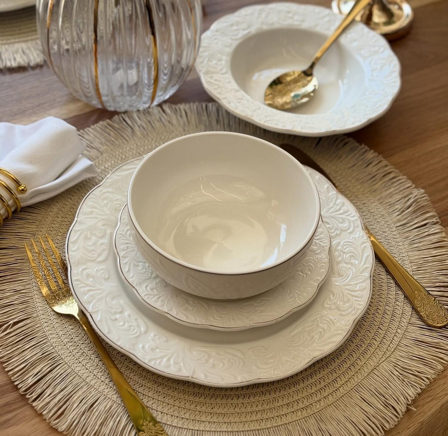 Upgrade your dining experience with this 24pcs Luxury Embossed White Porcelain Dinner Set with Gold Rim, designed to bring sophistication and timeless beauty to any table setting. Crafted from high-quality porcelain, each piece features intricate embossed detailing paired with a refined gold trim—perfect for homes that appreciate modern elegance.