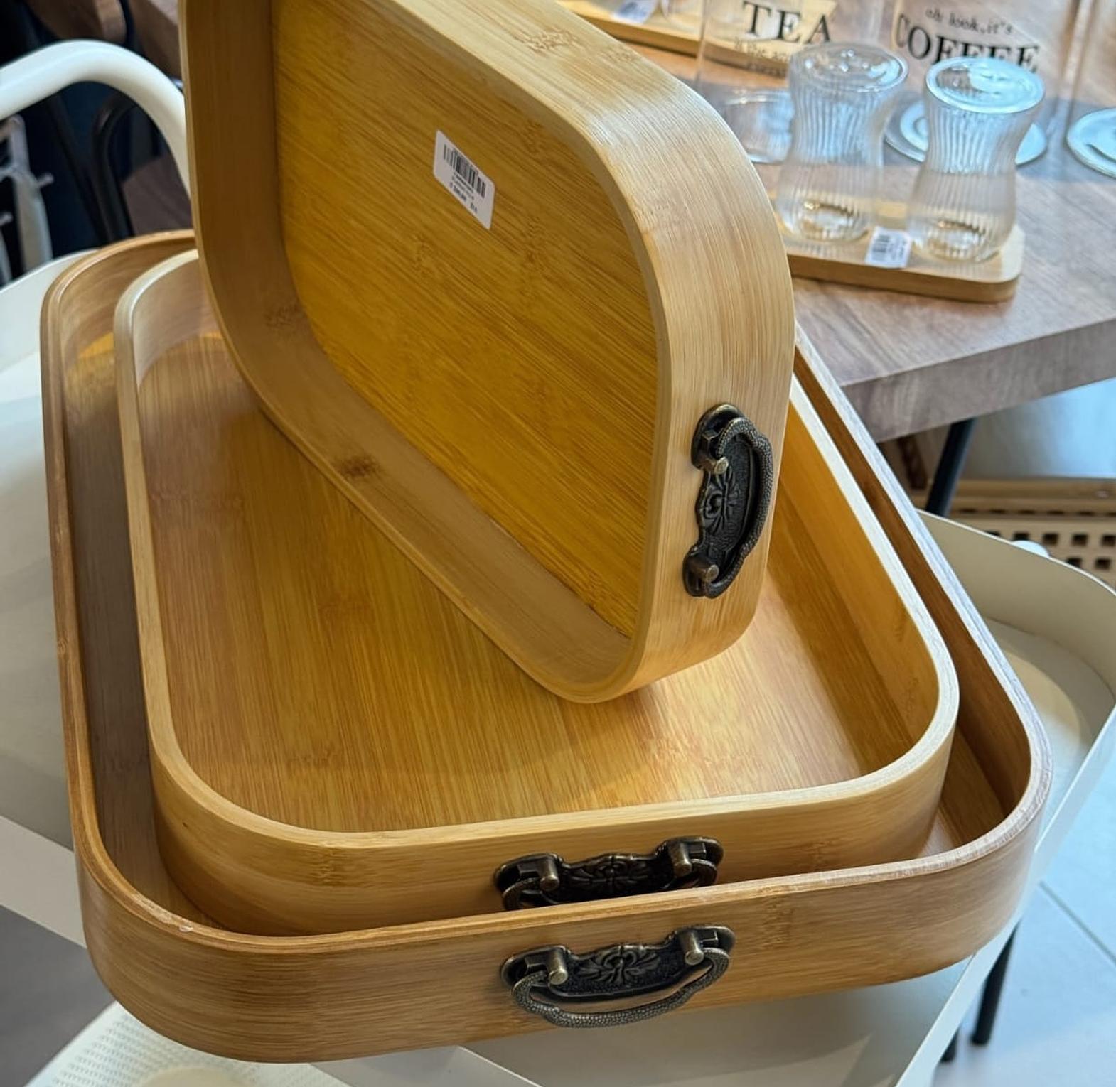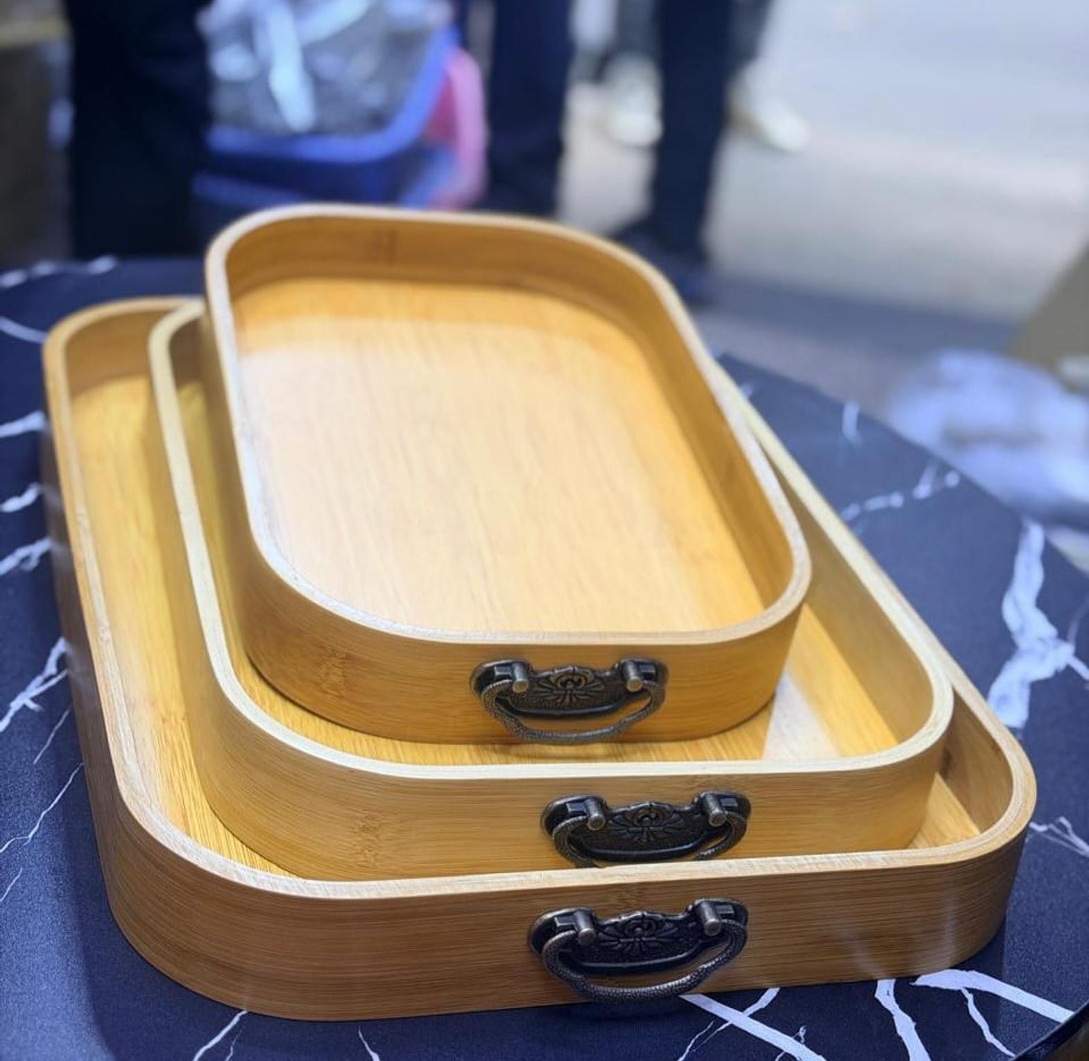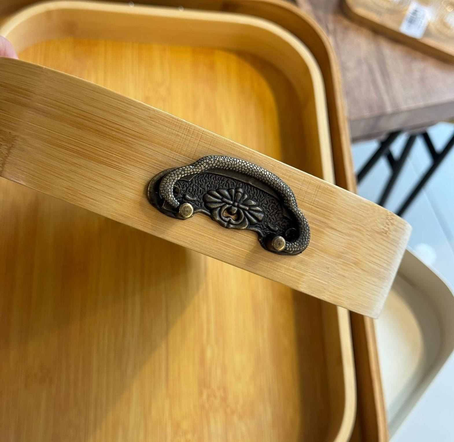 Add a touch of timeless elegance to your home with this 3-Piece Bamboo Serving Tray Set with Antique Metal Handles. Crafted from high-quality natural bamboo, these trays are durable, eco-friendly, and beautifully designed with vintage metallic handles for a classy touch. Ideal for serving drinks, breakfast in bed, snacks, or as decorative centerpieces, the trays nest perfectly for compact storage. A versatile and stylish addition to your kitchen, dining area, or coffee table décor, perfect for both everyday use and entertaining guests.