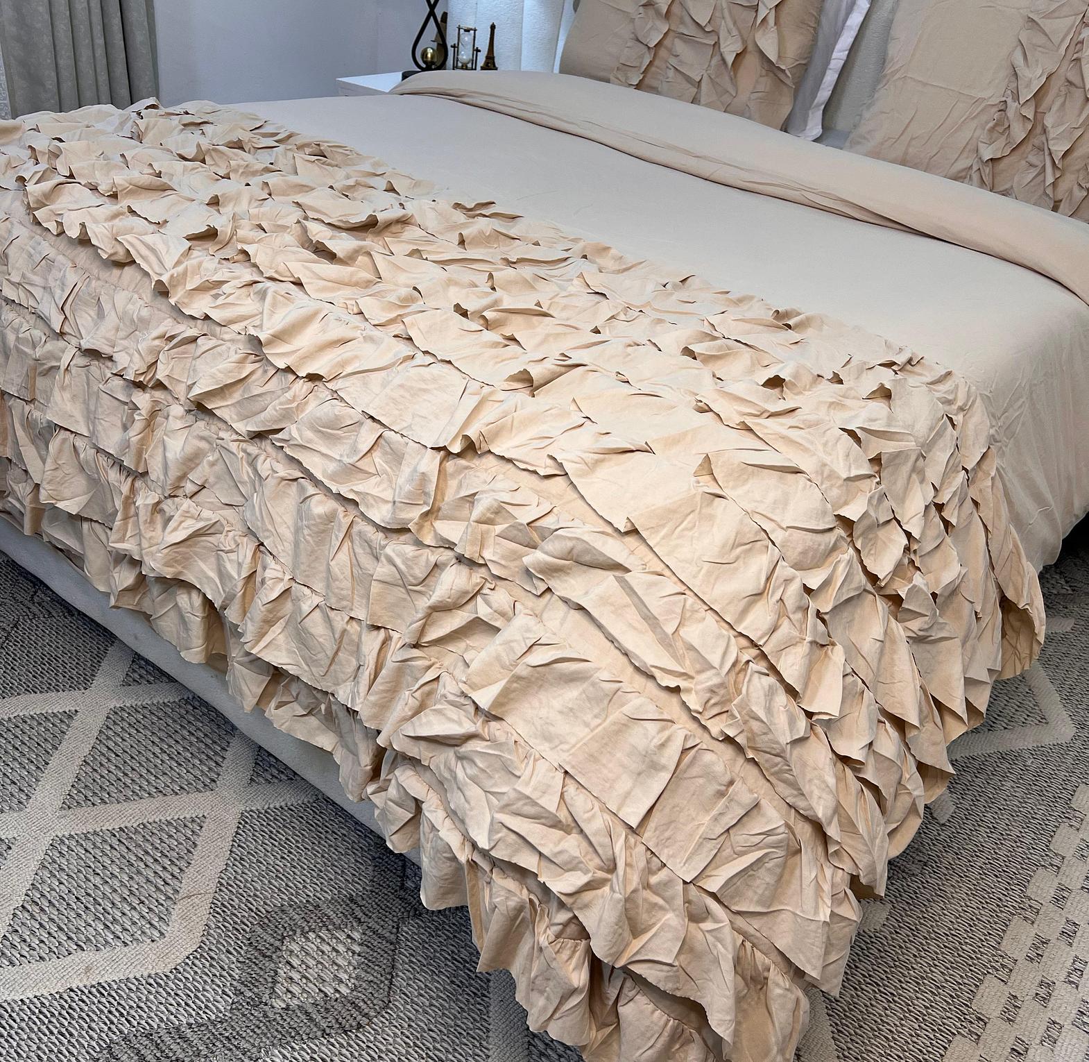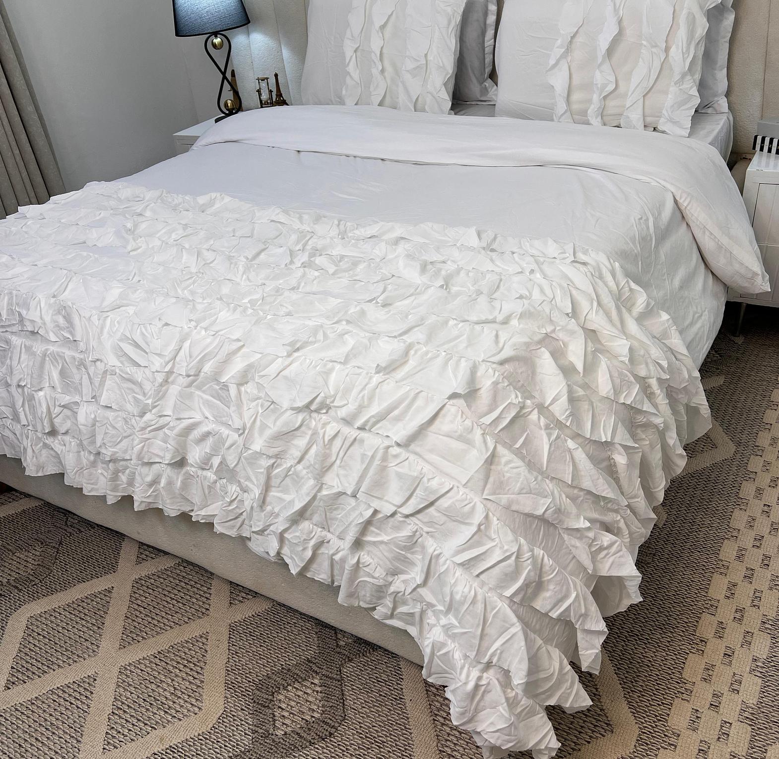 Transform your bedroom with this luxurious 3PC Ruffled Duvet Cover Set (6x6 King Size) designed to add softness, elegance, and a romantic touch to your space. The set includes one duvet cover and two matching pillowcases, all detailed with a stunning layered ruffled texture that creates a rich, sophisticated look.