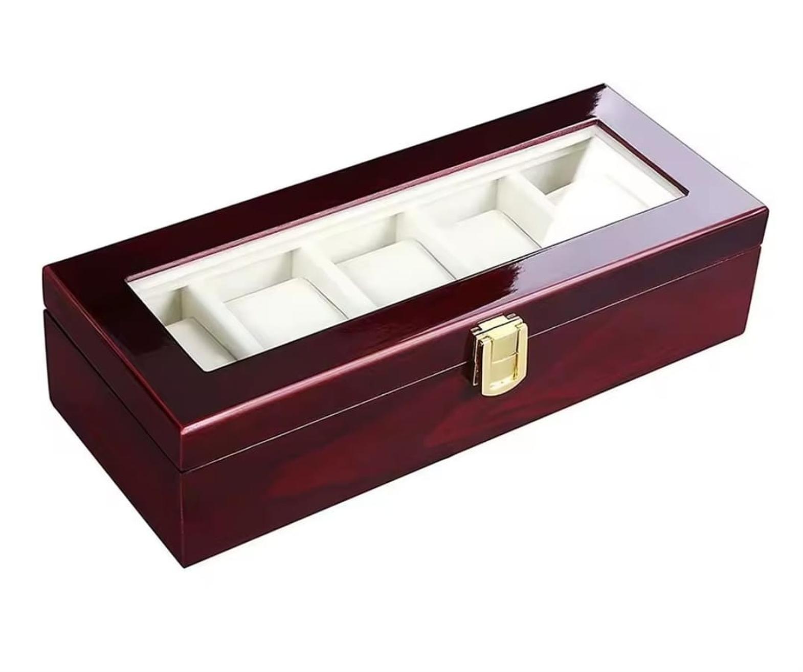 Showcase and protect your timepieces in style with this 5-slot glossy wooden watch holder. Designed with a smooth polished finish and a transparent glass top, it allows you to display your watches while keeping them dust-free and secure. The soft cushioned interior protects your watches from scratches and damage.