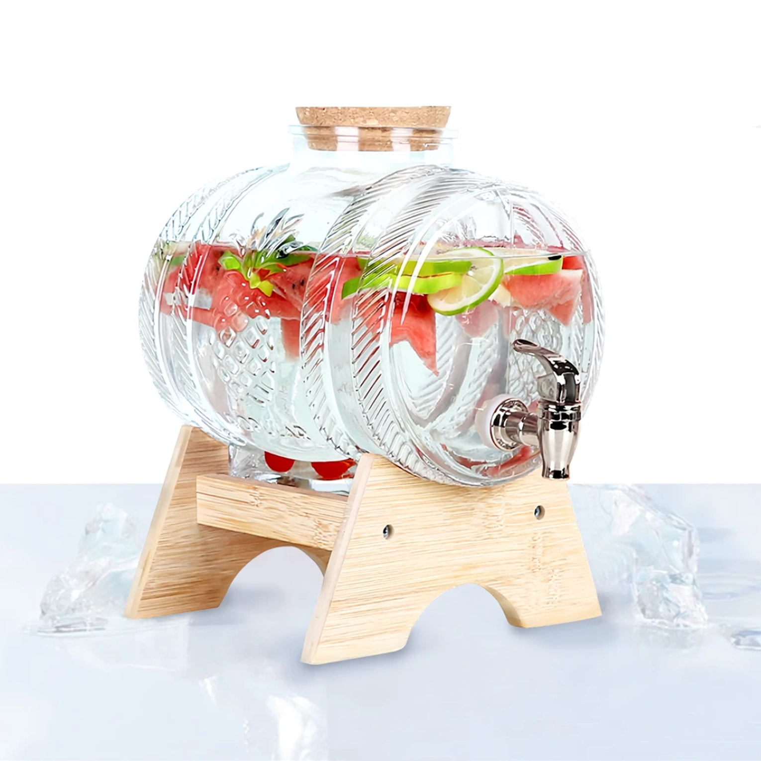 Serve your drinks in style with this elegant 5-litre horizontal glass juice dispenser, perfect for home hosting and events. ▫️Capacity: 5 Litres ▫️High-quality clear glass with stylish textured design ▫️Horizontal barrel shape for a modern look ▫️Durable wooden base holder for stability ▫️Stainless steel tap for smooth, easy dispensing ▫️Ideal for juice, infused water, cocktails & party drinks Perfect for parties, brunch setups, events, and everyday entertaining.