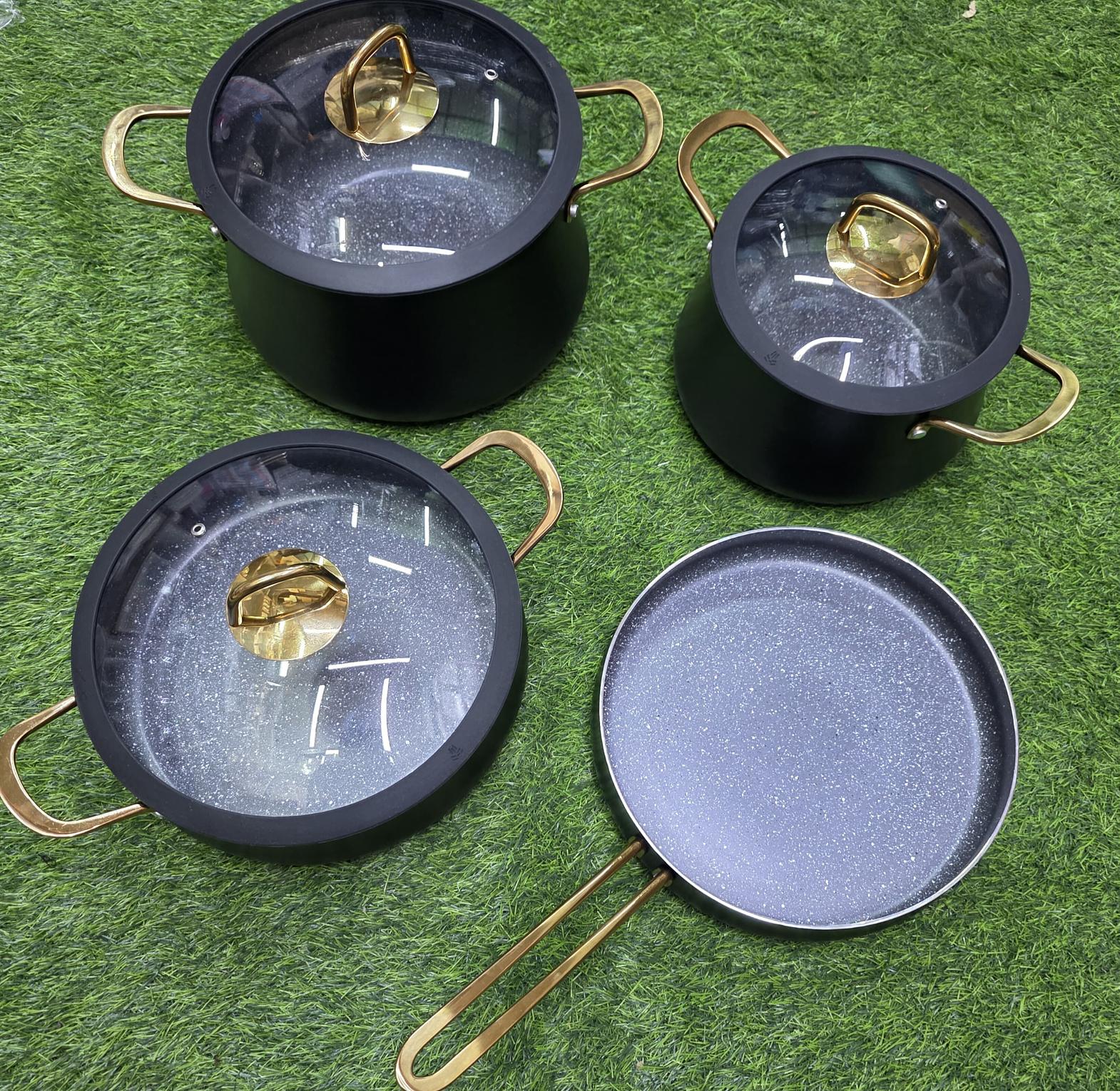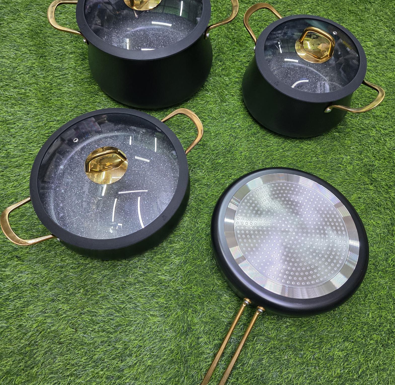 Upgrade your kitchen with this 7-piece high quality non-stick aluminium cookware set, designed for efficient, healthy and hassle-free cooking. Made with premium granite non-stick coating, the pots and pan are scratch-resistant, easy to clean and allow you to cook with minimal oil. The induction-compatible bottom ensures fast, even heat distribution on all cooktops, including gas, electric and induction.