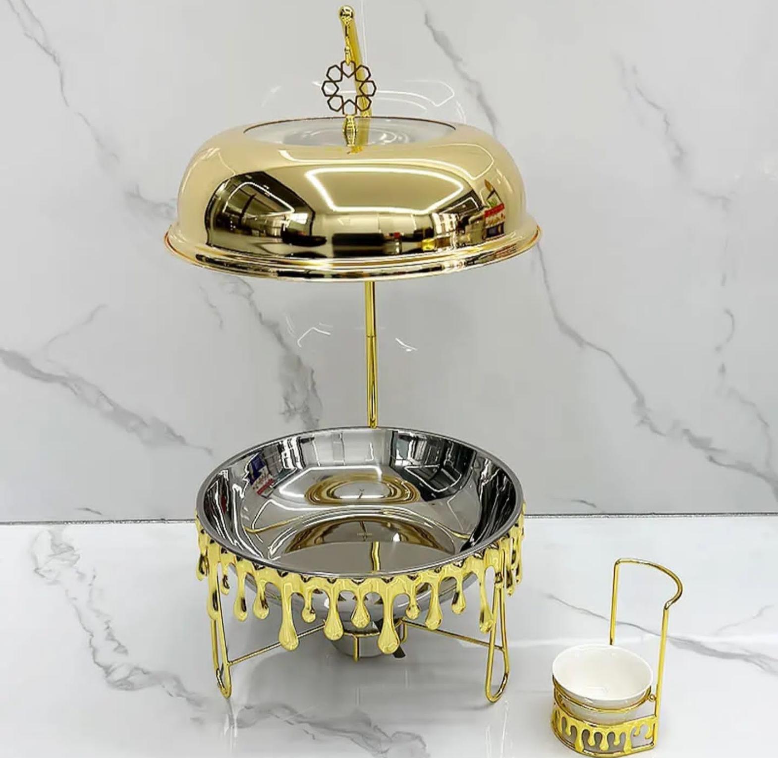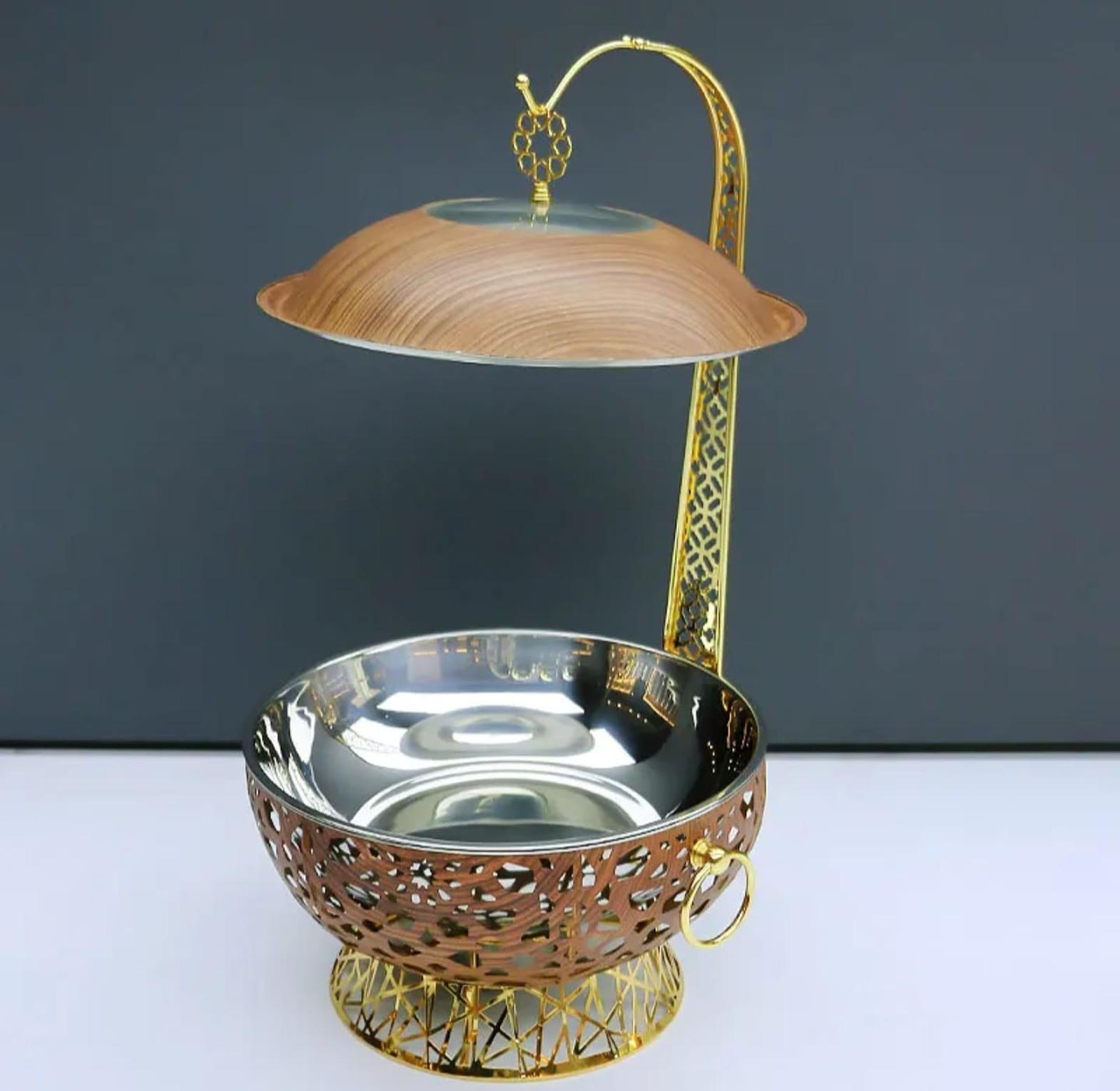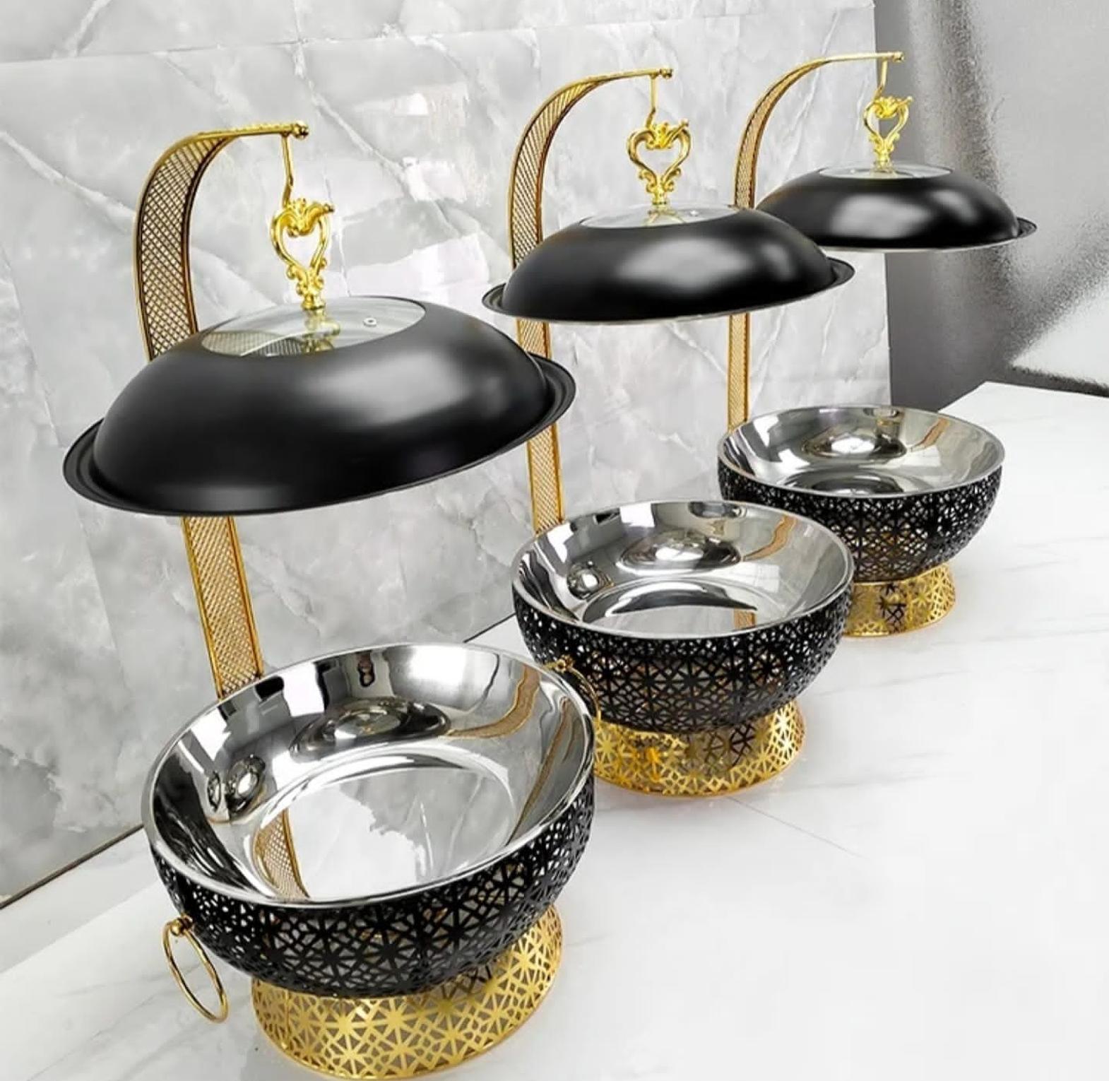 Serve your meals in style with this elegant, luxurious hanging chaffing dish, designed to elevate any dining or buffet setup. Comes with a transparent lid cover for easy viewing and a bottom heating stove to keep your food warm throughout your event.