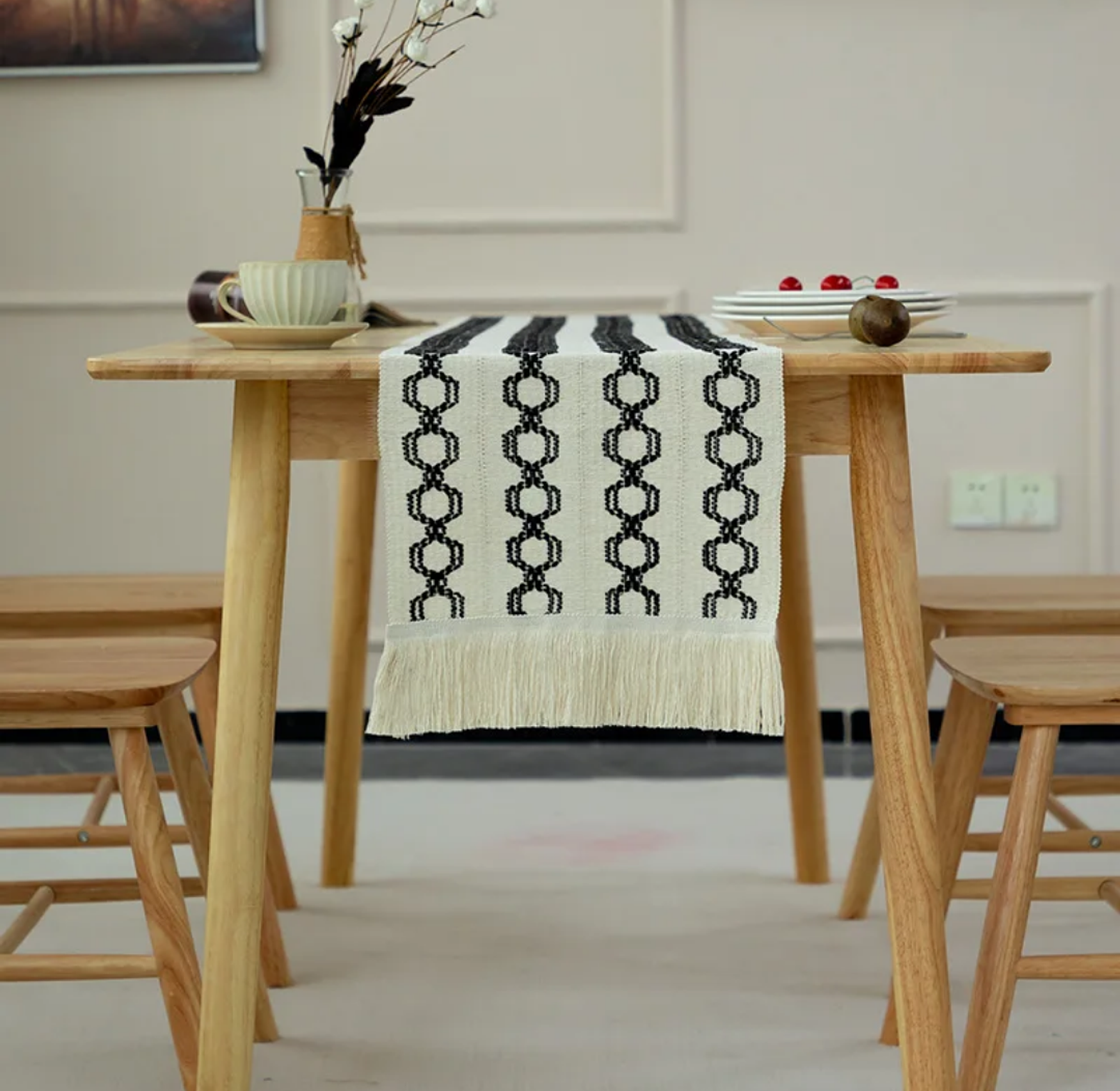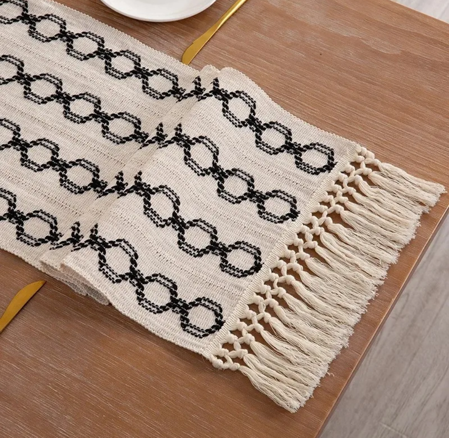 Enhance your dining or living space with this Black Bohemian Tassel Table Runner, crafted to bring a sleek yet warm aesthetic to your home. Designed with a chic boho-inspired pattern and stylish tassel detailing, it blends timeless elegance with everyday functionality.