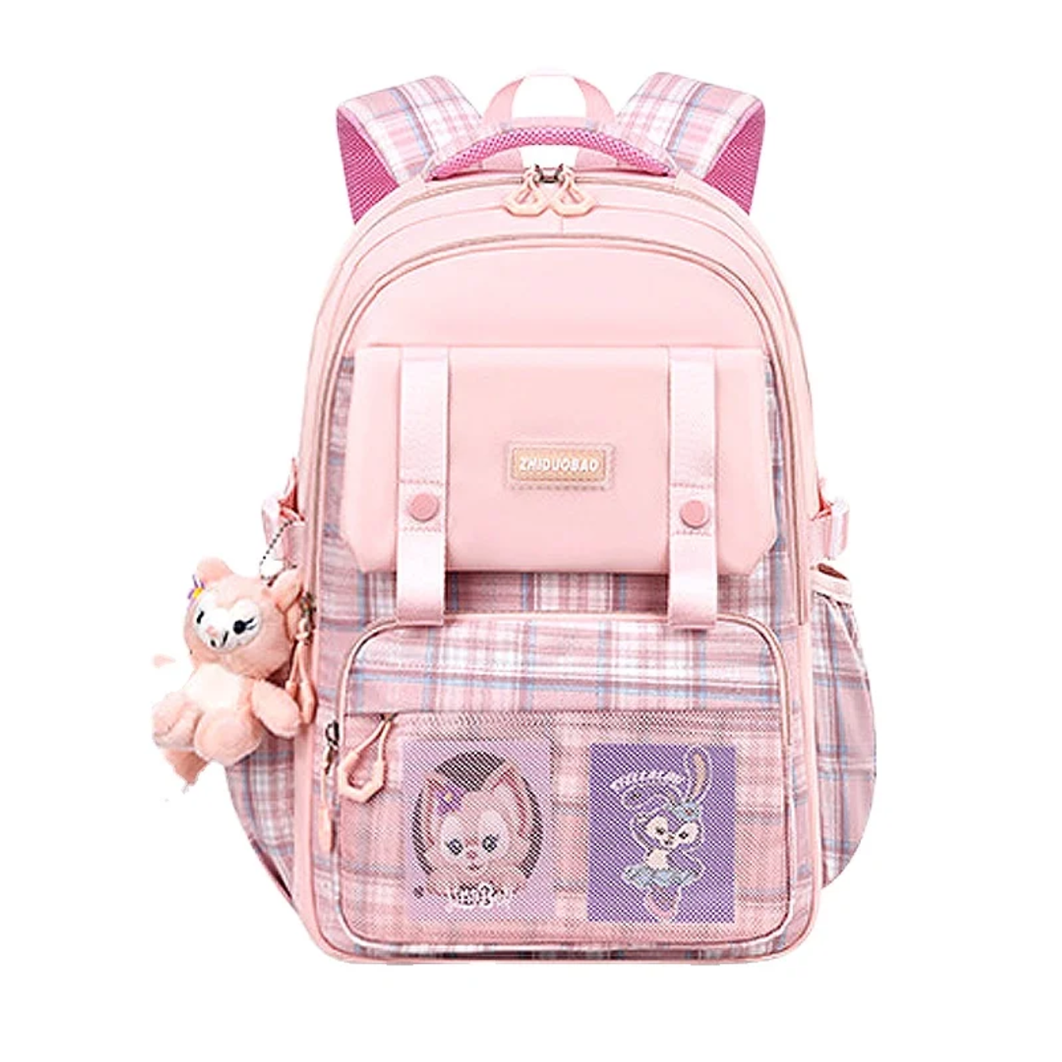It features padded shoulder straps and a cushioned back panel for comfortable carrying, along with multiple compartments to neatly organize books, exercise books, stationery, and small essentials. The front mesh pocket adds easy access, while the charming plush accessory and plaid design make it a favorite among kids.