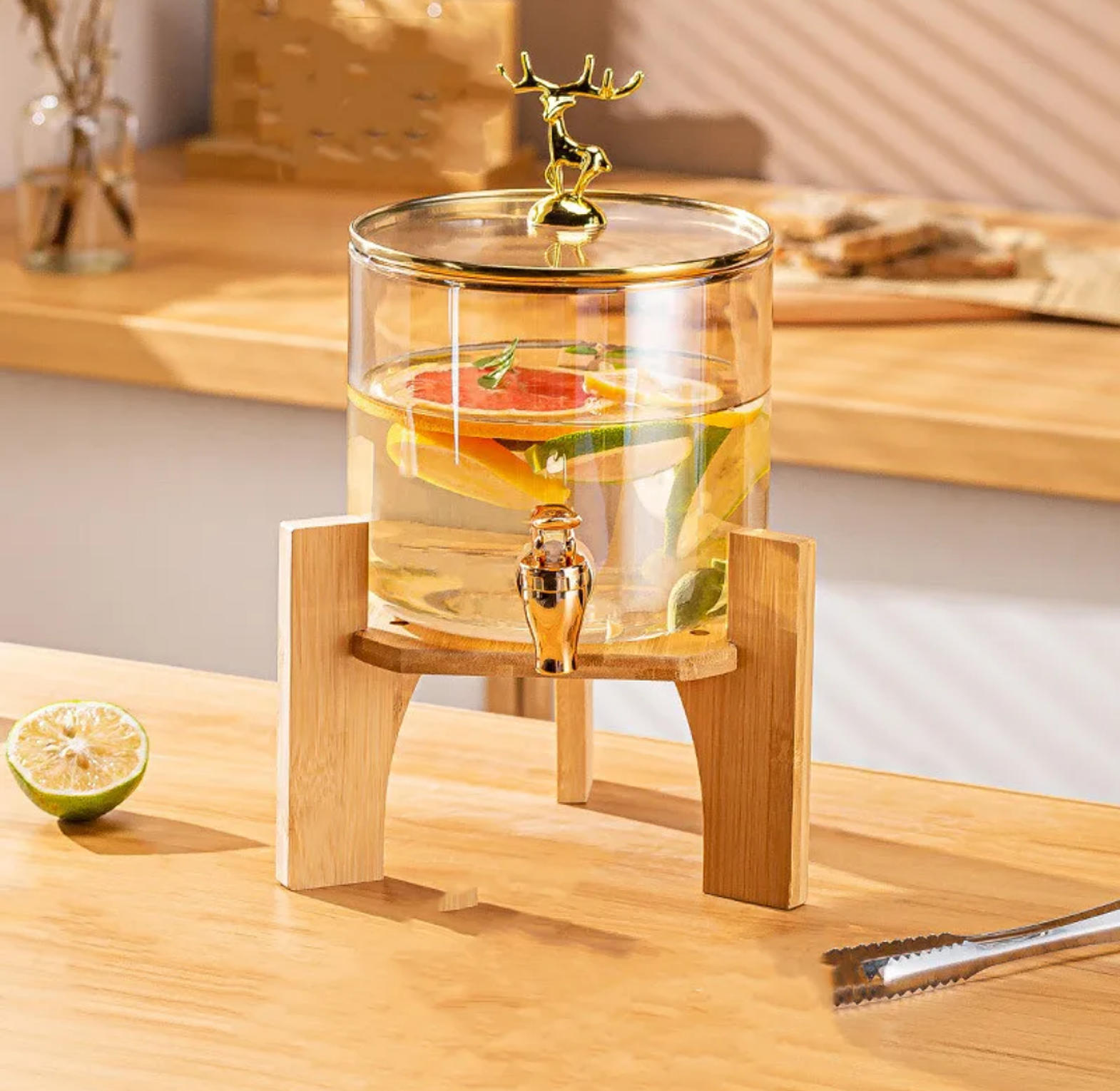 Serve your drinks with sophistication using this 5.5L Glass Beverage Dispenser. Designed with a clear glass body, it lets you beautifully display fruit-infused water, cocktails, or juices, while the sturdy wooden stand elevates it for easy dispensing. The dispenser is topped with a golden deer accent lid, adding a touch of charm and luxury to your serving experience. Ideal for parties, events, or daily home use, this dispenser combines functionality with elegance, making it a stunning centerpiece for any table.