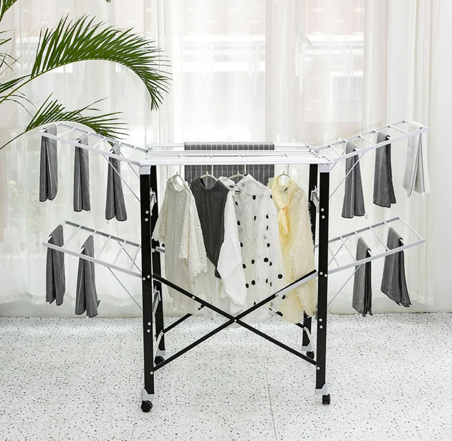 The Heavy-Duty Foldable Wing Clothes Drying Rack with Wheels offers a practical and sturdy solution for drying laundry efficiently. Designed with adjustable wings for extra hanging space and smooth-rolling wheels for easy mobility, this rack is ideal for households of all sizes. It folds flat for convenient storage when not in use, making it perfect for apartments, balconies, or laundry rooms. Crafted from rust-resistant steel, it ensures durability and stability even with heavy loads. Whether for everyday clothes, beddings, or delicates, this drying rack delivers reliable performance and effortless convenience.