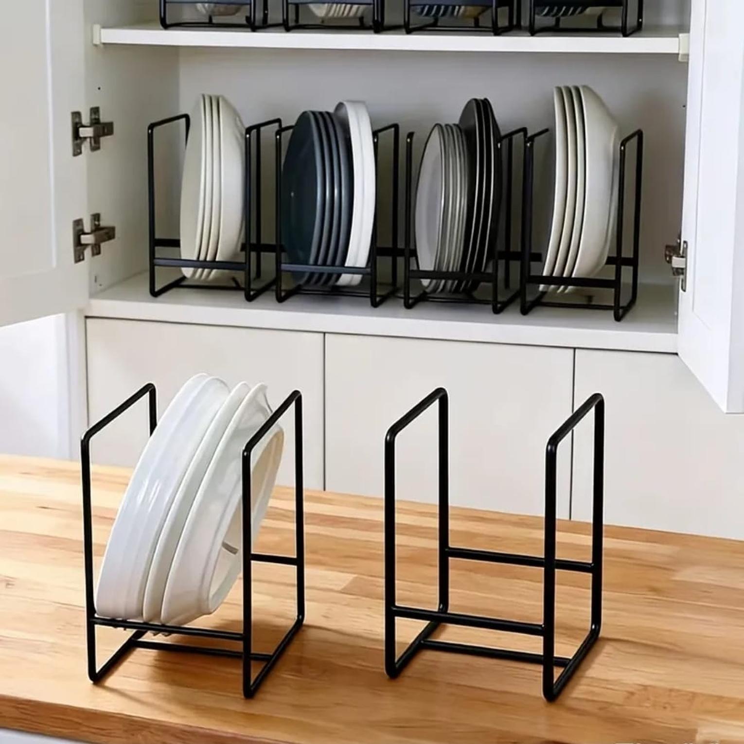 Keep your kitchen tidy and well-organized with this Heavy-Duty Metal Plate Holder, built from durable metal for long-lasting everyday use. Its sturdy, well-spaced slots securely hold dinner plates, pot lids, pans, chopping boards, or trays, making it a practical storage solution for countertops, cabinets, or shelves. The open design allows easy access while promoting proper air circulation for drying, making it ideal for both home kitchens and commercial use.