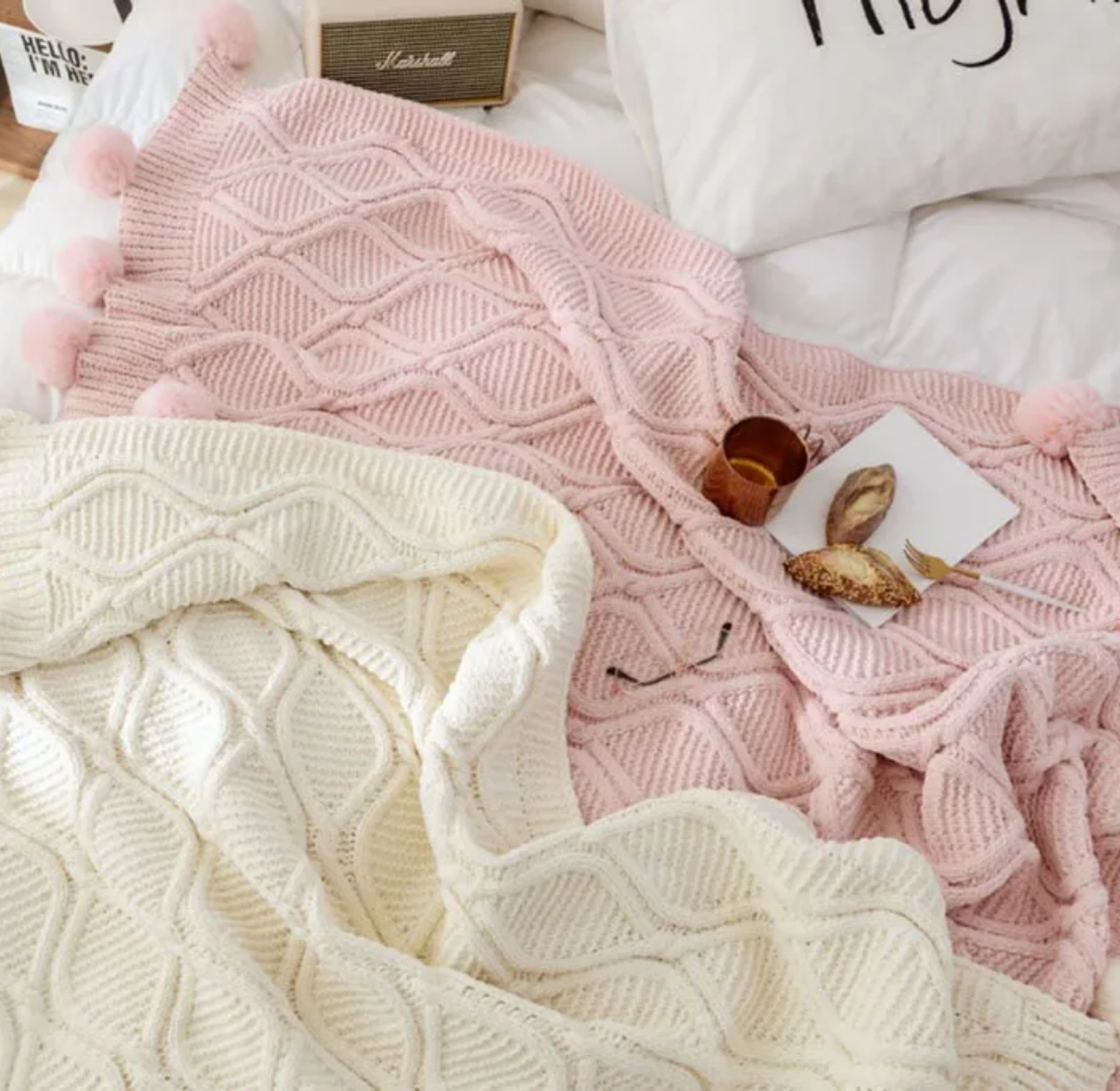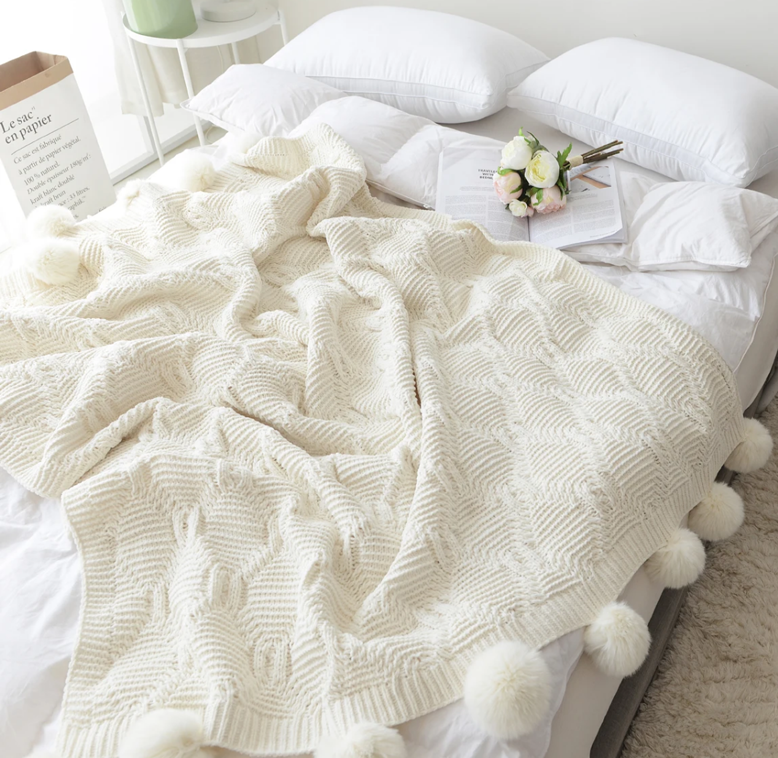 Add warmth and charm to your home with this beautifully knitted throw blanket, designed with playful pom pom accents on all four corners. Measuring 127cm by 172cm, it’s the perfect size for layering over your sofa, bed, or armchair. Soft, stylish, and versatile, it blends comfort with a touch of elegance—making it a must-have for cozy evenings or as a chic accent piece in your décor.