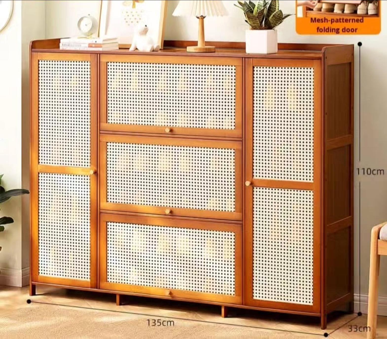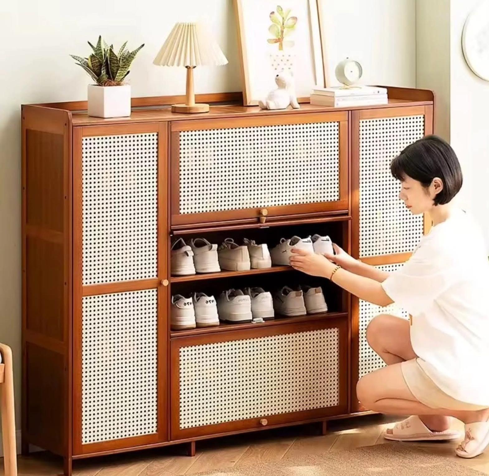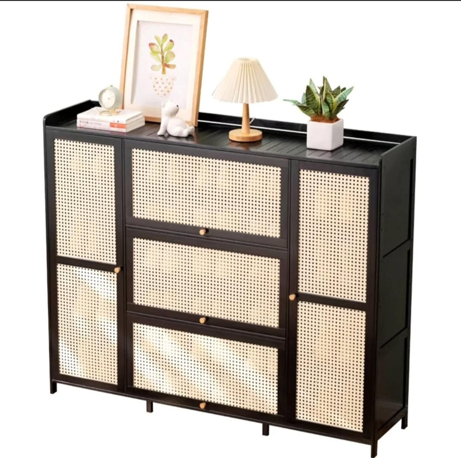 This rattan-style shoe cabinet combines modern design with smart storage, making it an ideal solution for organized living. Crafted with a sleek frame and decorative woven-style panels, it enhances your space while keeping clutter out of sight. The cabinet offers generous storage capacity, holding up to 26 pairs of shoes, and can also be used to store bags, accessories, or household items.