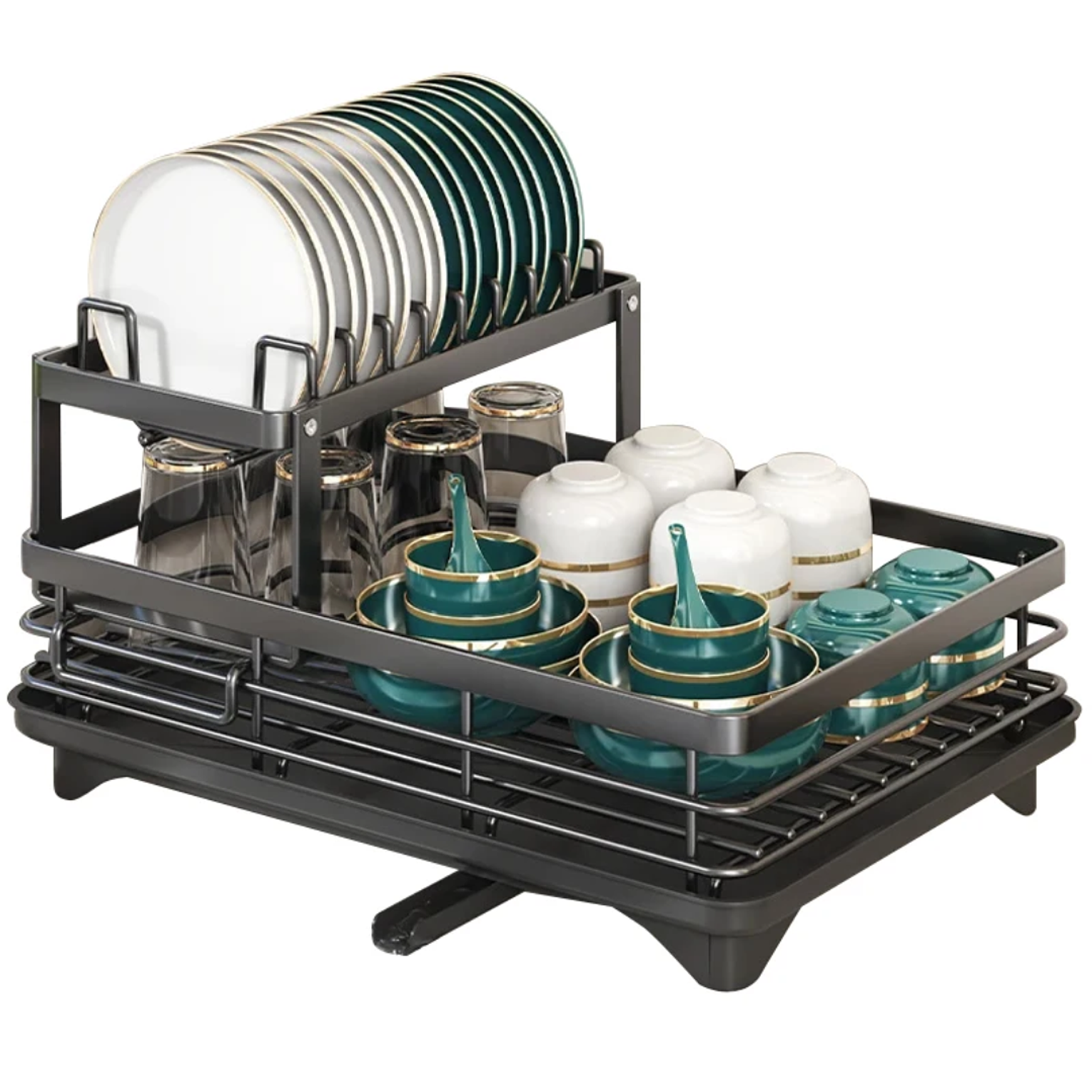 A sturdy two-tier metallic dish rack designed to maximize drying space and keep your kitchen organized and clutter-free.