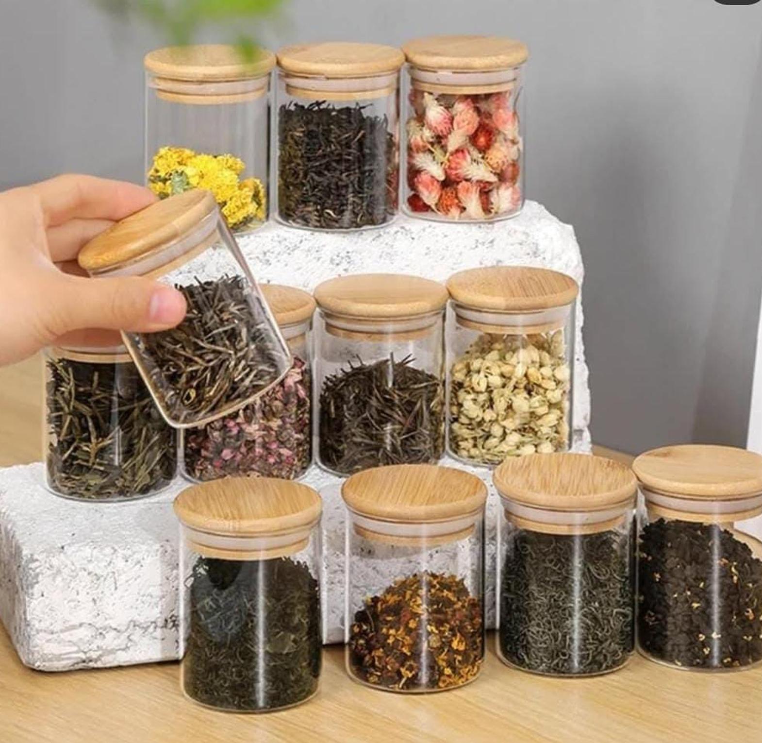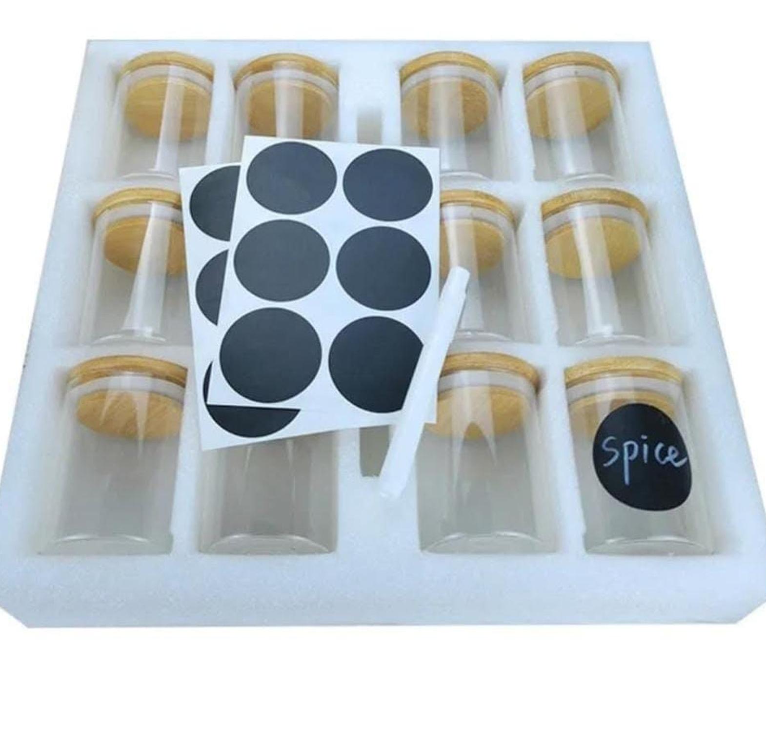 Enhance your kitchen storage with this 12-piece set of glass spice jars, designed for both beauty and functionality. Made from high-quality, transparent glass, these jars allow you to easily identify your spices while adding a sleek, modern touch to your countertop or pantry. The eco-friendly bamboo lids feature airtight seals, keeping your herbs, spices, and seasonings fresh for longer. Perfect for home chefs and spice enthusiasts, this set provides an elegant and practical solution for maintaining an organized kitchen. Whether displayed on a spice rack or neatly stored in drawers, these stylish jars bring harmony and convenience to your cooking space.