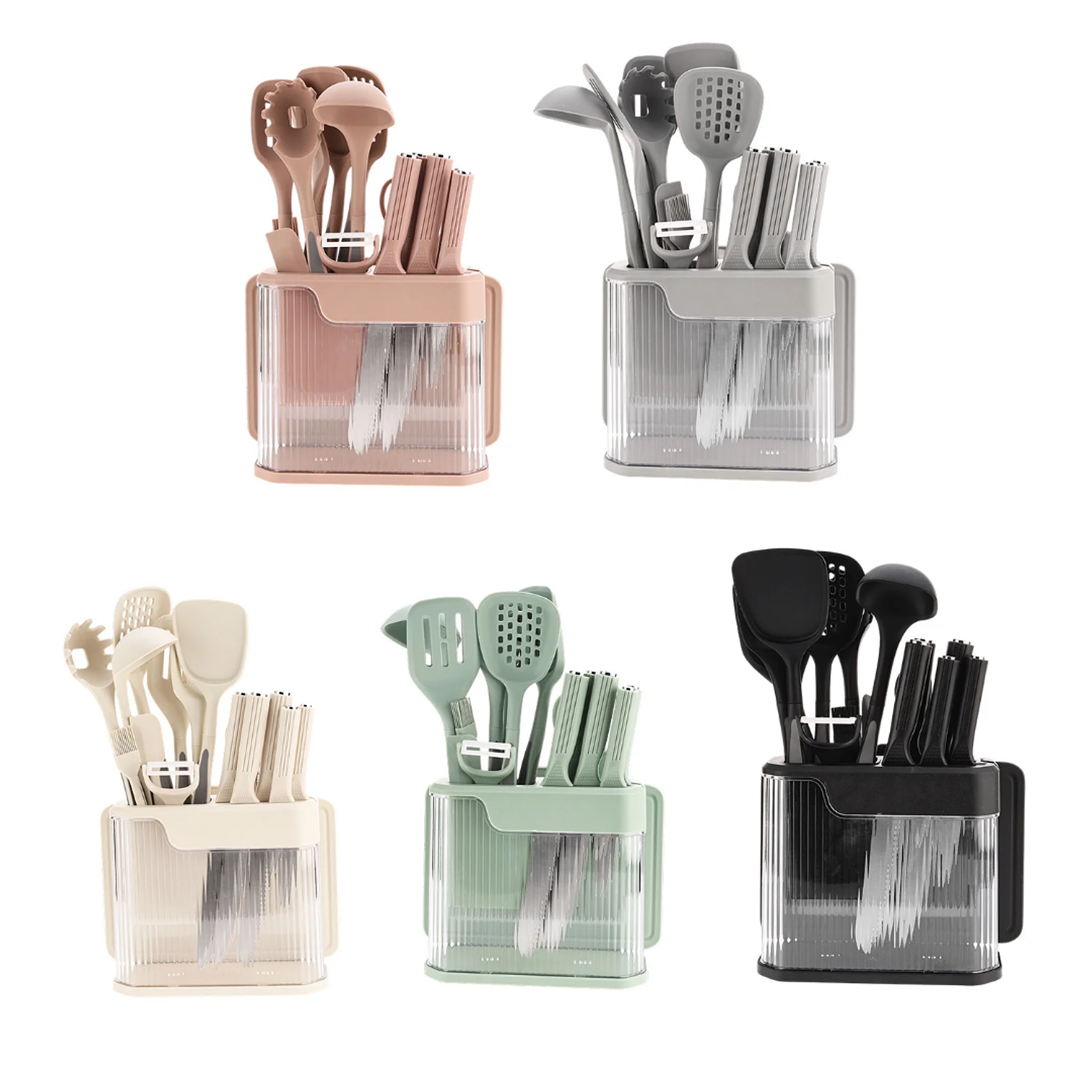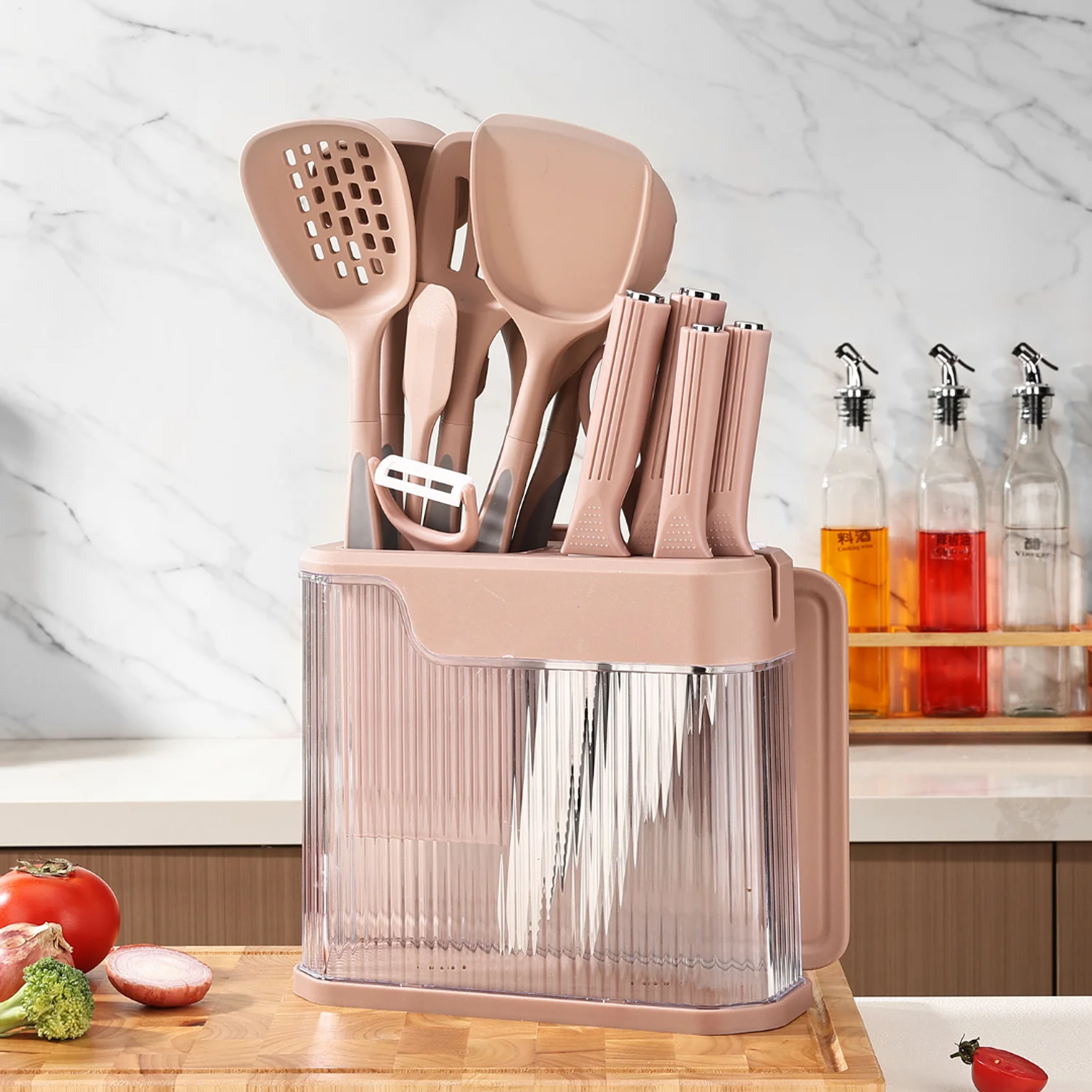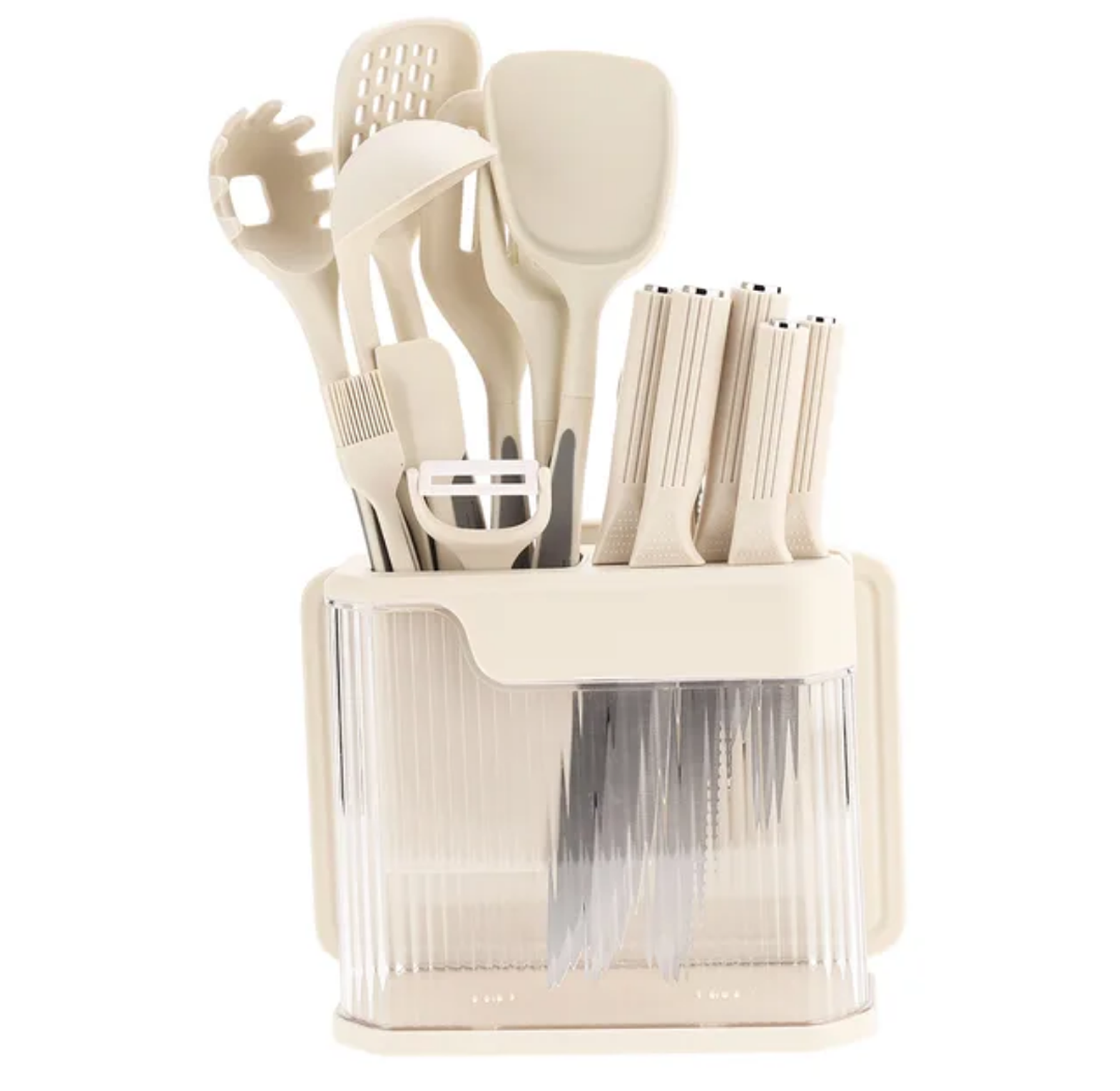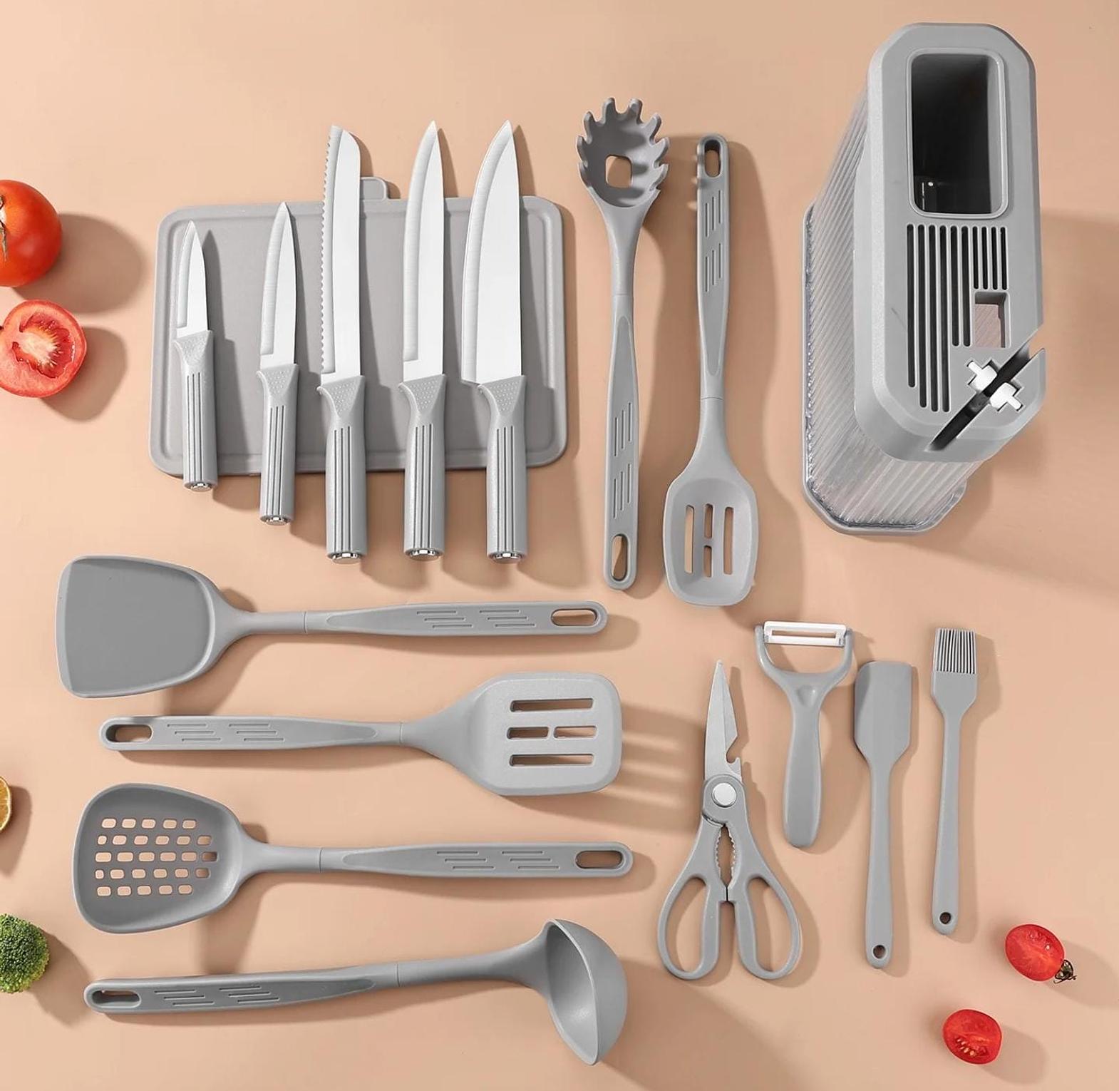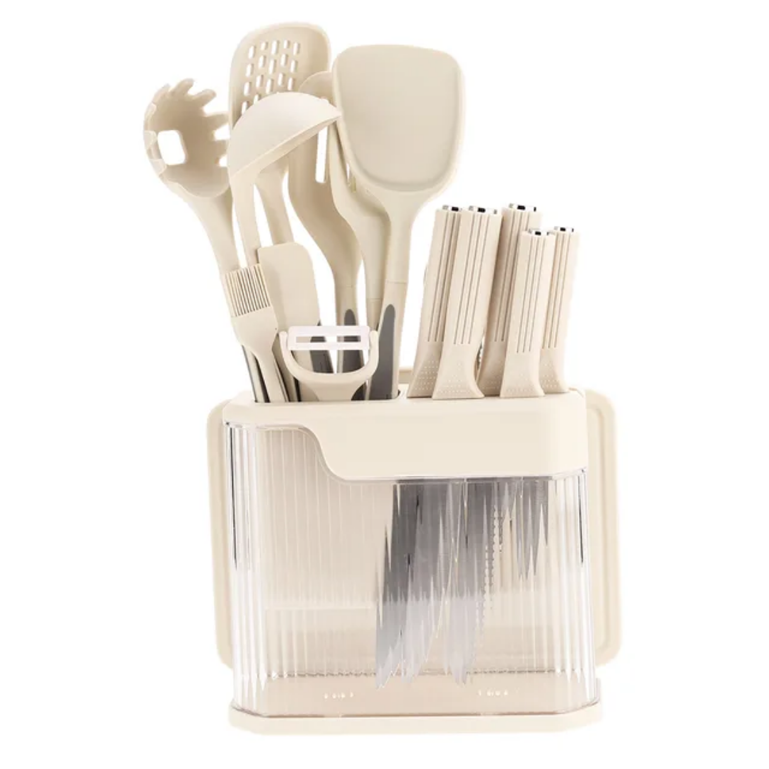 The complete set includes 5 sharp knives, 1 peeler, 1 pair of kitchen scissors, 1 chopping board, 8 silicone cooking spoons/spatulas, and 1 storage holder—giving you everything you need for everyday cooking. It’s perfect for non-stick cookware, easy to clean, long-lasting, and ideal for both home cooks and professionals across Kenya.