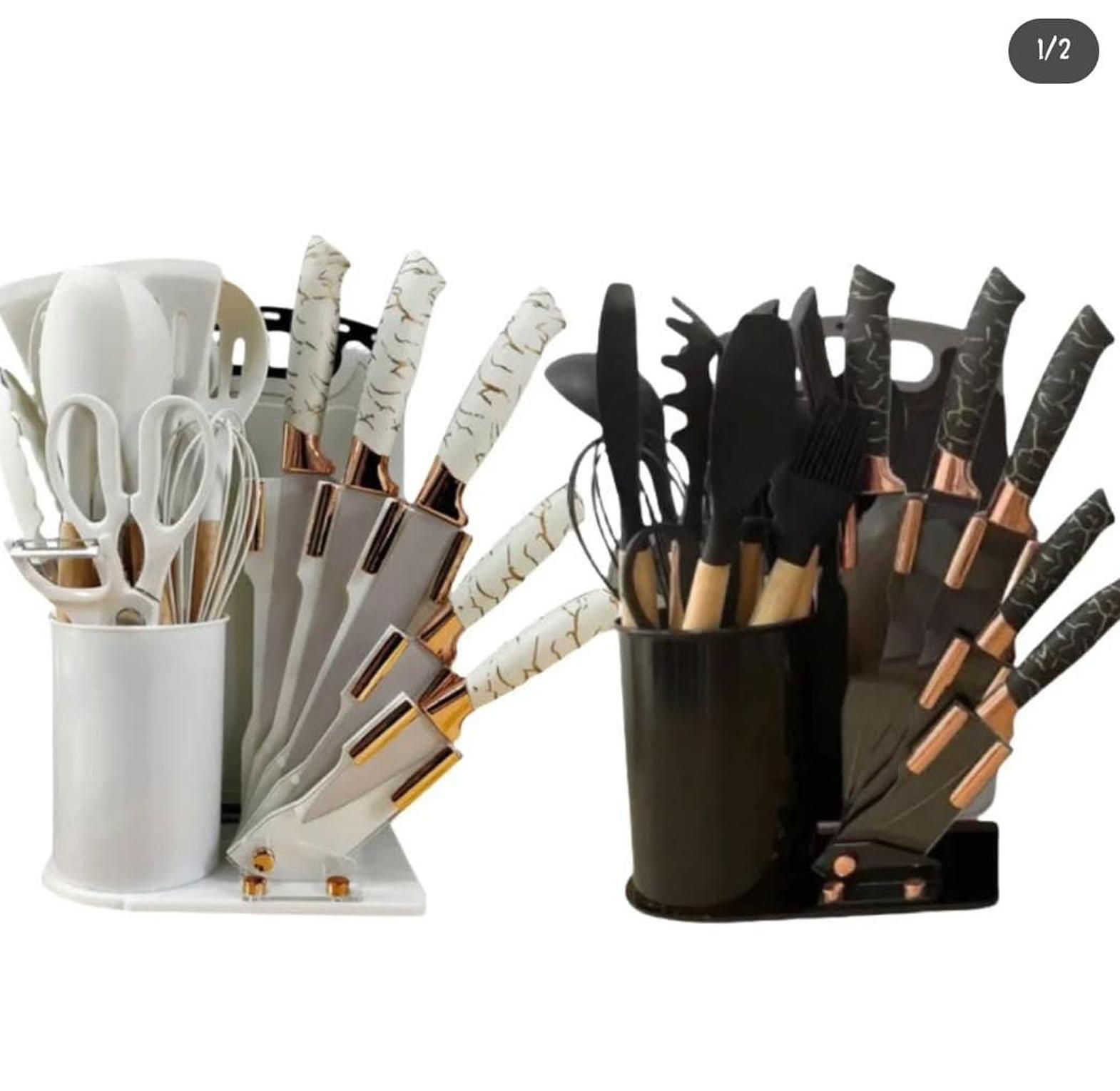 This 19-piece marble effect silicone cooking spoon set, complemented by a knife set, combines contemporary style with practicality, making it an essential addition to your kitchen. The marble-effect silicone spoons and spatulas offer a modern, sophisticated look while being heat-resistant and gentle on cookware, perfect for use with non-stick pans without causing scratches. The set includes various utensils, such as spoons, spatulas, tongs, and a turner, ensuring you have all the tools you need for stirring, serving, and cooking. Paired with the high-quality knife set, designed for precision and comfort, this collection makes meal preparation effortless and stylish. The ergonomic handles provide a secure grip, making each utensil easy to use, while the elegant marble design adds a luxurious touch to your kitchen. This set is perfect for both everyday cooking and entertaining, offering both beauty and functionality in one package.