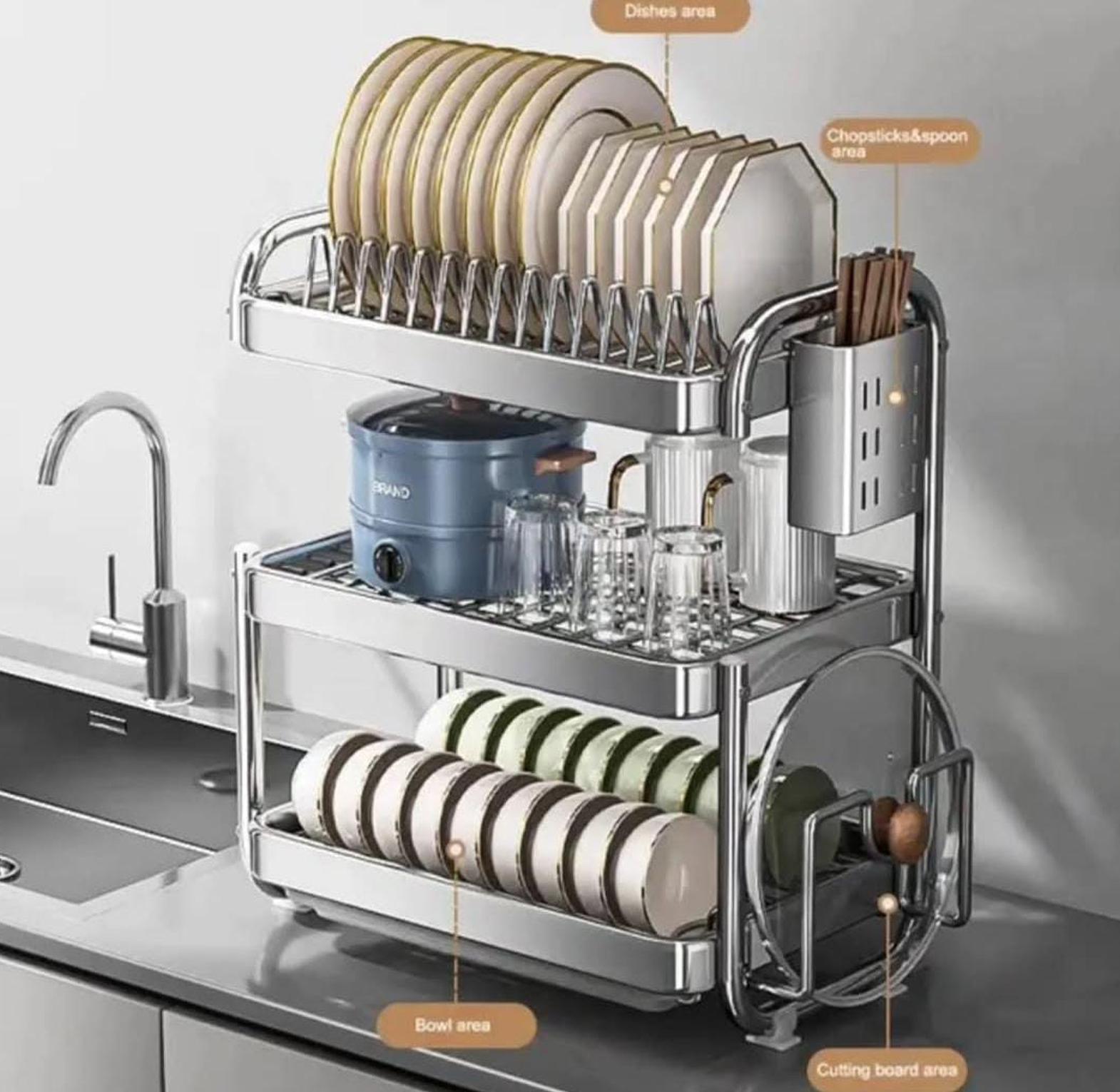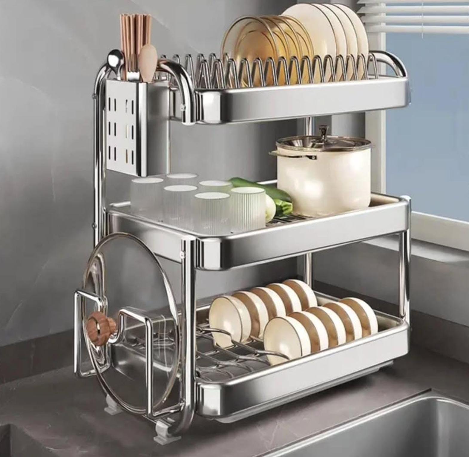 Crafted from high-quality 201SS material and coated with a sleek chrome finish, this 3-tier kitchen dish rack offers both durability and style. Its spacious design accommodates a variety of dishes, cups, and utensils, keeping your kitchen organized and clutter-free. The practical drain tray ensures that excess water drains away, keeping your countertops dry and tidy. Ideal for small or large kitchens, this dish rack provides three levels of storage, maximizing space while maintaining a compact footprint. With its modern design and practical functionality, it’s the perfect addition to any home looking for a reliable, stylish dish-drying solution.