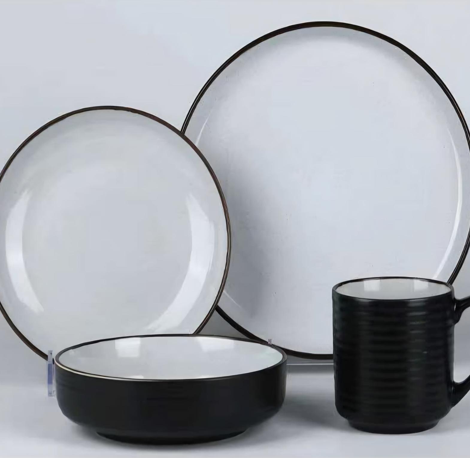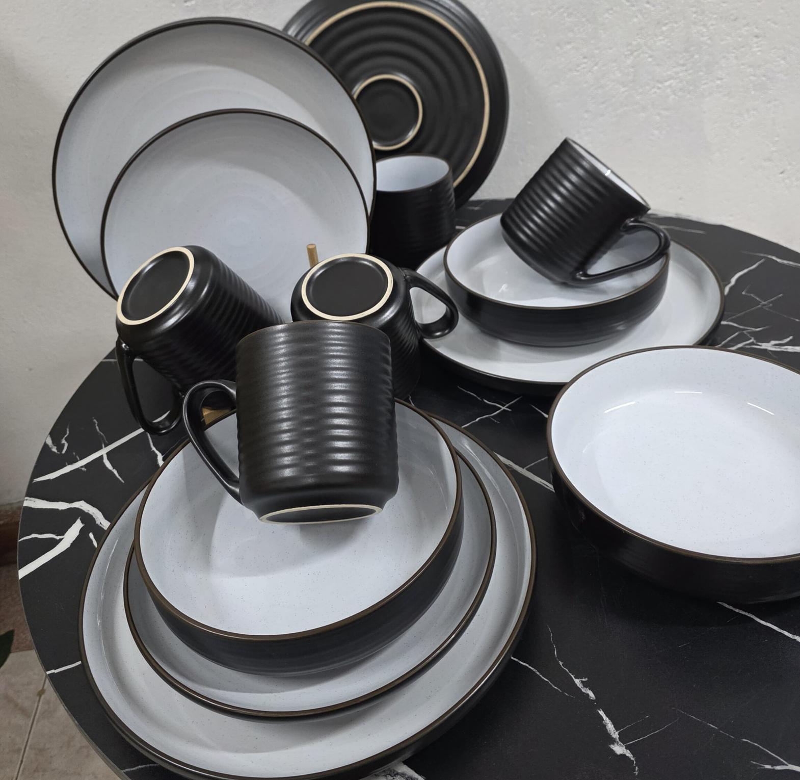 Elevate your dining experience with this 24-Piece Black & White Ceramic Dinner Set—a perfect blend of modern design and everyday functionality. The set includes 6 dinner plates, 6 side plates, 6 deep bowls, and 6 mugs, all crafted with a sleek matte black exterior and a clean, glossy white interior. This stylish color contrast complements both casual and formal table settings, making it suitable for daily meals or special gatherings. The ceramic material ensures durability, chip resistance, and easy cleaning. Whether you're hosting guests or upgrading your home essentials, this set adds a sophisticated touch to any kitchen or dining space.