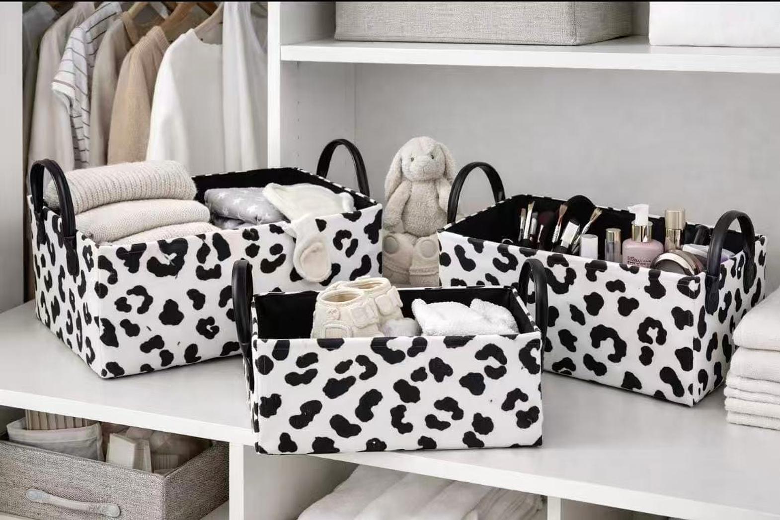 Keep your home neat and stylish with this 3-piece animal print storage basket set, designed for versatile home organization and storage. Made with durable fabric and reinforced with sturdy handles, these baskets are ideal for organizing toys, clothes, towels, baby essentials, cosmetics, and household items. The trendy animal print design adds a modern decorative touch while keeping your spaces clutter-free. Perfect for use in wardrobes, shelves, nurseries, bedrooms, bathrooms, and living areas.