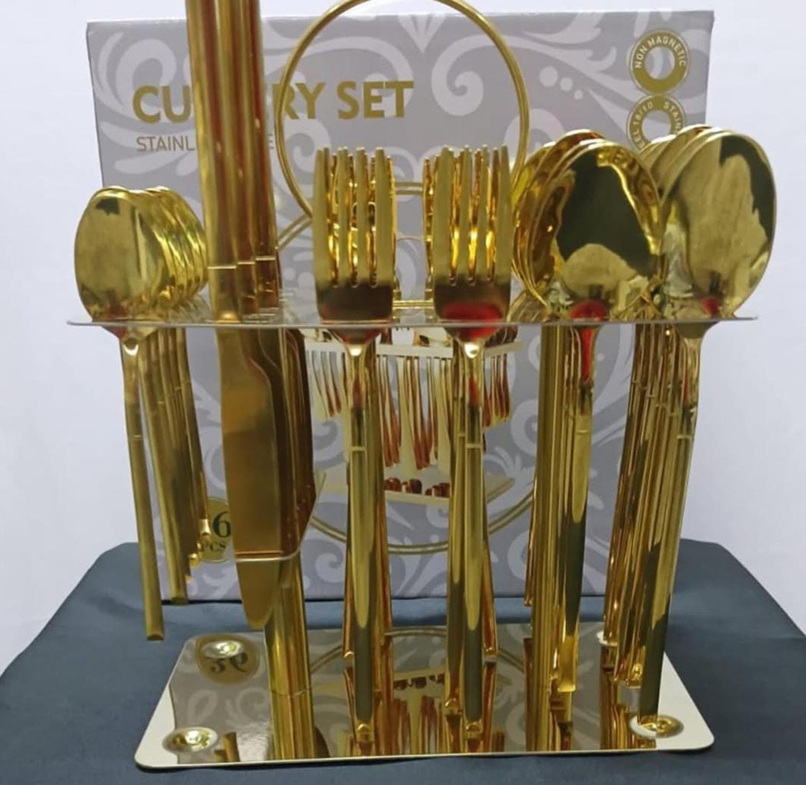 Our 36-piece quality golden cutlery set is the perfect fusion of elegance, craftsmanship, and practicality, making it an ideal addition to any modern or traditional table setting. Made from premium stainless steel with a striking golden finish, each piece offers a smooth, well-balanced grip and exceptional resistance to rust, tarnish, and daily wear. The set includes full place settings for six—featuring dinner forks, knives, spoons, dessert forks, and teaspoons—ensuring you’re well-equipped for family dinners, entertaining guests, or celebrating festive occasions. Its opulent gold tone adds a touch of refinement and charm to every meal, whether casual or formal. Built to impress and made to last, this cutlery set transforms every table into a statement of taste and sophistication.