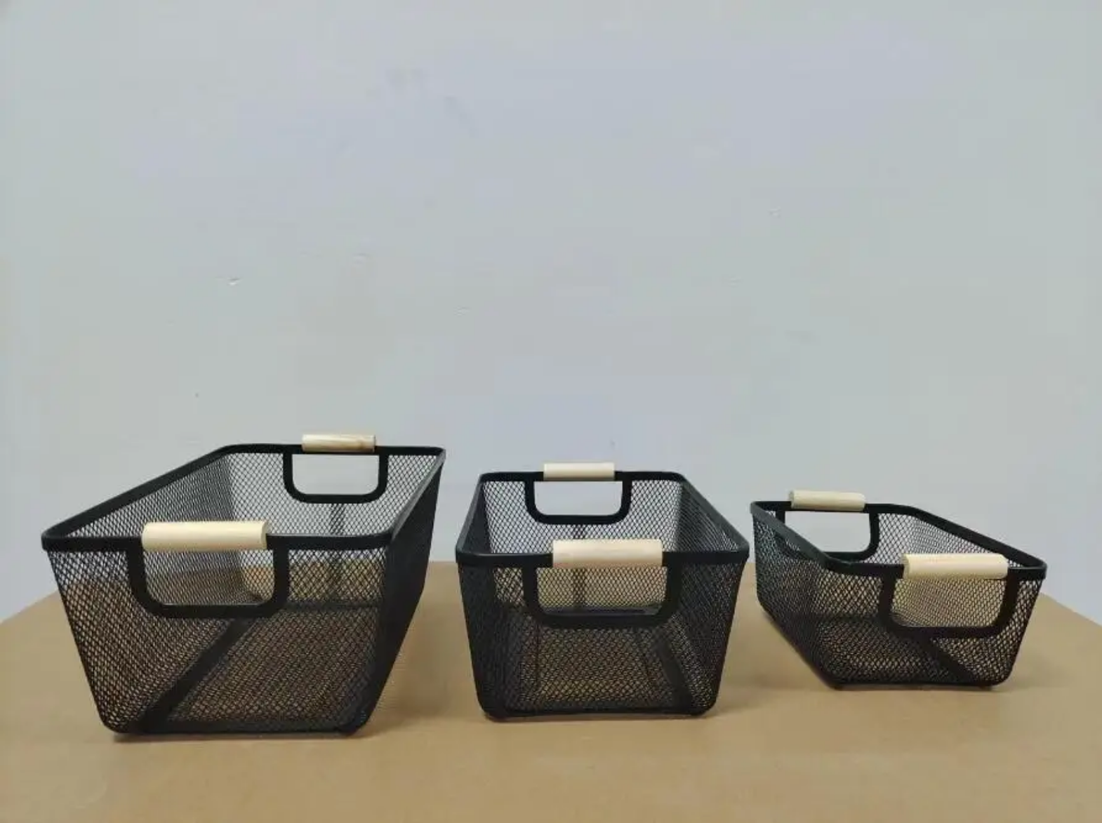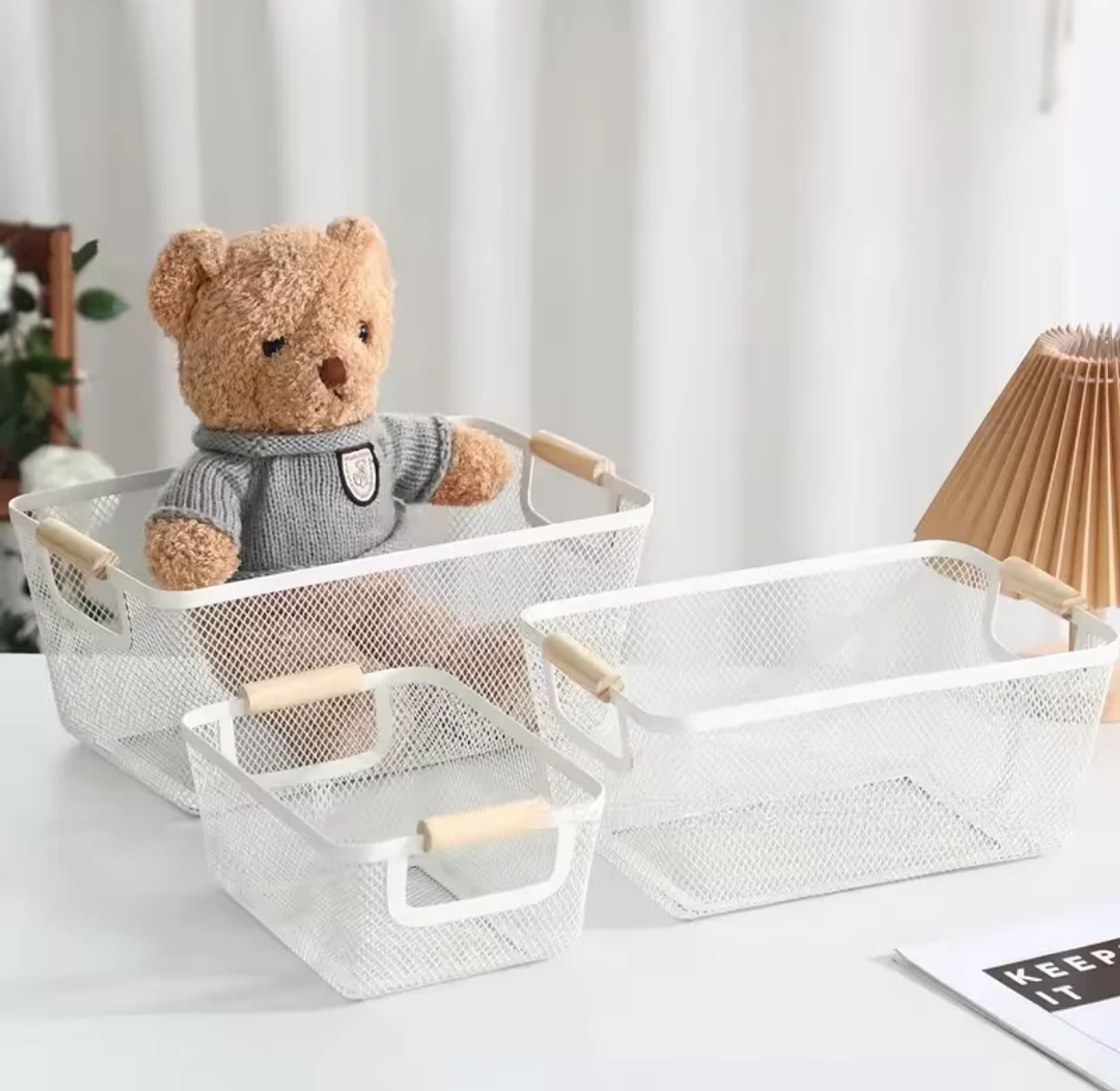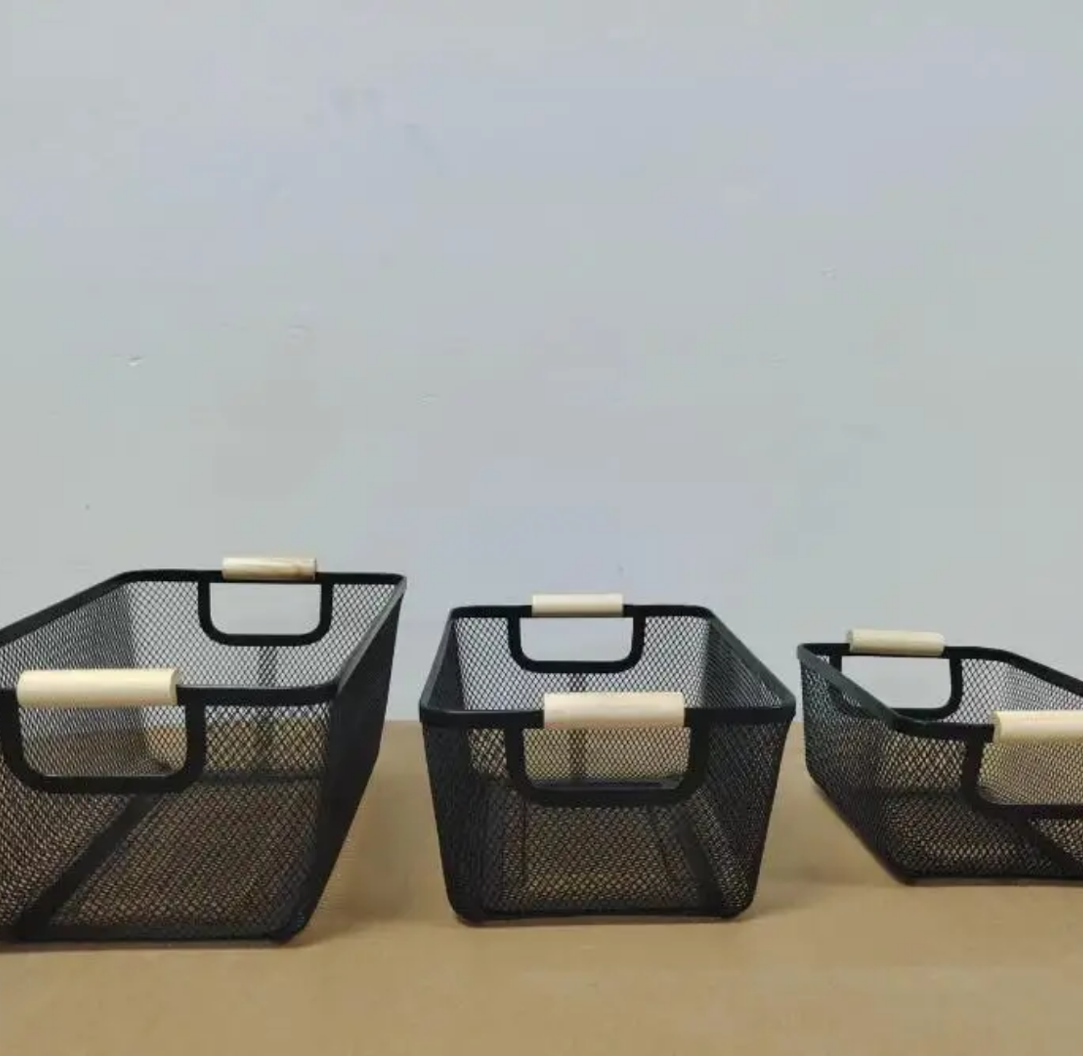 Bring order and style to your home with this 3-piece Mesh Organizing Basket Set. Designed with a sturdy mesh body and smooth wooden handles, these baskets are both practical and elegant. Perfect for organizing toiletries, pantry items, office supplies, or even small laundry essentials.