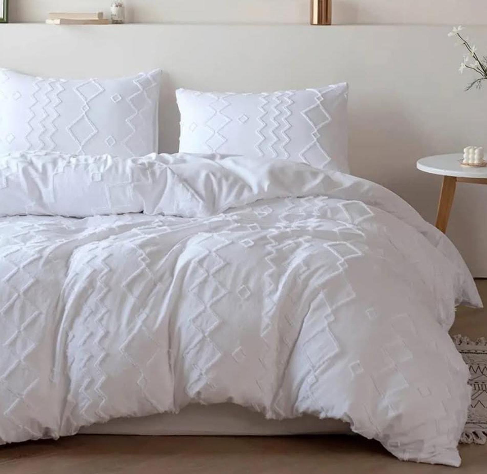 Our 3-piece tufted duvet cover set is designed to elevate your bedroom décor with a subtle yet sophisticated touch. Made from soft, breathable fabric, each piece in the set—including one duvet cover and two matching pillow shams—is adorned with delicate tufted patterns that add depth and charm without overwhelming your space. The high-quality material ensures a smooth feel against the skin while maintaining durability through frequent use and washing. The cover includes secure closures and interior ties to keep your insert in place, combining function with elegance. Ideal for those who appreciate classic textures and clean lines, this set blends comfort and design, making it a versatile choice for both modern and traditional interiors.