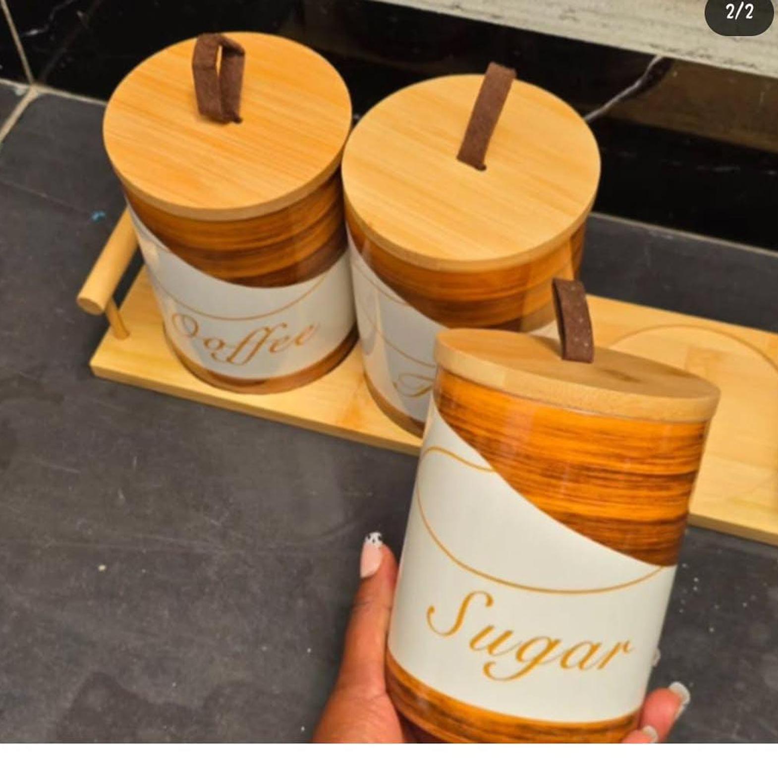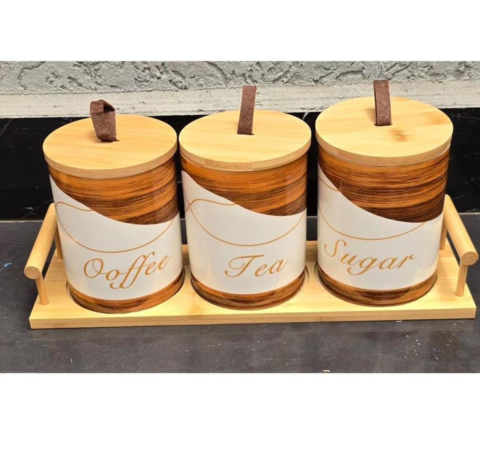 A stylish 3-piece ceramic canister set with a wooden base, perfect for elegant and organized kitchen storage.