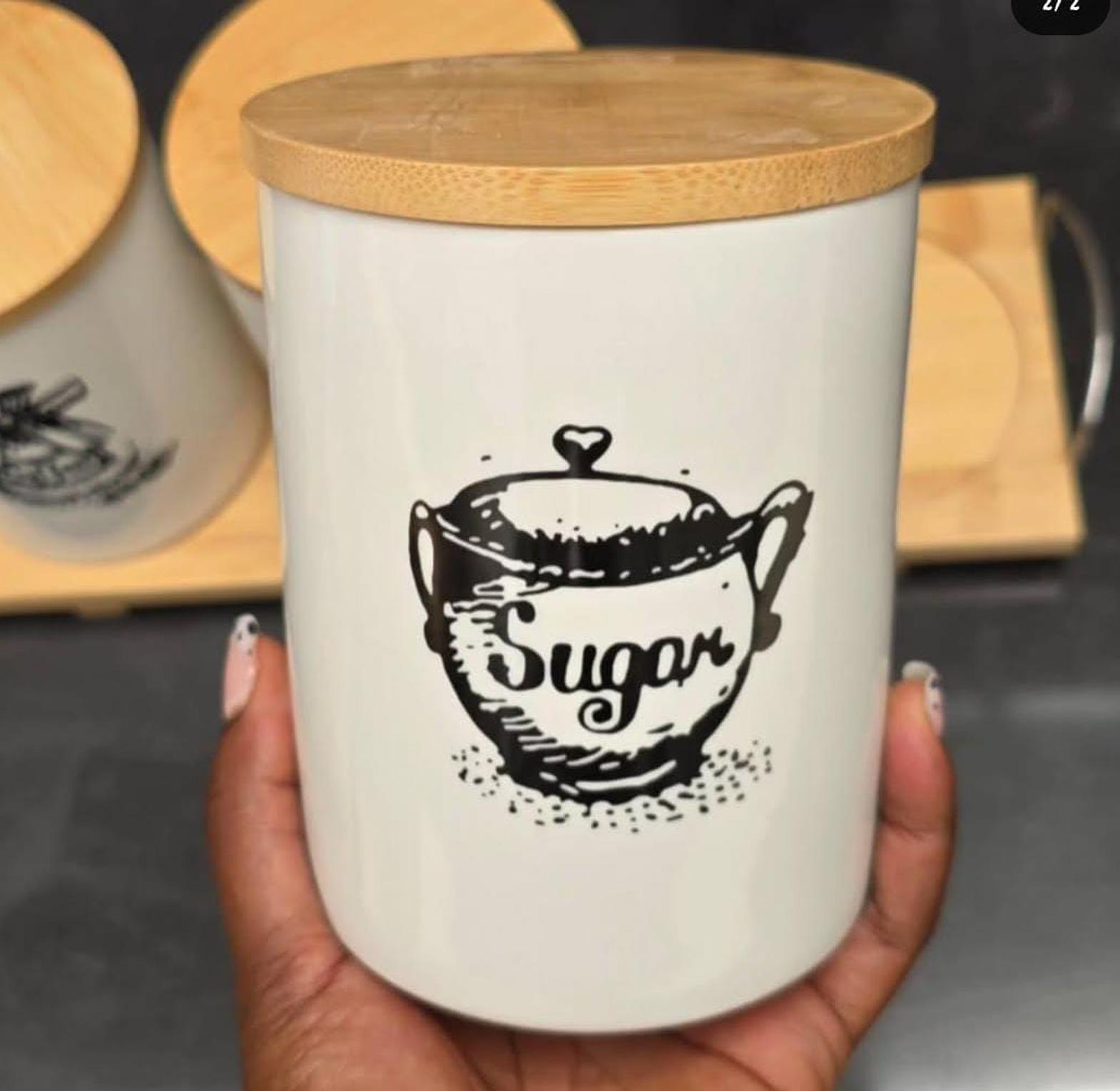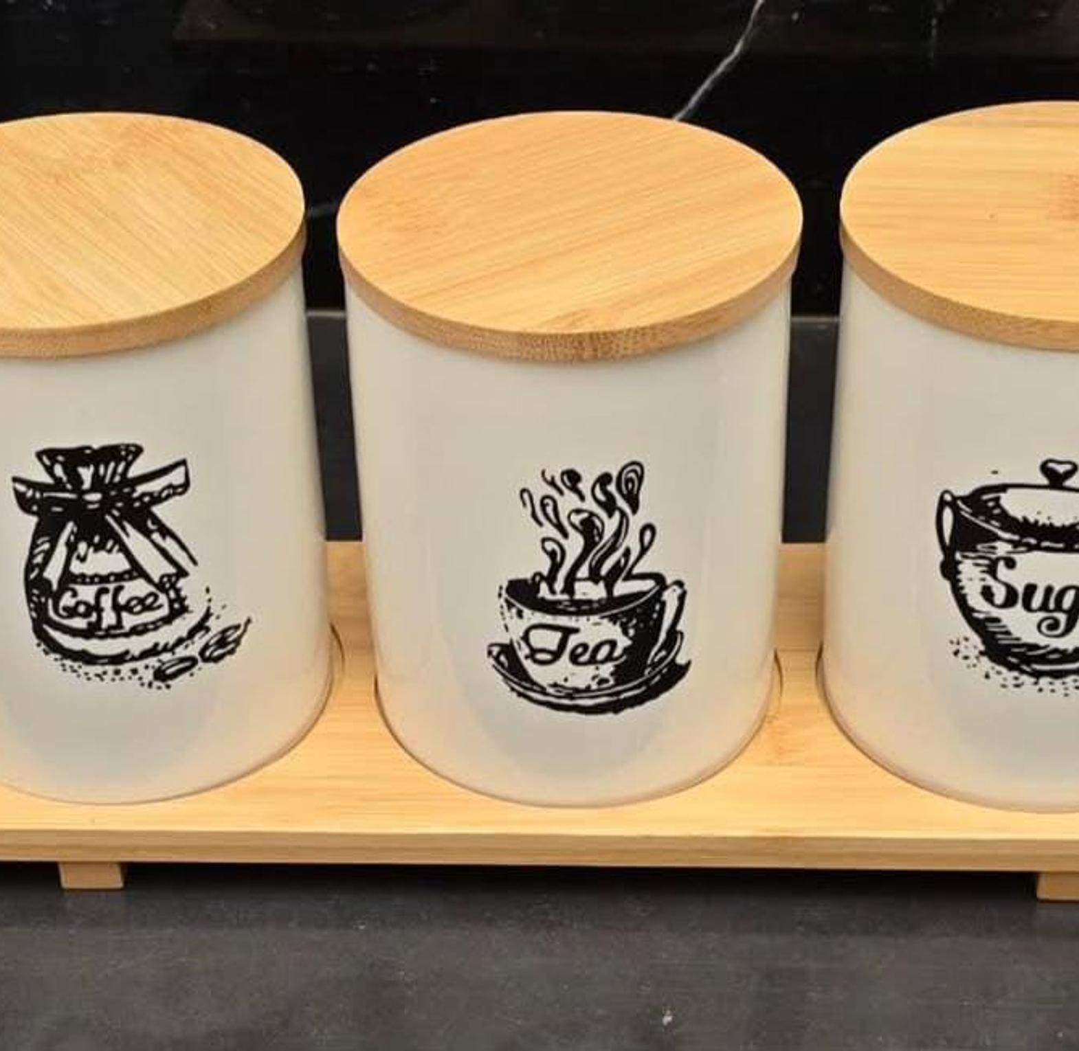 A stylish 3-piece ceramic canister set with a wooden base, perfect for elegant and organized kitchen storage.