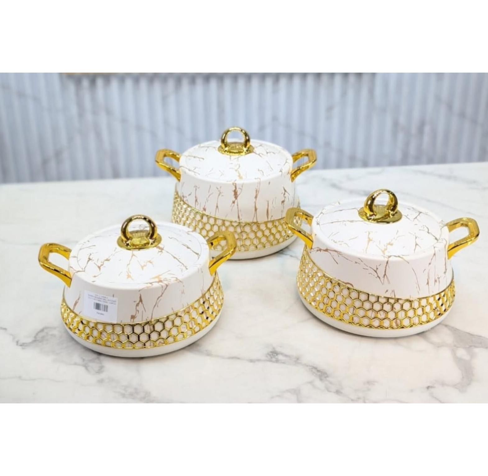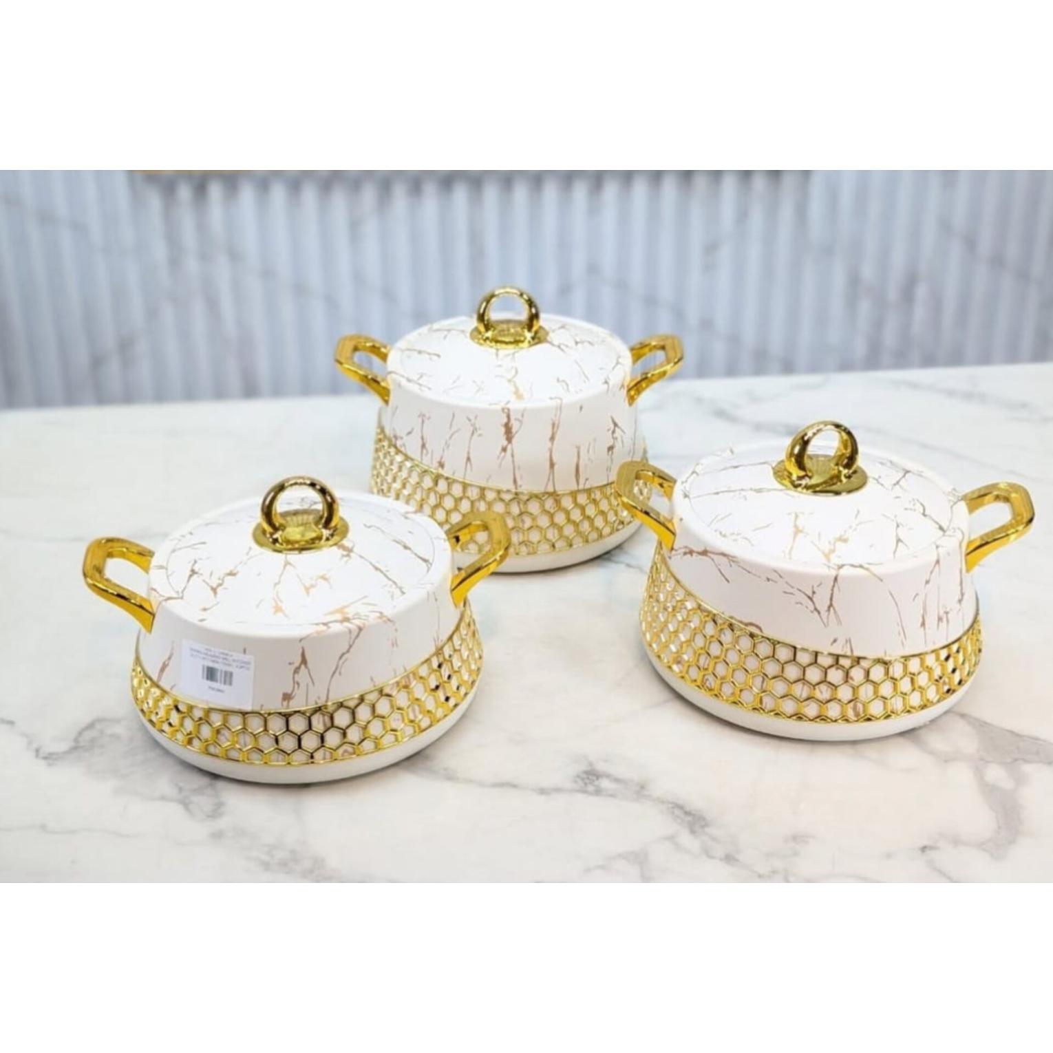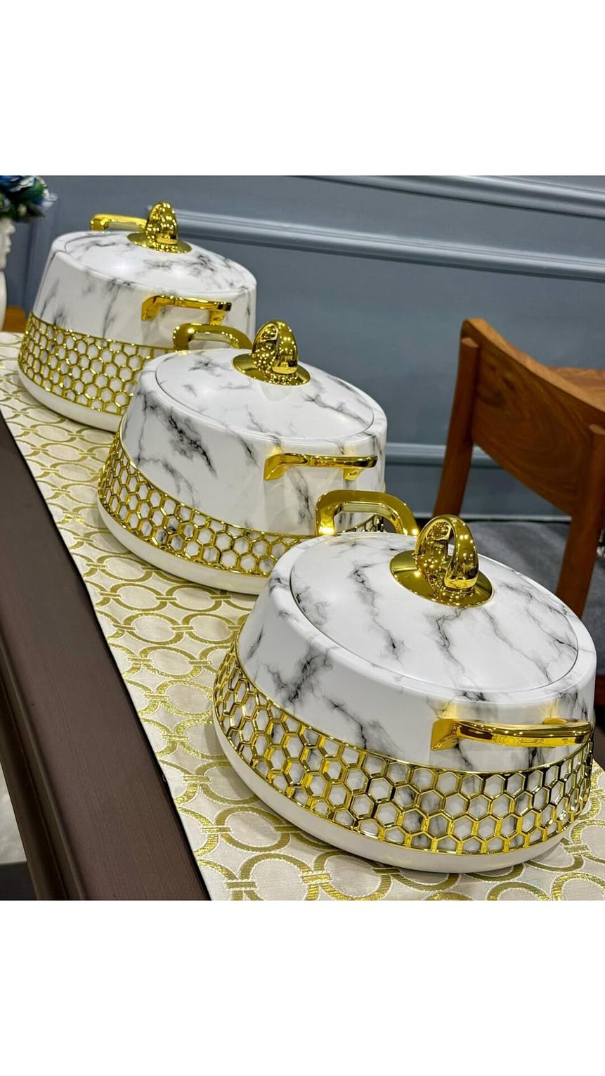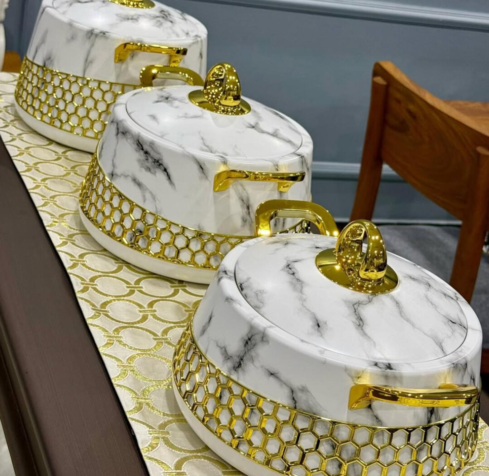 Add a touch of luxury to your dining experience with this 3-piece insulated hotpot casserole set, designed to keep your food warm and fresh for hours. Each set includes 2L, 2.5L, and 3L capacity hotpots, perfect for serving family meals or entertaining guests. The hotpots feature durable insulation, stainless steel inner lining for hygiene, and a stunning design with golden accents that make them a true table centerpiece. Available in white, black, marble grey, and marble brown, these hotpots combine functionality with elegance, making them ideal for both everyday use and special occasions.