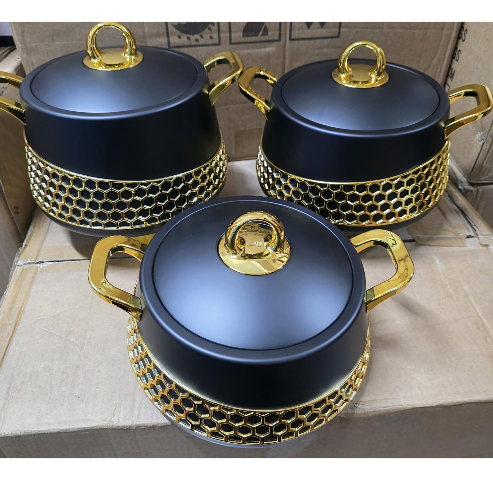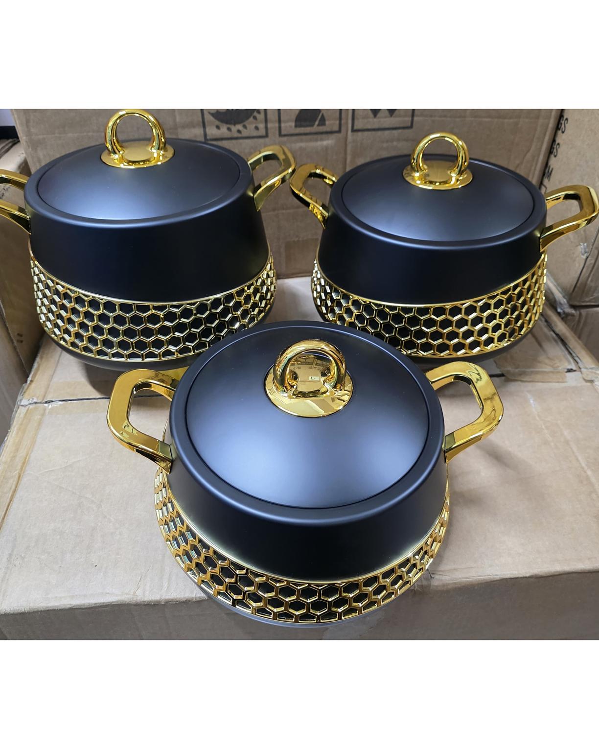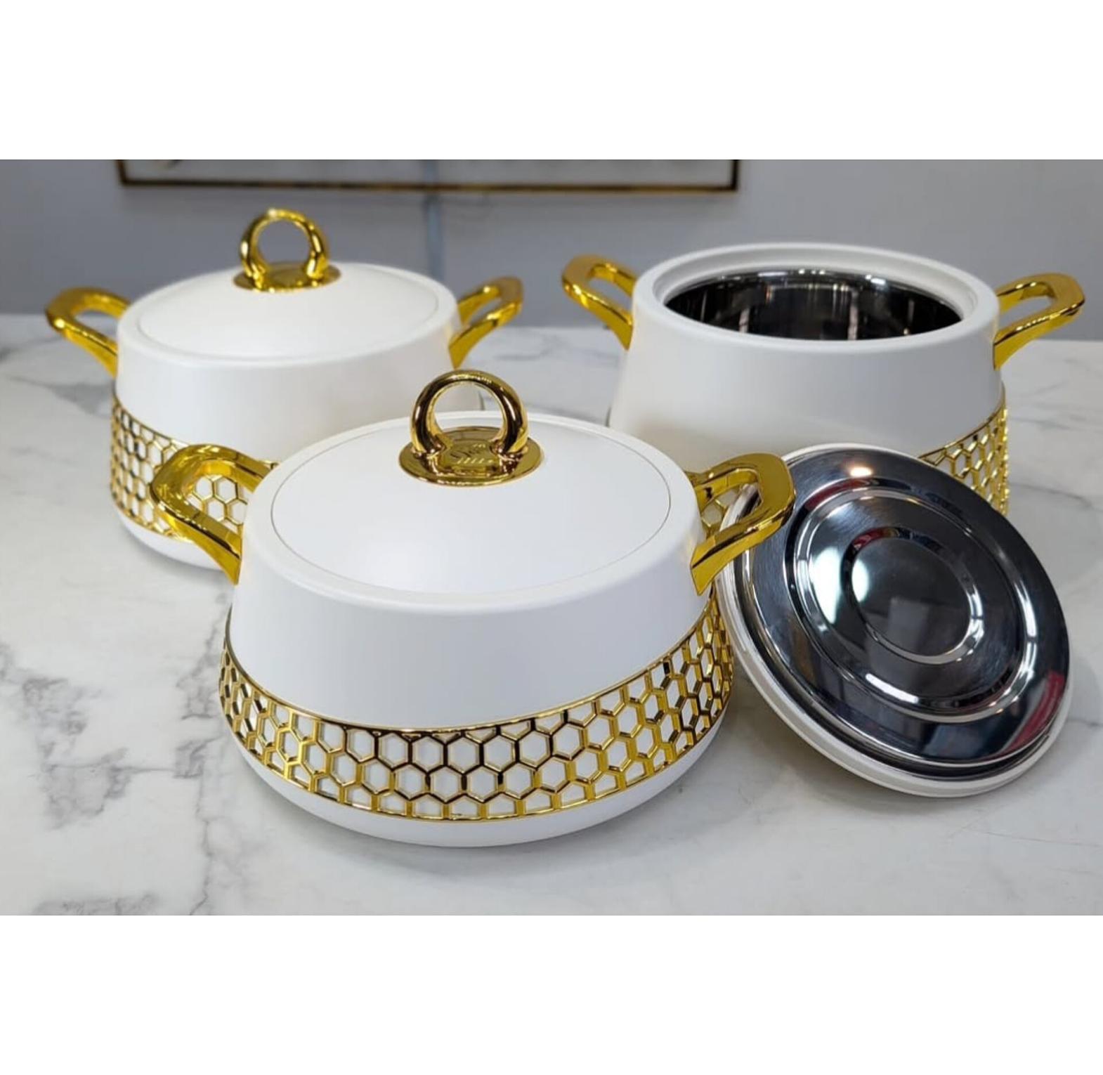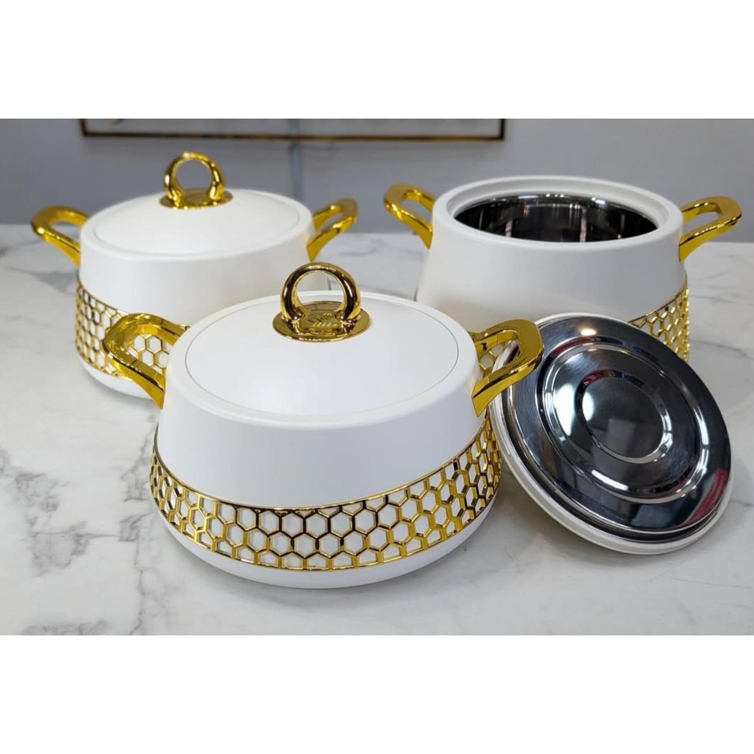 Add a touch of luxury to your dining experience with this 3-piece insulated hotpot casserole set, designed to keep your food warm and fresh for hours. Each set includes 2L, 2.5L, and 3L capacity hotpots, perfect for serving family meals or entertaining guests. The hotpots feature durable insulation, stainless steel inner lining for hygiene, and a stunning design with golden accents that make them a true table centerpiece. Available in white, black, marble grey, and marble brown, these hotpots combine functionality with elegance, making them ideal for both everyday use and special occasions.