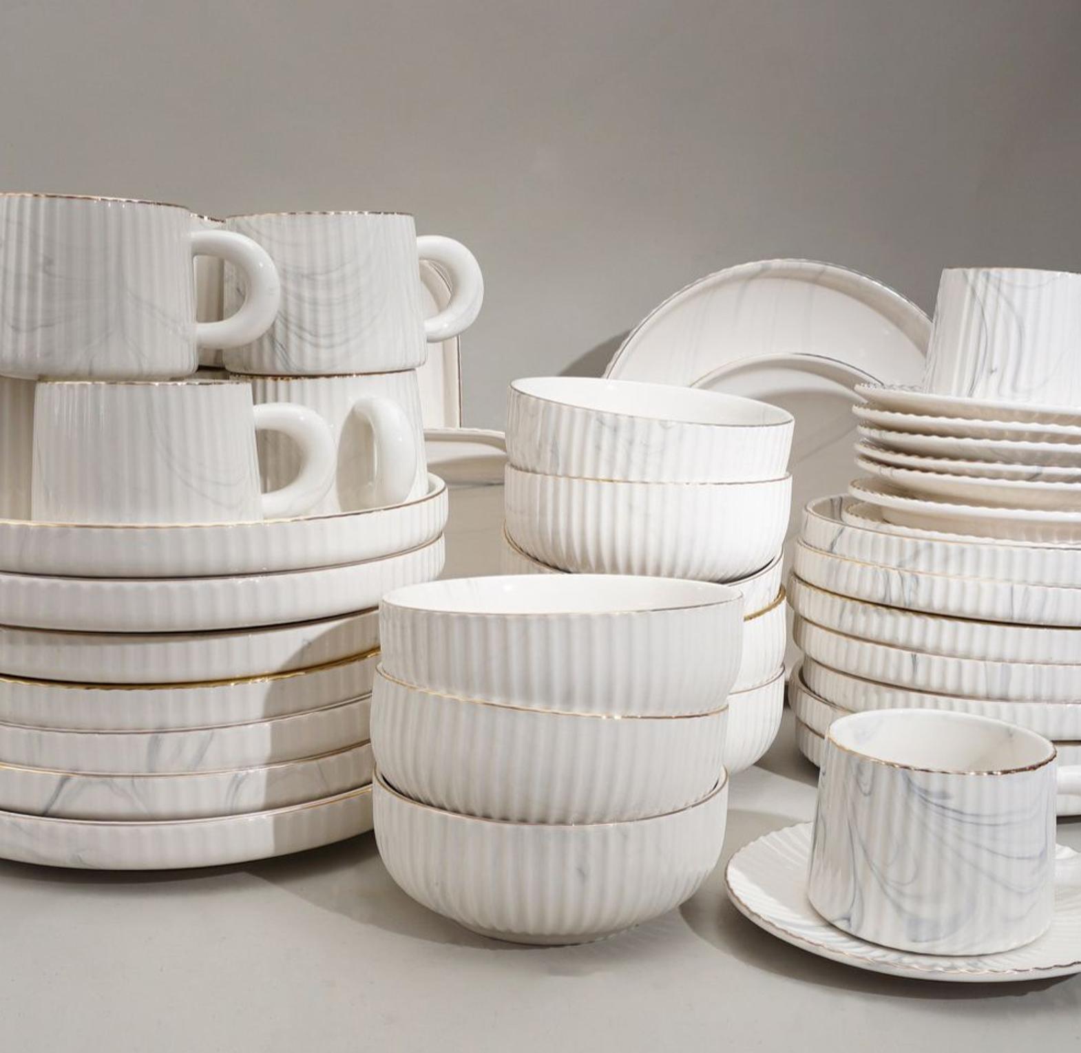 Elevate your dining experience with this 42pcs European-style porcelain dinner set, crafted from premium porcelain for a blend of durability and elegance. The set includes 8 dinner plates, 8 side plates, 8 soup bowls, 8 mugs, 8 cup saucers, and 2 rectangular platters, providing everything you need for both daily meals and hosting special occasions. Its refined European design brings timeless charm to your table setting, while the high-quality finish ensures long-lasting beauty.