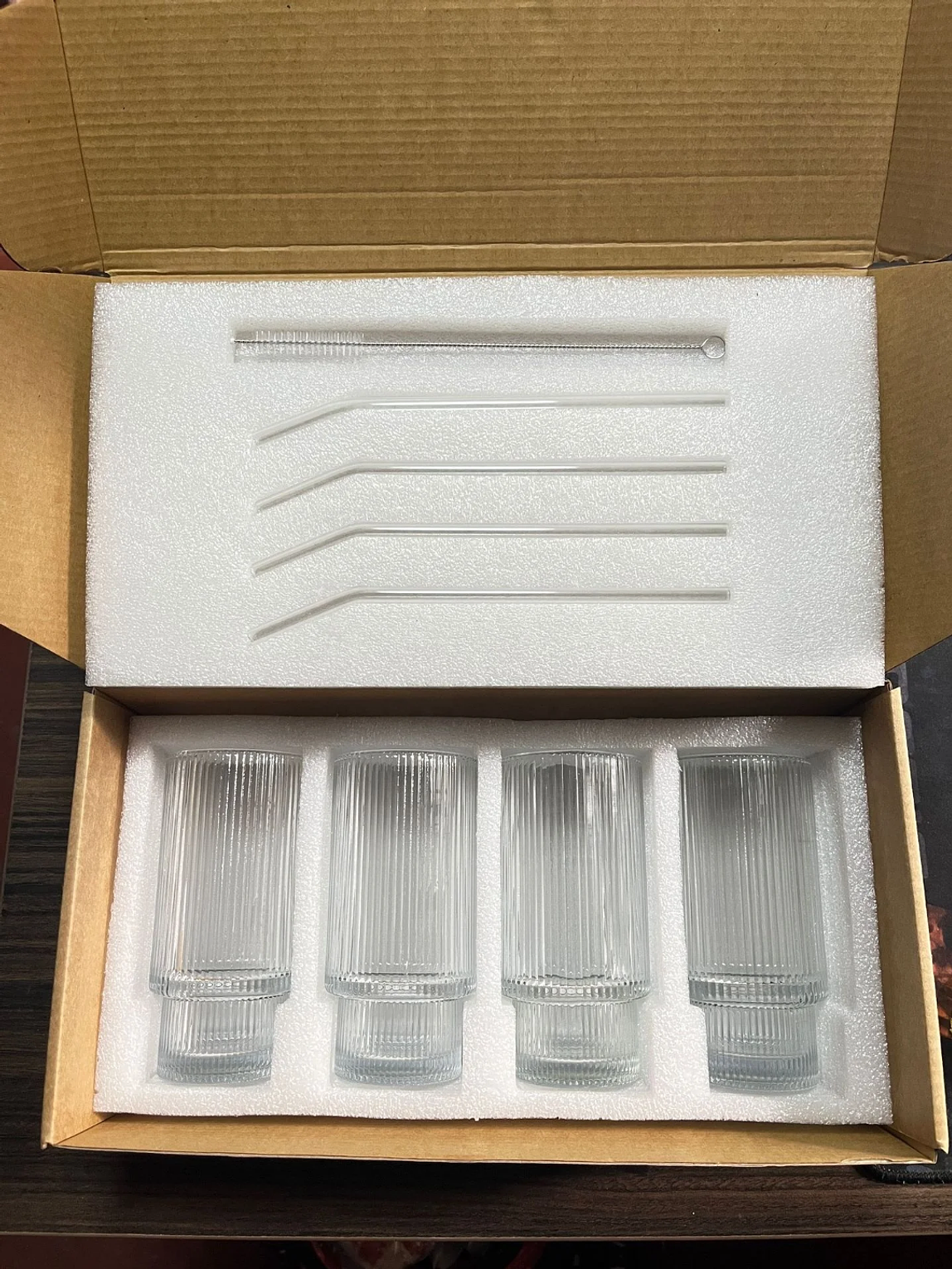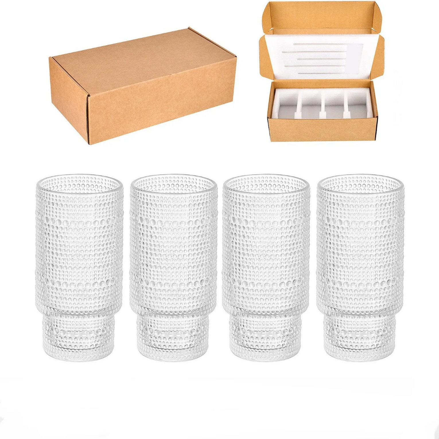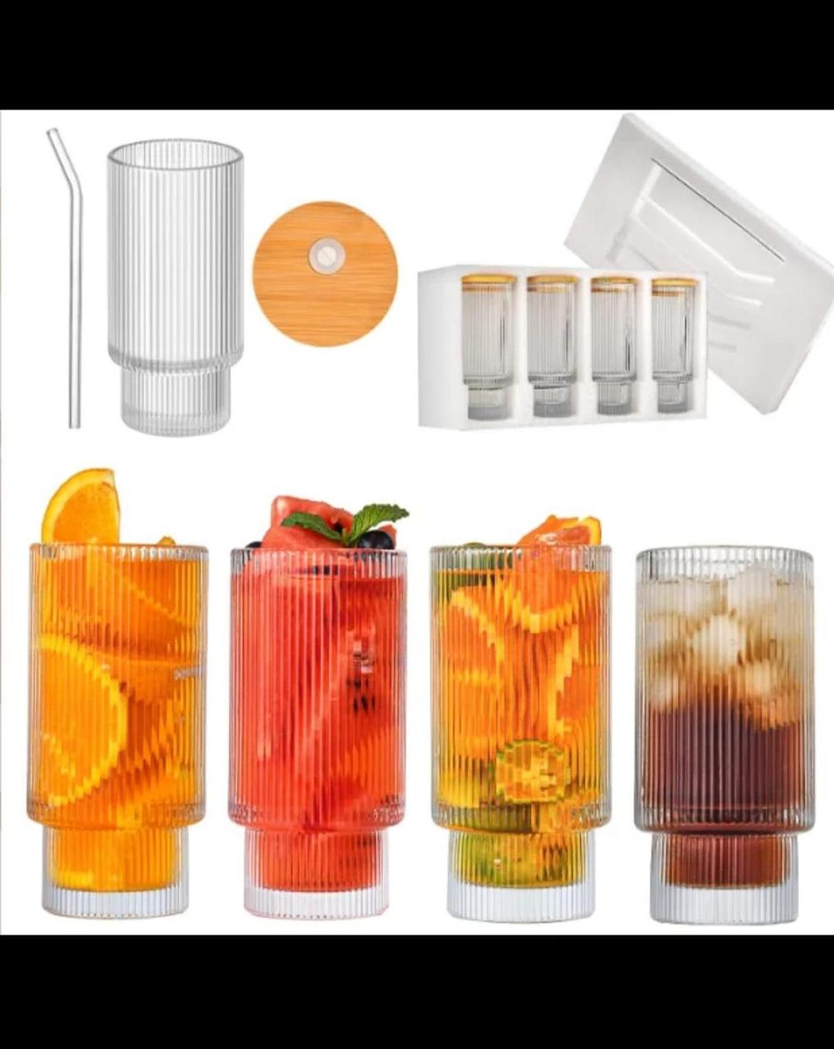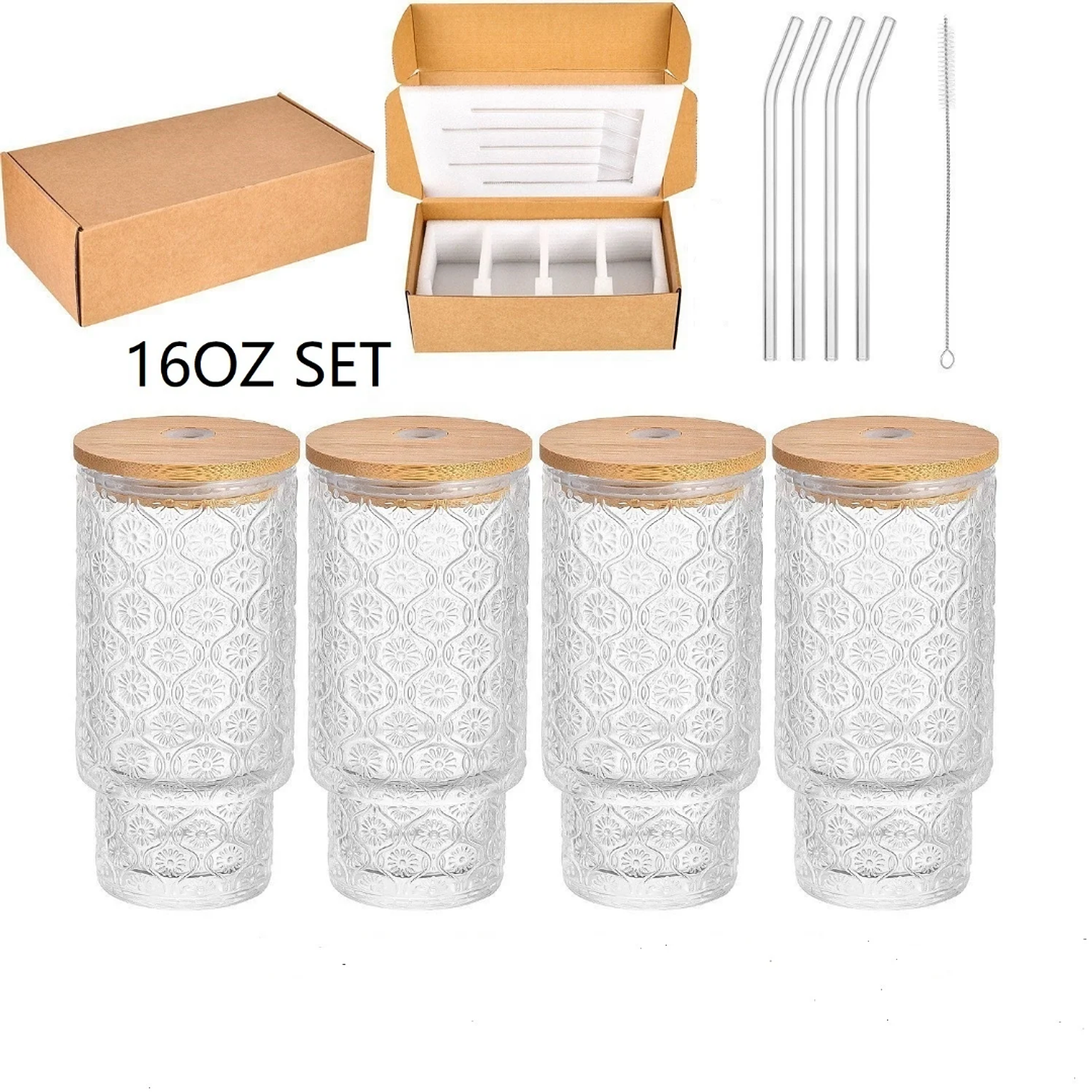 Add timeless charm to your drinkware collection with this 4-piece set of vintage embossed glass cups. Each cup features intricate detailing, paired with natural bamboo lids and reusable straws for a touch of elegance and sustainability. Complete with a cleaning brush, these versatile cups are perfect for juices, smoothies, iced coffee, or cocktails—making them ideal for both everyday use and stylish entertaining.