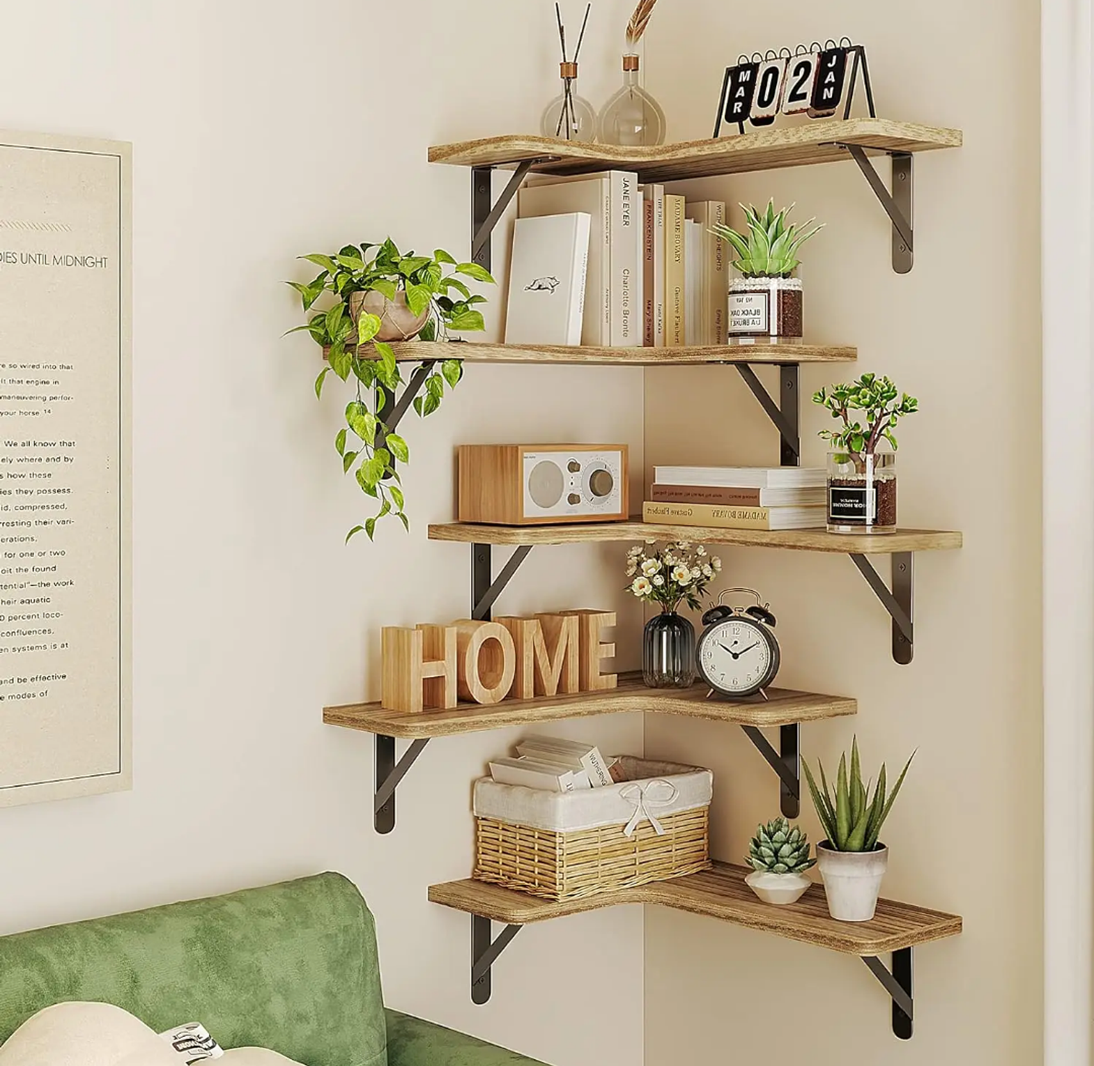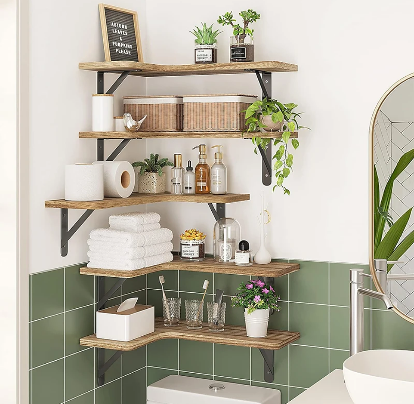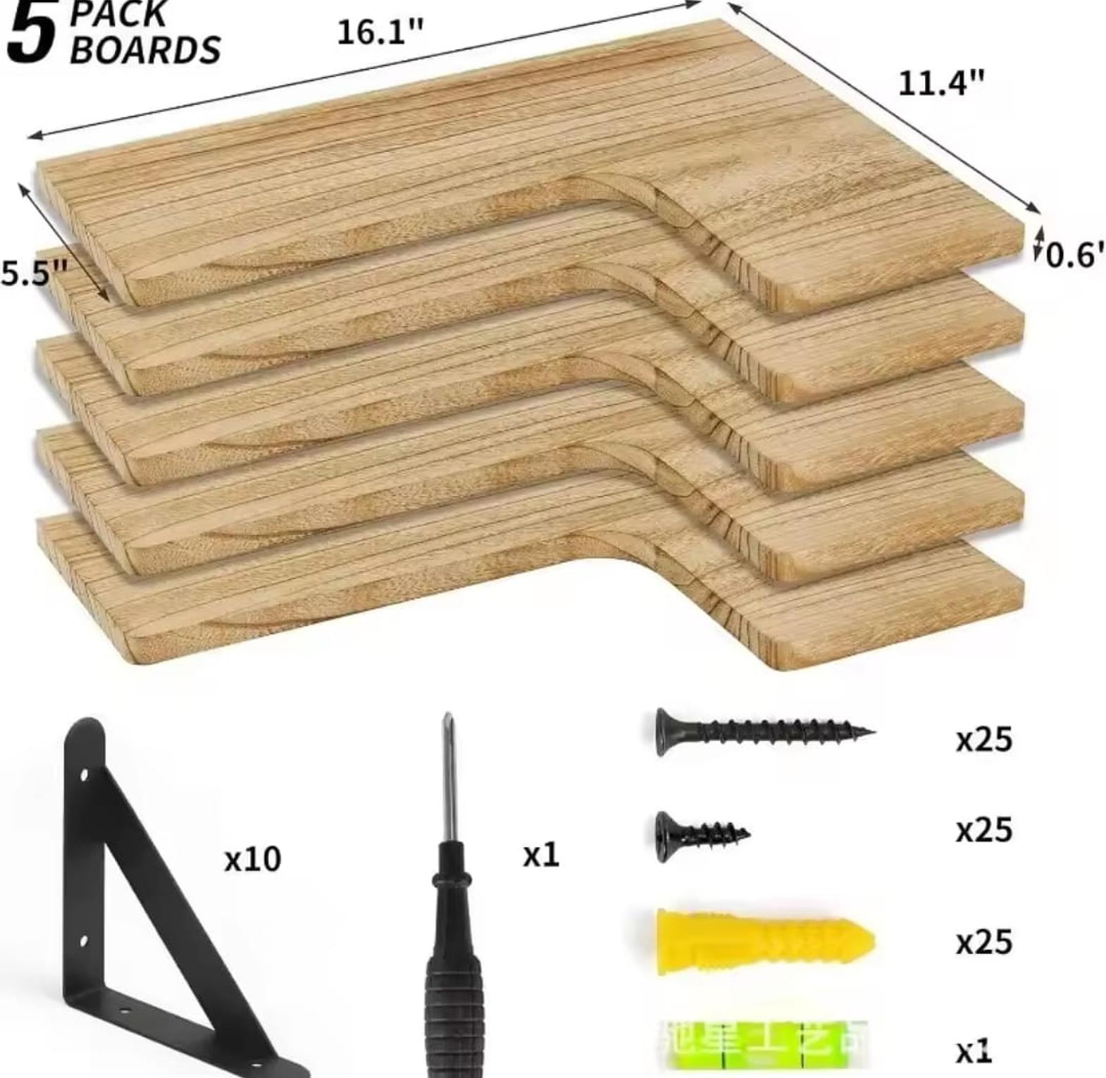 Maximize your vertical space with this 5-Piece Wooden Corner Floating Shelf Set—designed to fit snugly into corners for an efficient and decorative storage solution. Made from durable wood with a natural finish, these shelves add warmth and function to any room, whether it's your bathroom, kitchen, or living area. Each piece is crafted to hold essentials like toiletries, spice jars, décor items, or small plants. The set includes all mounting hardware, and installation is done securely via drilling to ensure strength and stability. Perfect for organizing while enhancing your interior style. Please refer to the last slide for full package details.