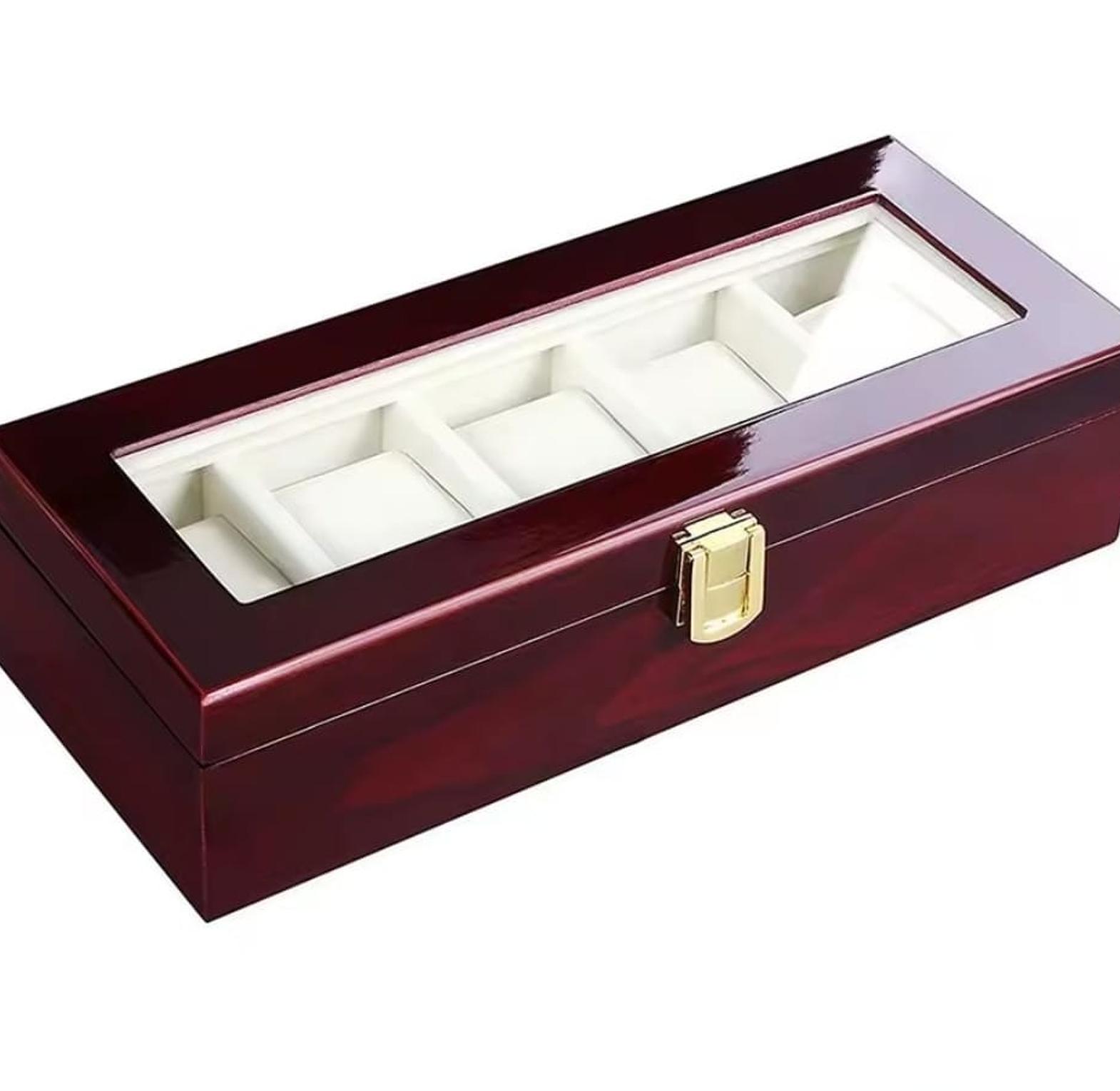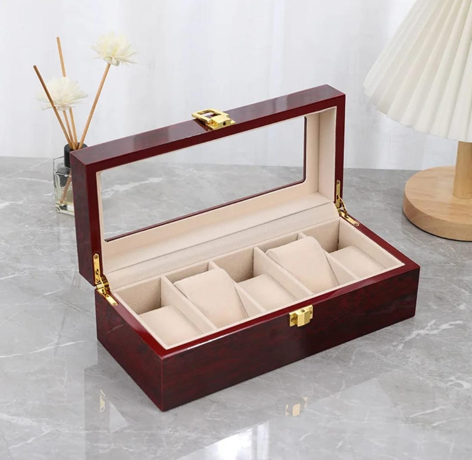 Showcase and protect your timepieces in style with this 5-slot glossy wooden watch holder. Designed with a smooth polished finish and a transparent glass top, it allows you to display your watches while keeping them dust-free and secure. The soft cushioned interior protects your watches from scratches and damage.