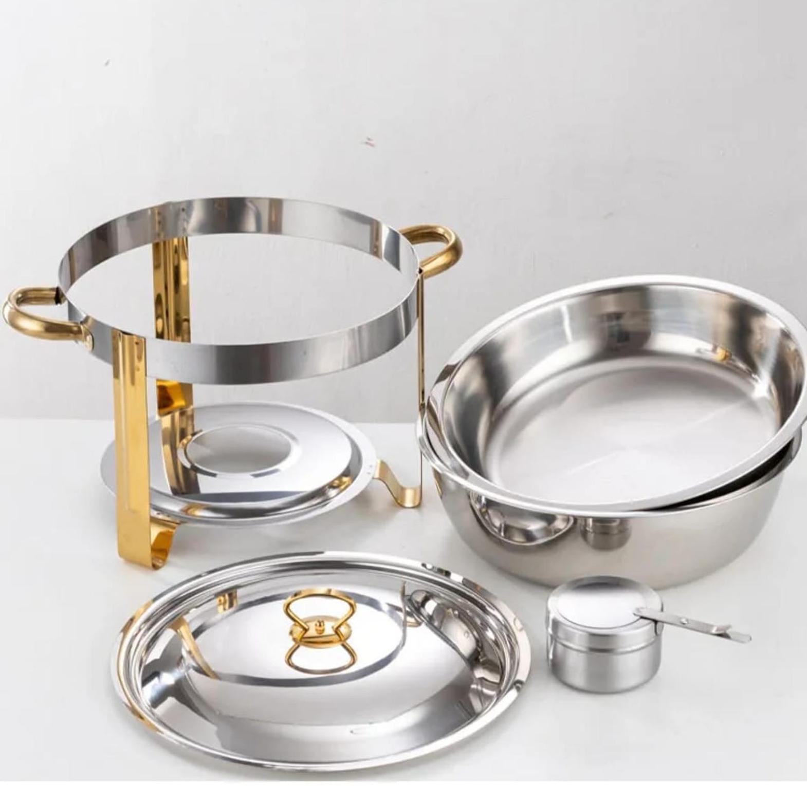 Elevate your dining and serving experience with the 5-Litre Elegant Stainless Steel Chafing Dish with Golden Accents, designed to bring both functionality and sophistication to your table. Crafted from premium-grade stainless steel, this chafing dish ensures even heat distribution and long-lasting durability. The gold-finished handles and legs add a touch of luxury, making it perfect for weddings, buffets, and festive gatherings. It includes a lid rest for convenience and a 5L capacity, ideal for keeping large servings of food warm and fresh throughout your event. A must-have for Kenyan homes, restaurants, and catering professionals seeking quality and elegance in food presentation.
