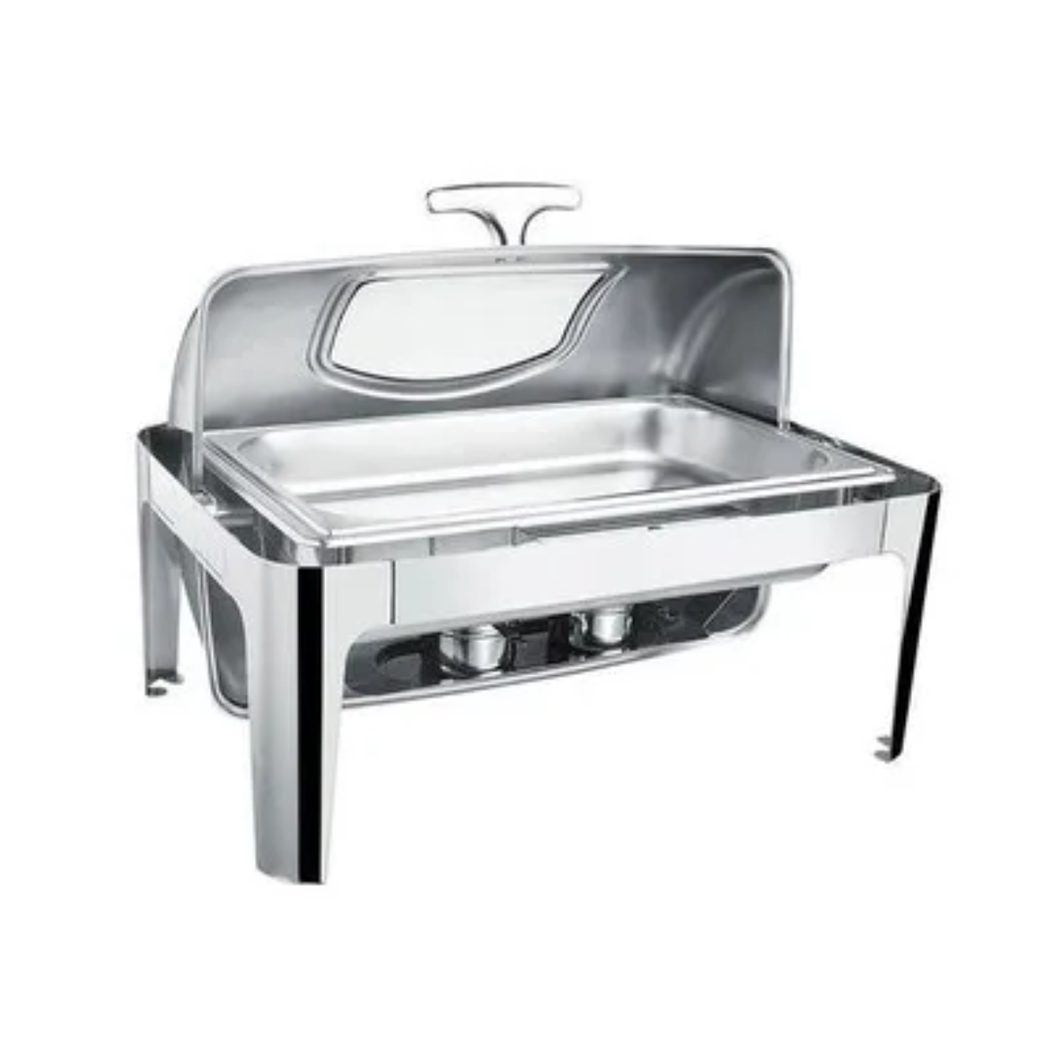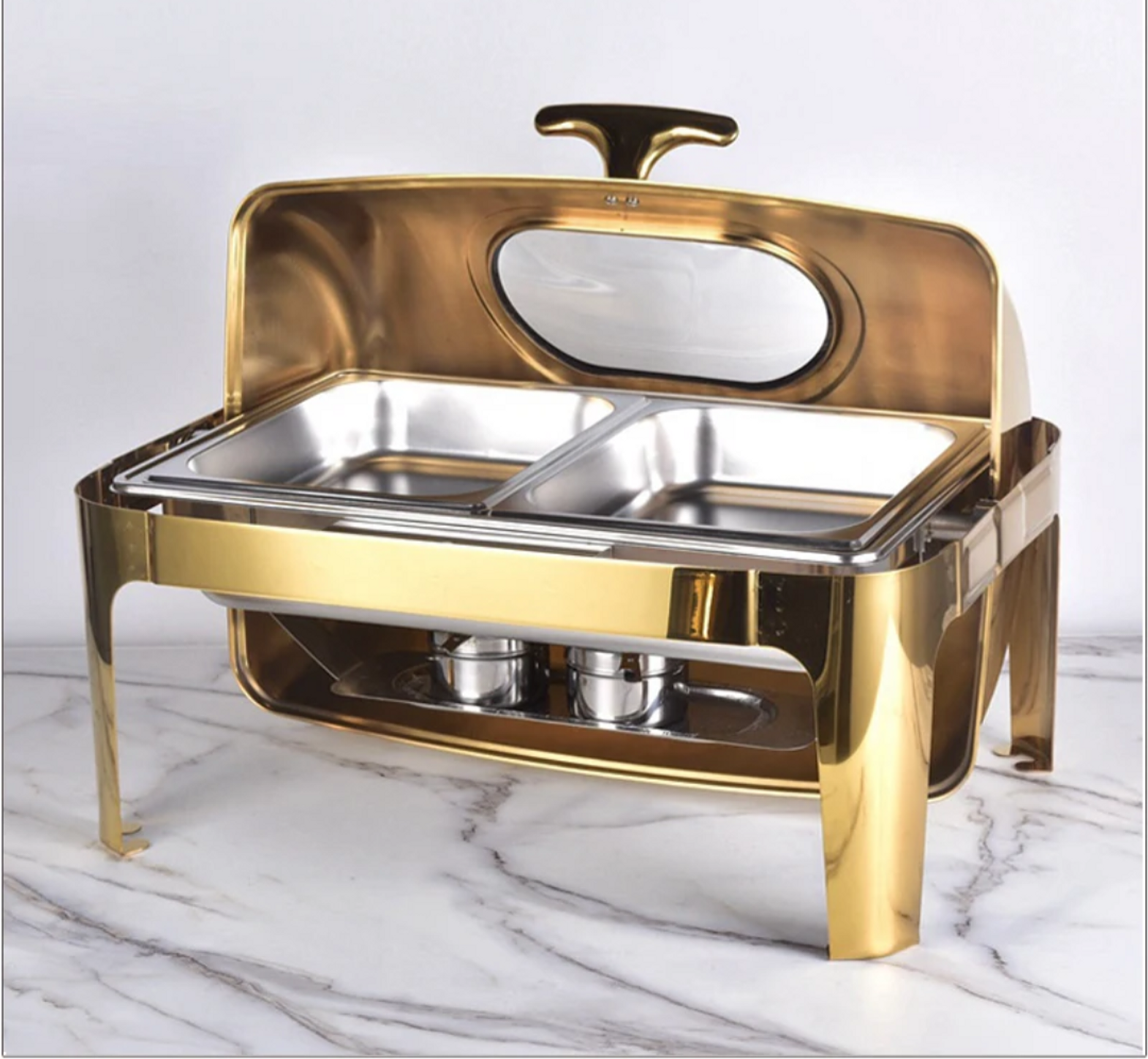 Upgrade your buffet setup with this 9 litre roll top chafing dish, designed for smooth, convenient food service and elegant presentation. The roll-top rotating lid allows easy access from both sides, making it perfect for high-traffic buffet lines. Crafted from high-quality stainless steel, it offers excellent heat retention to keep food warm for longer. Available in luxurious gold and classic silver finishes, and with single or double inserts, this chafing dish is ideal for hotels, catering services, weddings, parties, and corporate events.