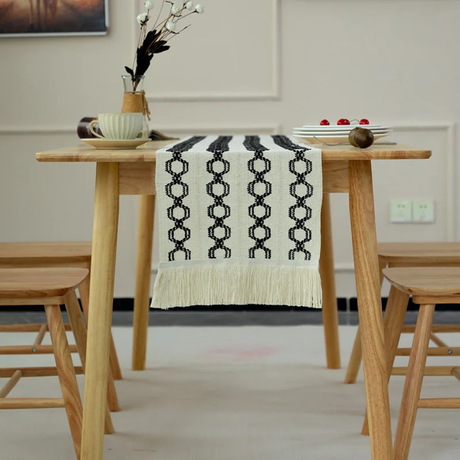 Enhance your dining or living space with this Black Bohemian Tassel Table Runner, crafted to bring a sleek yet warm aesthetic to your home. Designed with a chic boho-inspired pattern and stylish tassel detailing, it blends timeless elegance with everyday functionality.