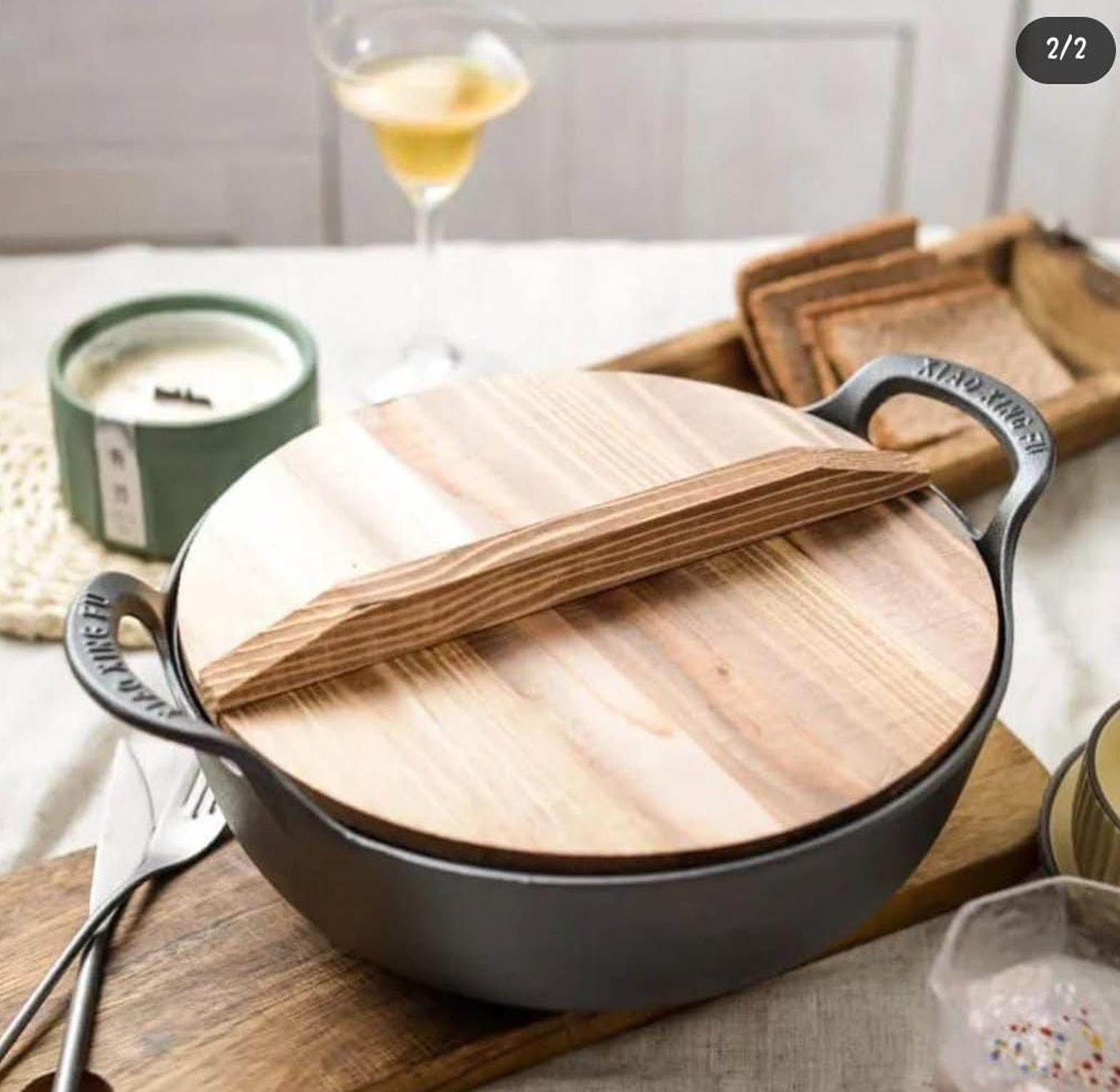 A durable cast iron skillet/frying pan with a bamboo lid, combining traditional cooking performance with an eco-friendly, stylish touch.