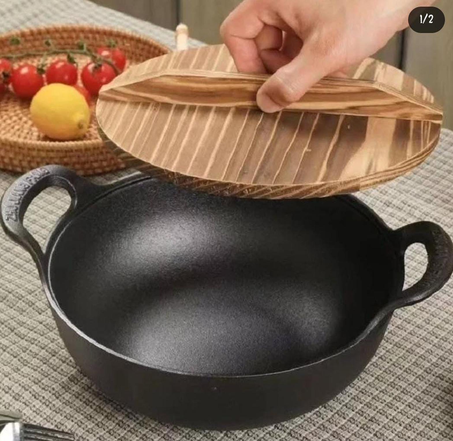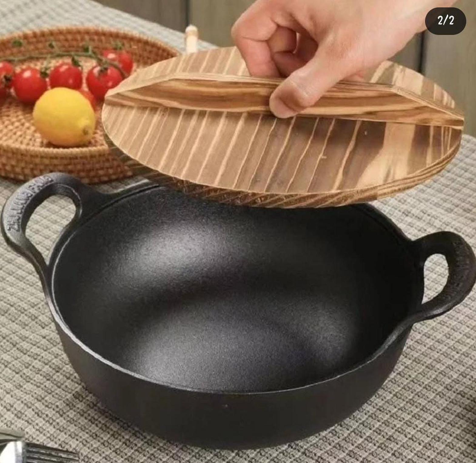 This cast iron skillet/frying pan with a bamboo lid brings together the best of classic cooking and modern design. The heavy-duty cast iron construction ensures excellent heat retention and even cooking, making it ideal for frying, searing, and sautéing a variety of dishes, from crispy bacon to perfectly cooked steaks. The included bamboo lid adds a sustainable, stylish element, offering a natural touch to the kitchen while helping to trap heat and moisture for more efficient cooking. The bamboo also provides a protective barrier when storing the pan, ensuring it stays dry and free from dust. Perfect for home chefs who value both function and aesthetics, this skillet is as versatile as it is durable, providing years of reliable cooking and a sleek addition to any kitchen.