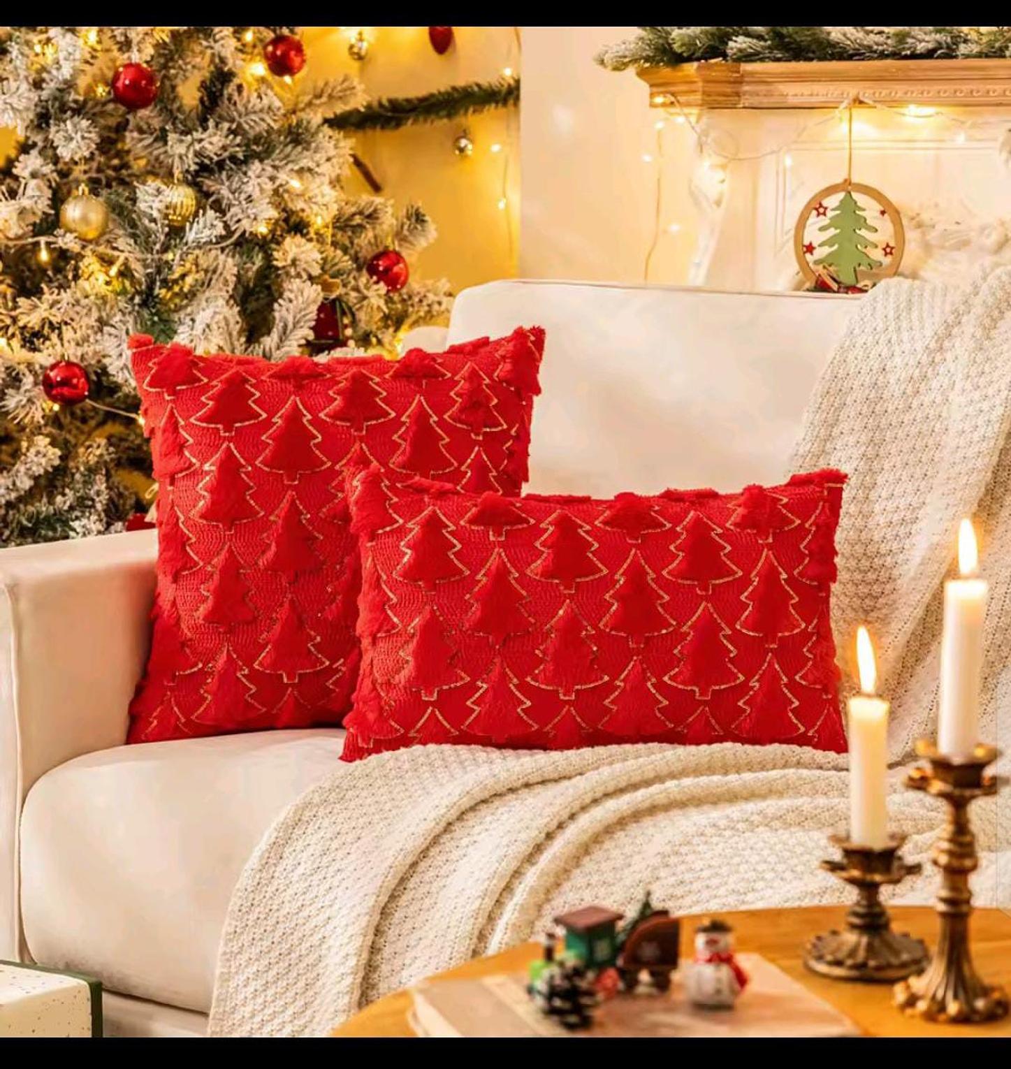 Festive throw pillow covers featuring textured Christmas tree patterns with elegant glitter detailing. Available in white and red to instantly elevate your holiday décor.