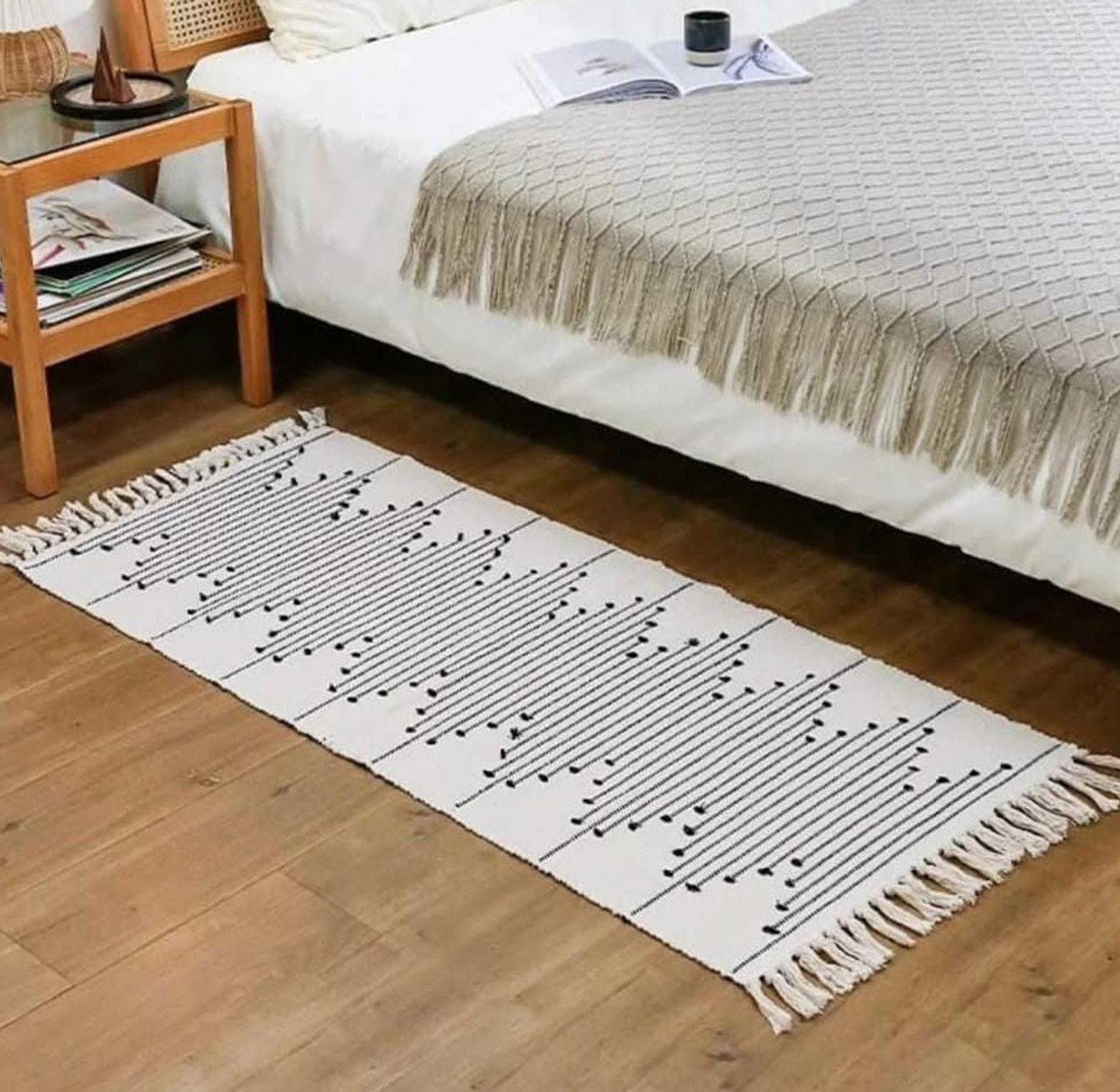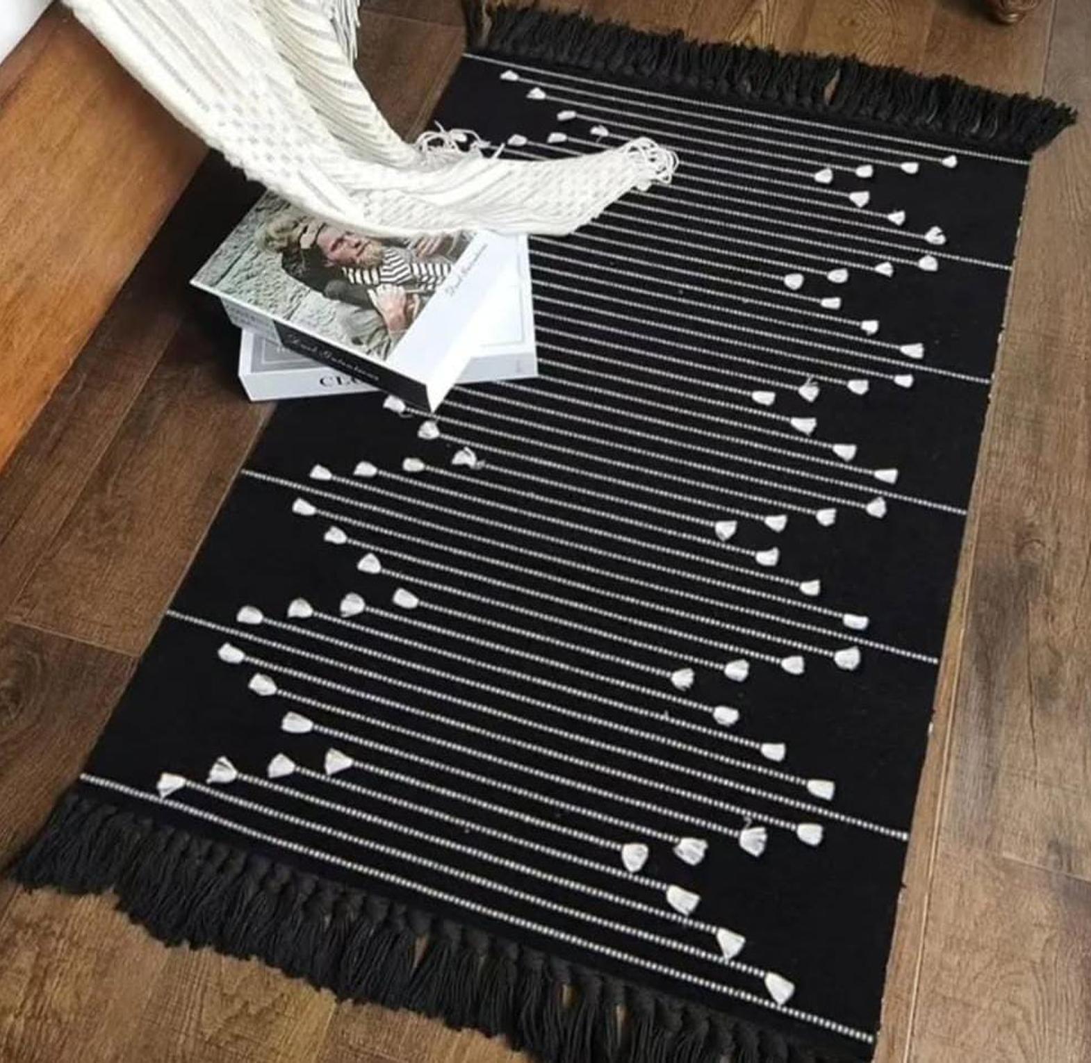 A handcrafted cotton-woven area rug with decorative tassels, combining soft texture and artisanal charm to elevate any room’s décor.