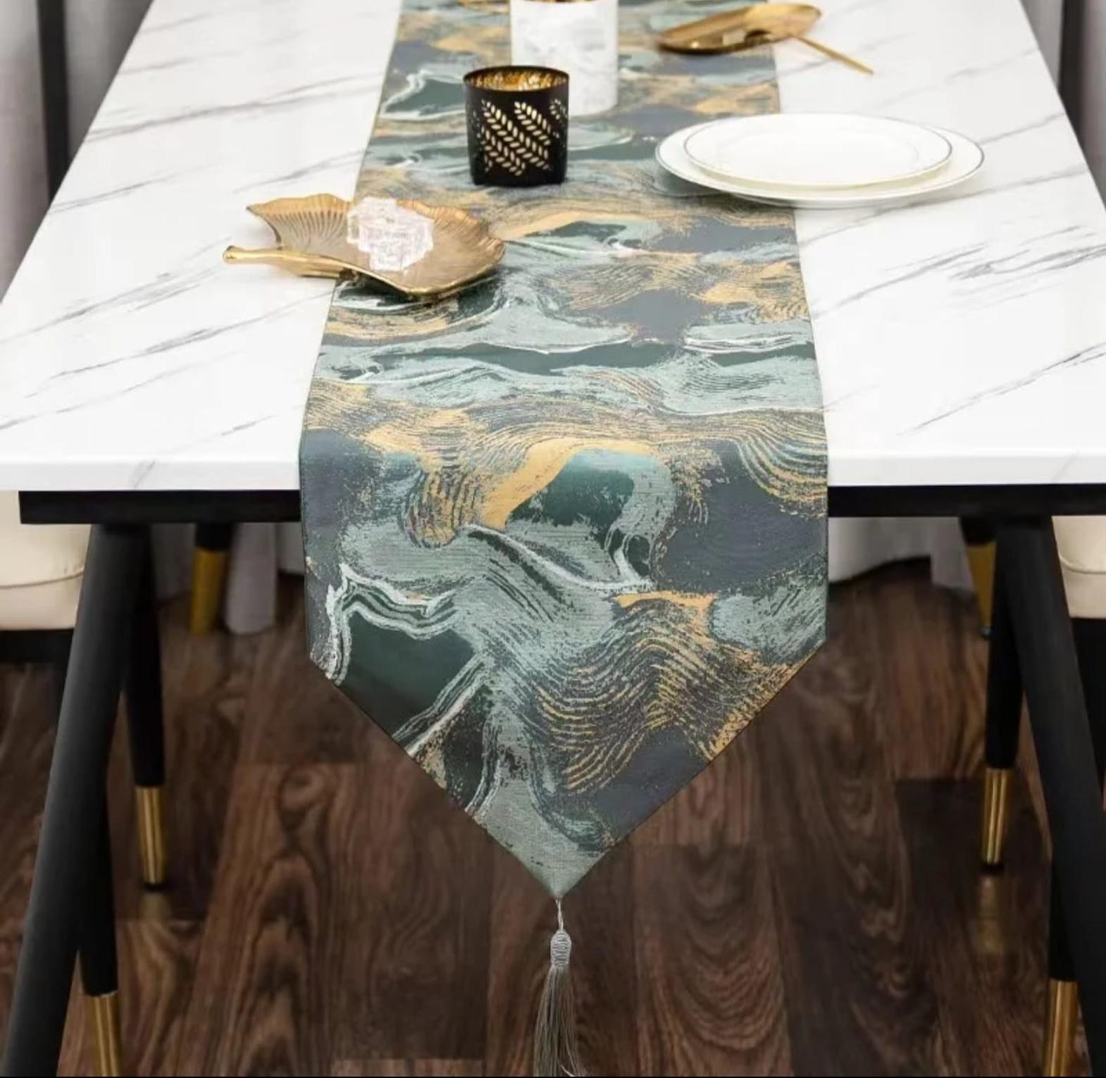 The runner is finished with decorative tassels on both ends, creating a soft, luxurious accent that elevates both modern and classic interiors. Available in beige and green, it blends effortlessly with neutral and earthy décor palettes. Perfect for dining tables, coffee tables, sideboards, or console tables.
