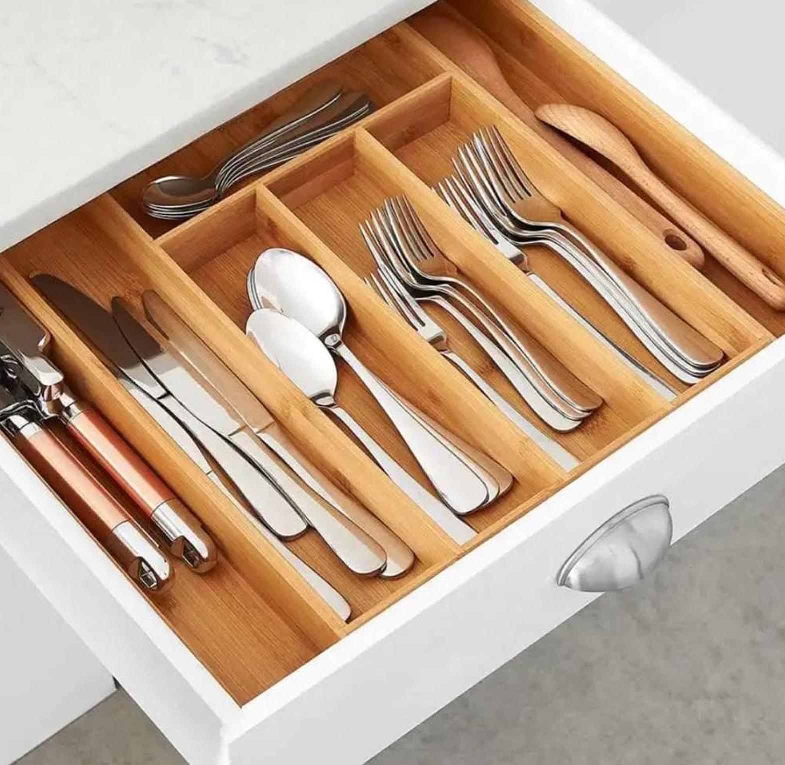 Our expandable bamboo cutlery/drawer organizer is a versatile and eco-friendly solution for bringing order to messy kitchen drawers. Made from durable, natural bamboo, it not only resists moisture and warping but also adds a warm, organic touch to your kitchen setup. The expandable sides adjust to fit various drawer sizes, offering between 5 to 7 compartments to accommodate cutlery, utensils, or even office supplies. Smooth sliding action makes expansion effortless, while the well-crafted dividers keep everything in its place for quick access. Whether you're organizing forks and knives or tools and stationery, this drawer insert combines strength, sustainability, and functionality—making it an essential piece for a clutter-free home.
