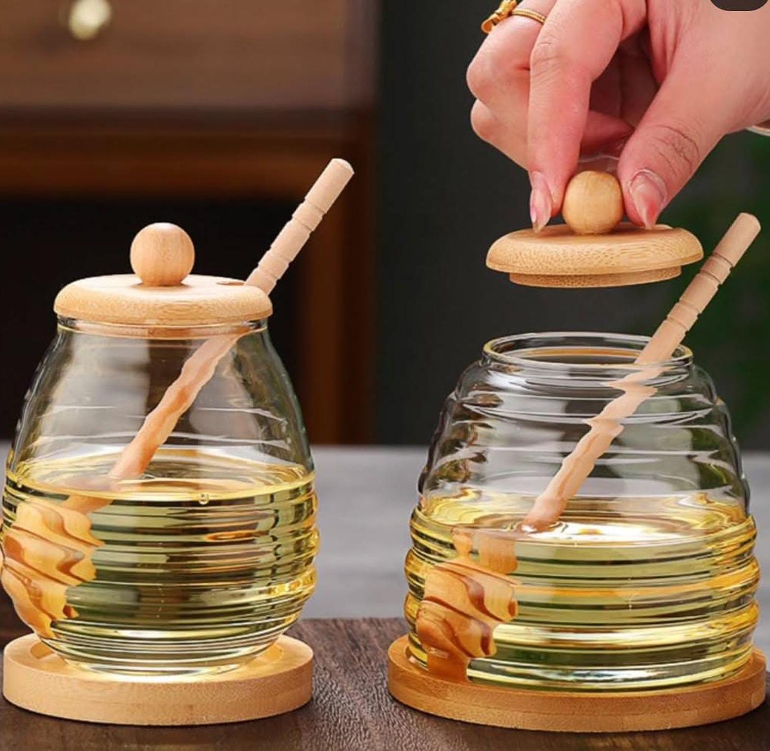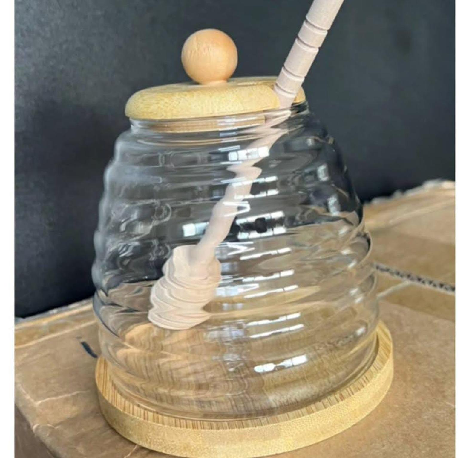 This beautifully designed glass honey jar is both practical and decorative, making it the perfect addition to your kitchen or breakfast table. The sturdy glass jar keeps your honey fresh, while the wooden lid helps seal in the flavor and prevent spills. The accompanying wooden stirring stick makes it easy to drizzle just the right amount of honey, and the included base ensures the jar stays securely in place. Whether you're serving honey with tea or adding a touch of sweetness to your favorite dishes, this set combines elegance and functionality to make every pour a delight.