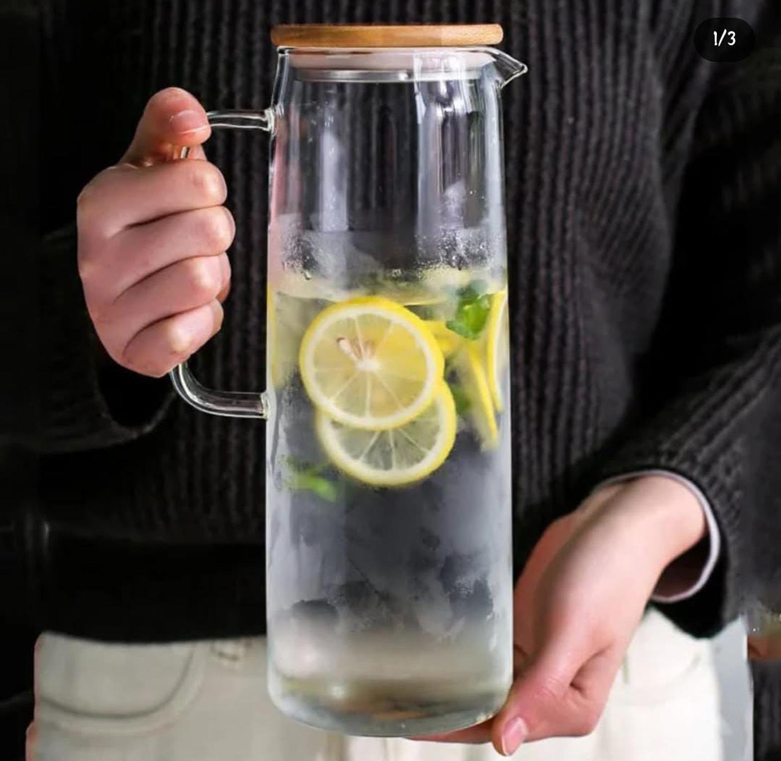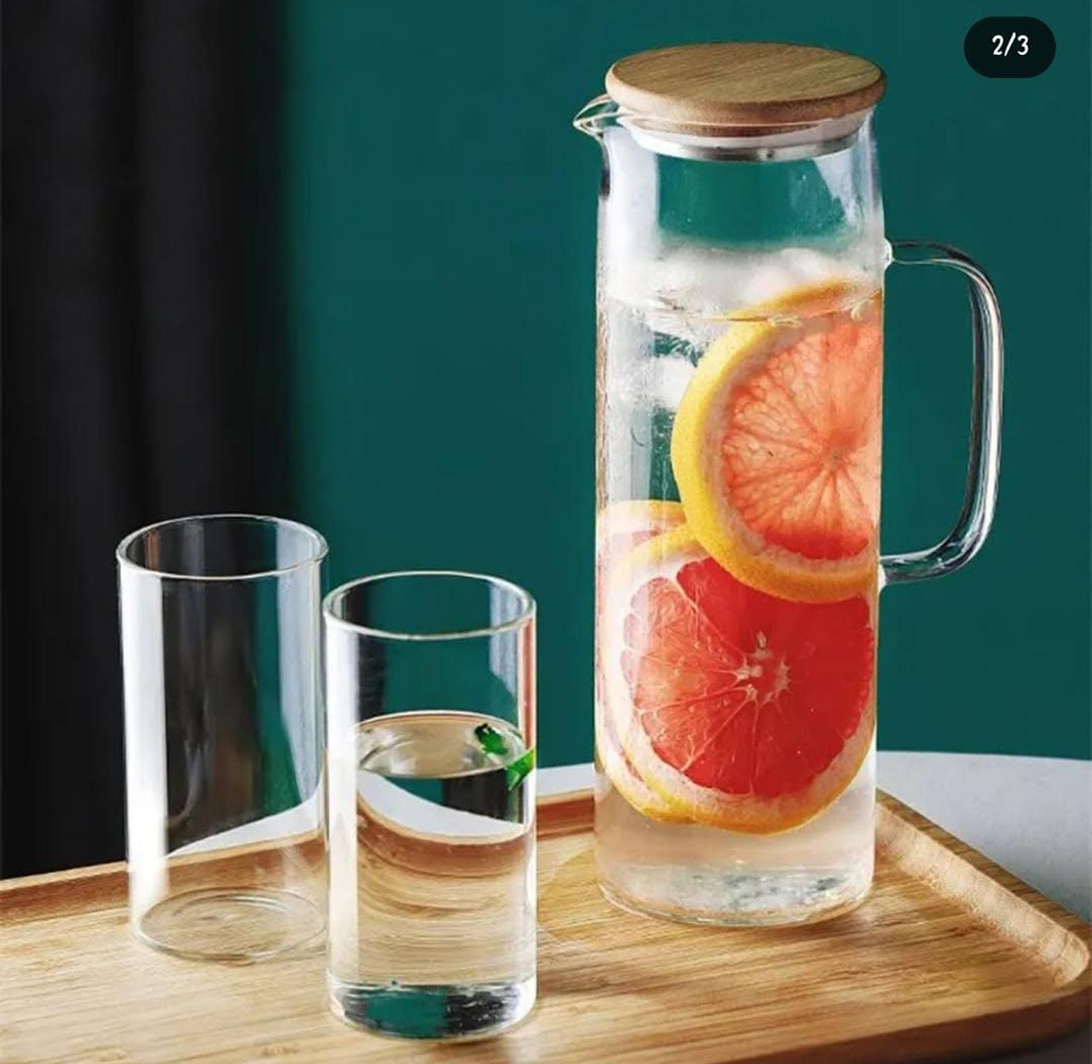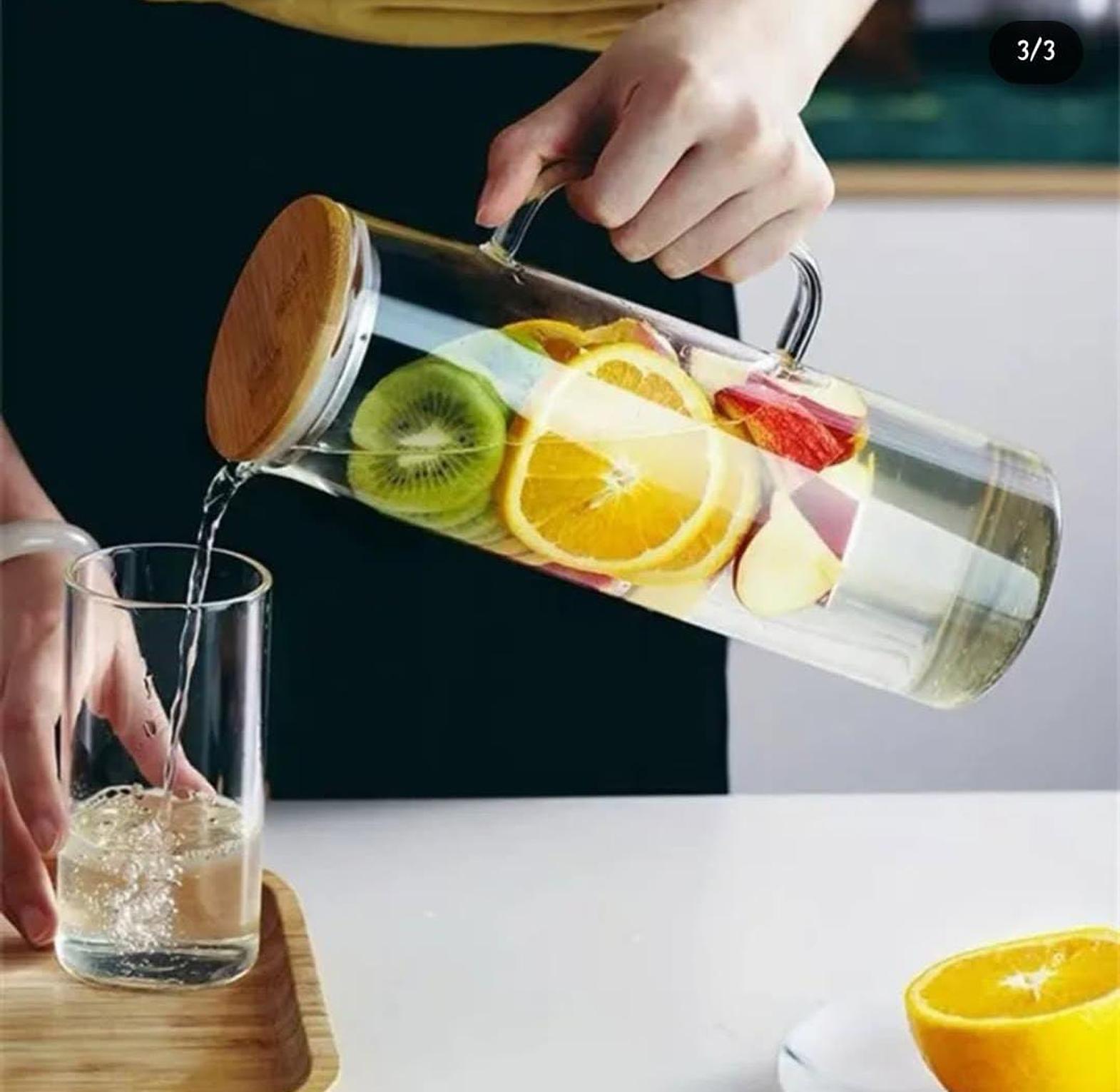 Elevate your beverage presentation with this beautifully crafted glass water and juice jug, designed for both style and practicality. Made from high-quality, heat-resistant glass, it offers a crystal-clear view of your drinks while maintaining freshness with its eco-friendly bamboo lid. The snug-fit lid prevents spills and dust, making it perfect for serving water, juice, infused drinks, or even iced tea. With a sleek silhouette and a comfortable handle for easy pouring, this jug is a versatile addition to any kitchen, dining table, or outdoor gathering—combining modern elegance with everyday convenience.