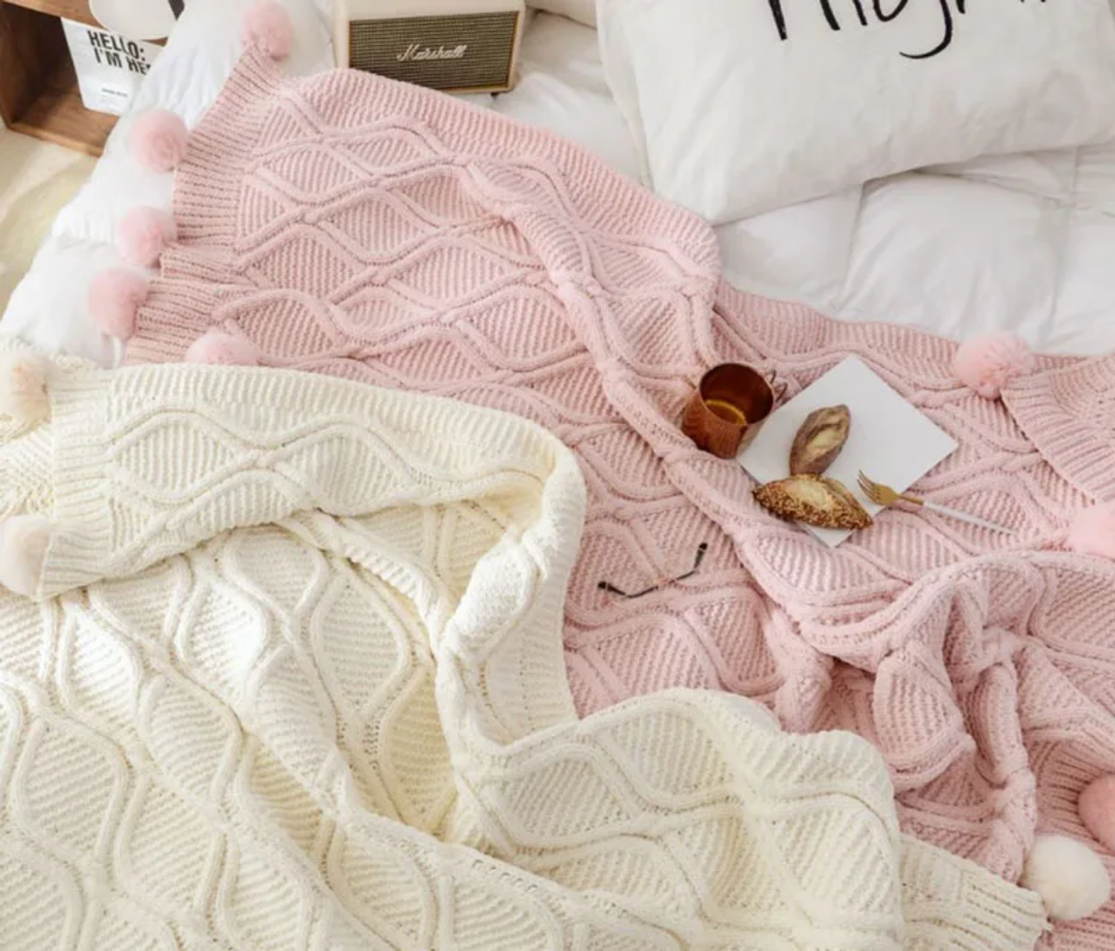 Add warmth and charm to your home with this beautifully knitted throw blanket, designed with playful pom pom accents on all four corners. Measuring 127cm by 172cm, it’s the perfect size for layering over your sofa, bed, or armchair. Soft, stylish, and versatile, it blends comfort with a touch of elegance—making it a must-have for cozy evenings or as a chic accent piece in your décor.