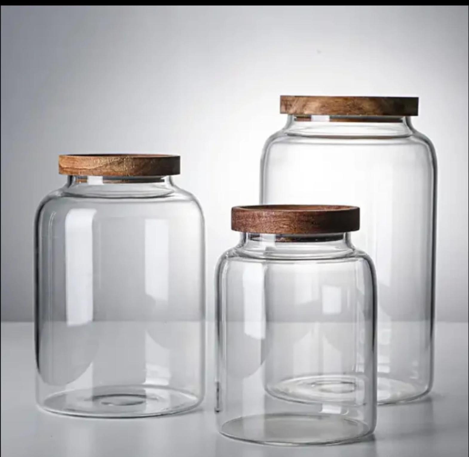 Keep your pantry neat and your dry foods fresh with these Large Capacity Glass Storage Containers. Designed for modern, organized kitchens, each container features thick clear glass for easy visibility and airtight wooden lids with silicone seals to lock in freshness. Perfect for storing cereals, flour, sugar, pasta, and other dry goods.