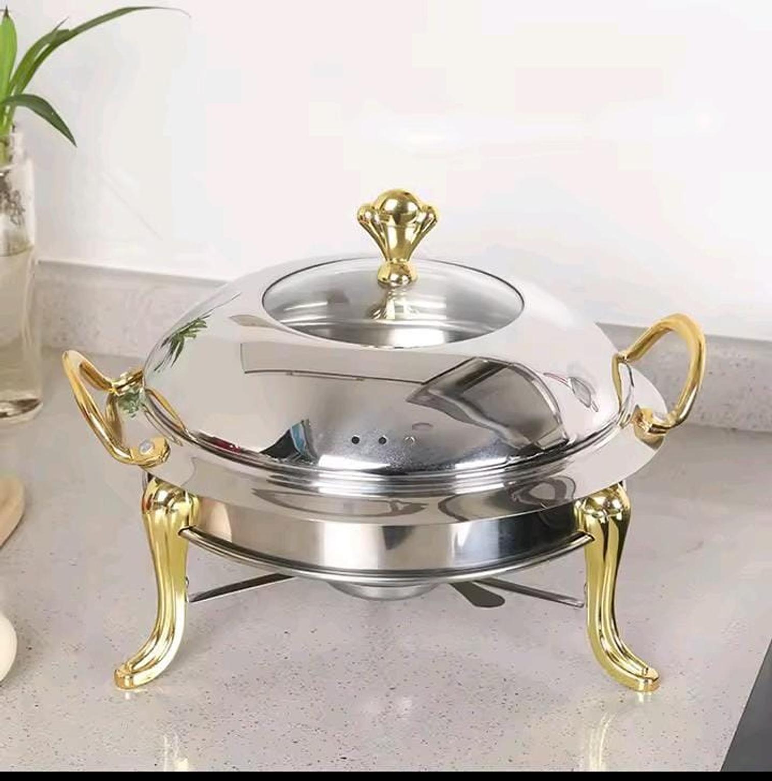 This Round Stainless Steel Buffet Food Warmer / Chafing Dish is crafted from high-quality stainless steel with a polished mirror finish and stylish gold-accented handles and legs. Designed for both functionality and presentation, it keeps food warm for extended periods, making it ideal for buffets, catering events, parties, hotels, and home entertaining. The sturdy stand ensures stability, while the round shape allows for easy serving and heat distribution. Its classic yet modern design makes it a standout piece on any dining or buffet setup.