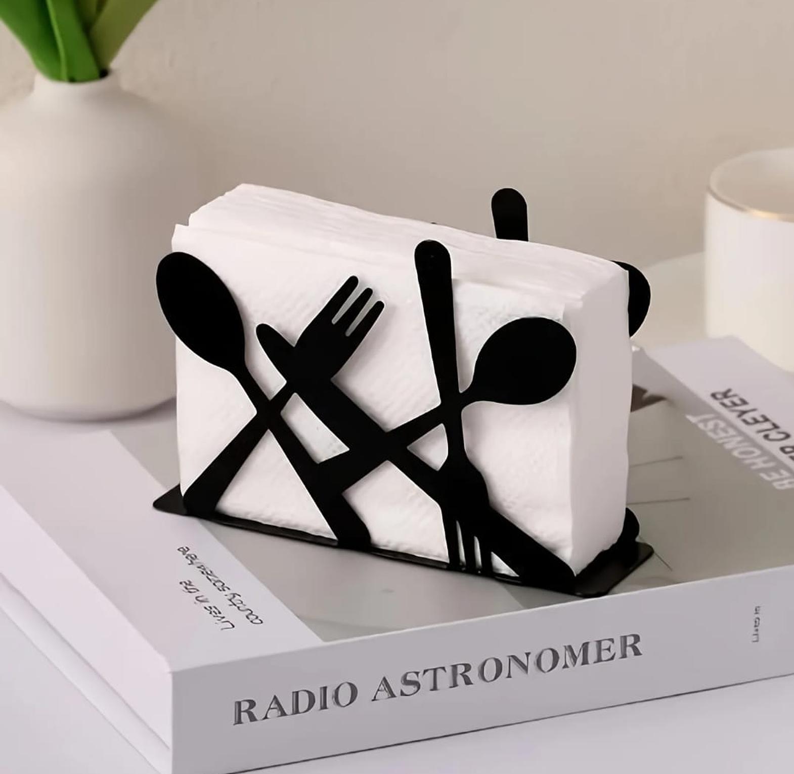 Stylish and modern serviette holder designed in a unique metallic coffee cup/cutlery shape. Adds a decorative touch to your dining table while neatly holding your serviettes in place. ✓ Durable metallic finish ✓ Elegant and functional design ✓ Perfect for kitchen, dining table, or café setup