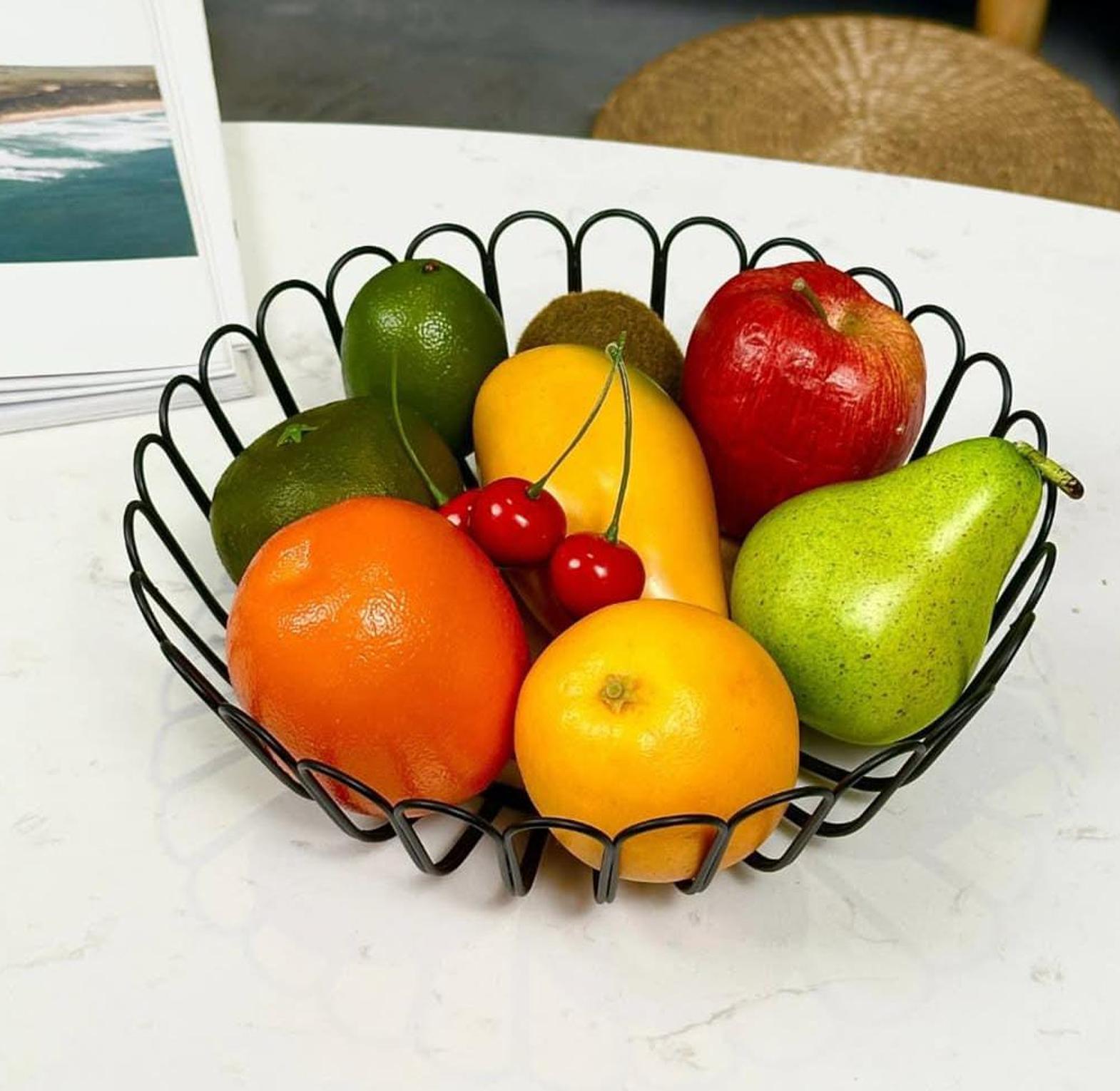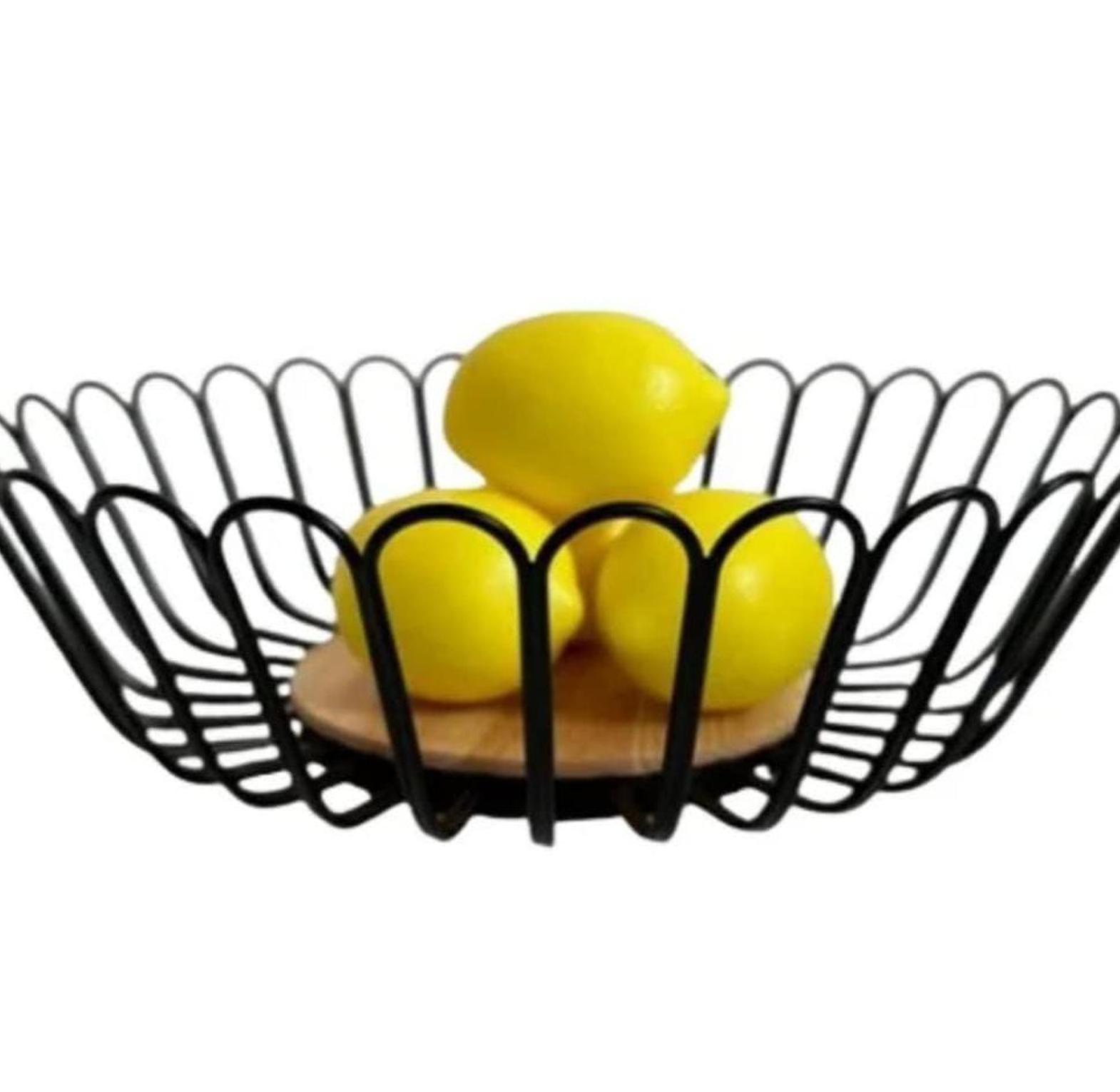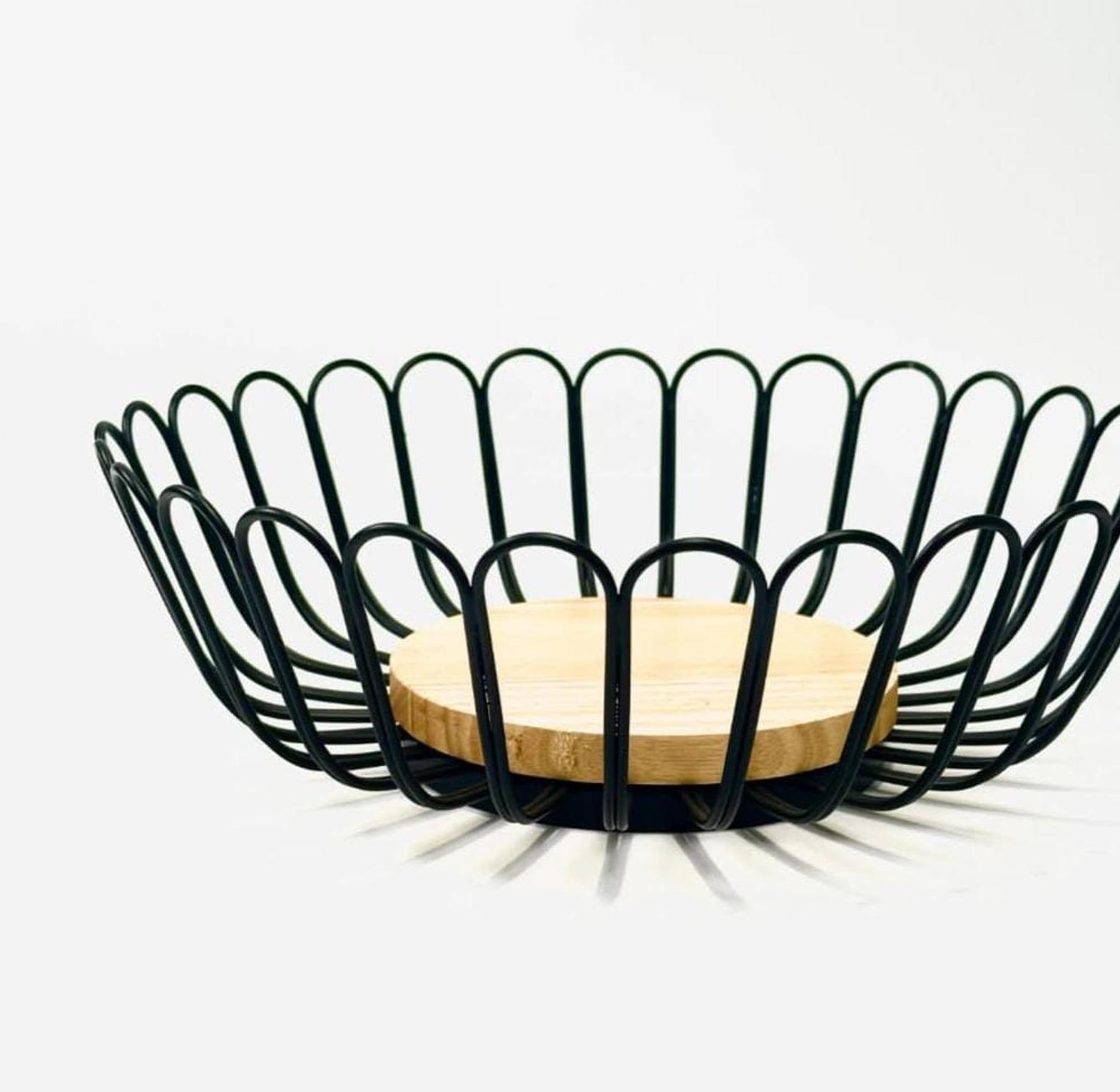 This black metallic fruit basket with a wooden base offers a striking balance of contemporary design and timeless durability. The sleek black metal frame is both durable and eye-catching, adding a modern flair to your kitchen or dining room. The solid wooden base provides a warm contrast to the cool metal, offering stability and preventing the basket from sliding around. Its open design allows for excellent air circulation, helping to keep your fruits fresh, while the spacious interior accommodates a variety of produce, from apples and bananas to citrus or exotic fruits. Whether used for everyday meals or special occasions, this fruit basket effortlessly enhances any space with its combination of form and function.