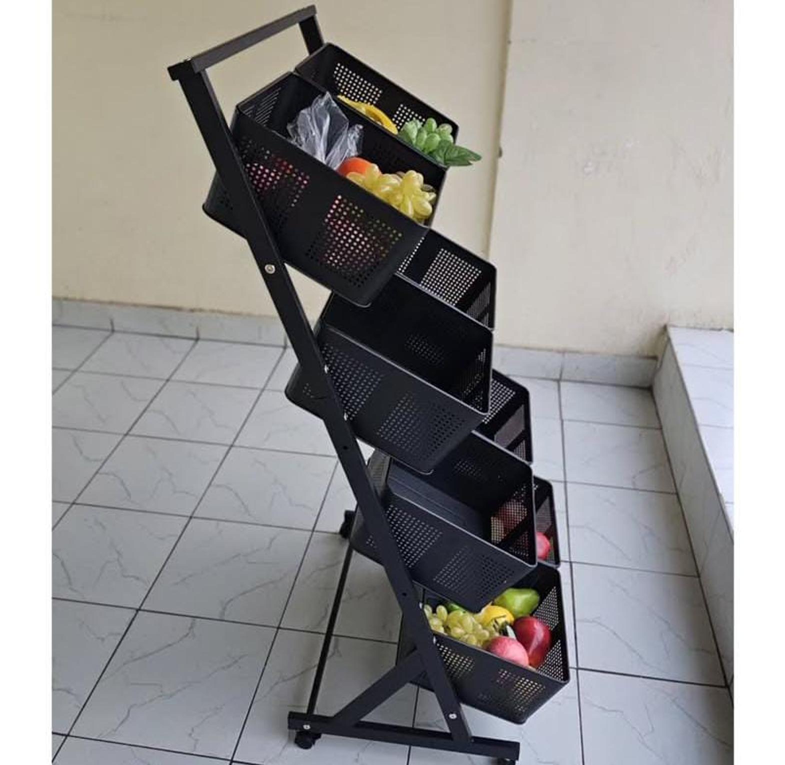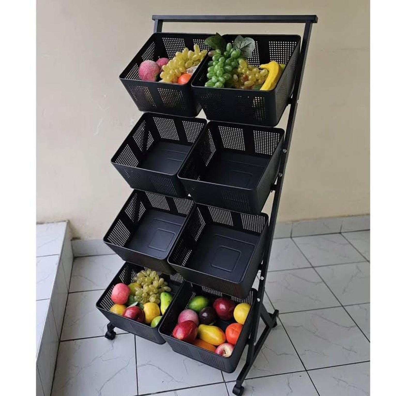 This metallic vegetable and fruit rack is designed to bring both style and functionality to your kitchen or pantry. Constructed from durable, high-quality metal, it provides multiple tiers for organizing and displaying fruits, vegetables, and other kitchen essentials in an orderly manner. The lockable wheels offer easy mobility, allowing you to move the rack around when needed and then securely lock it in place to avoid shifting. Its sleek metallic finish complements any kitchen décor, while the sturdy design ensures long-lasting use. Perfect for keeping your fresh produce within reach while adding a modern touch to your kitchen space.