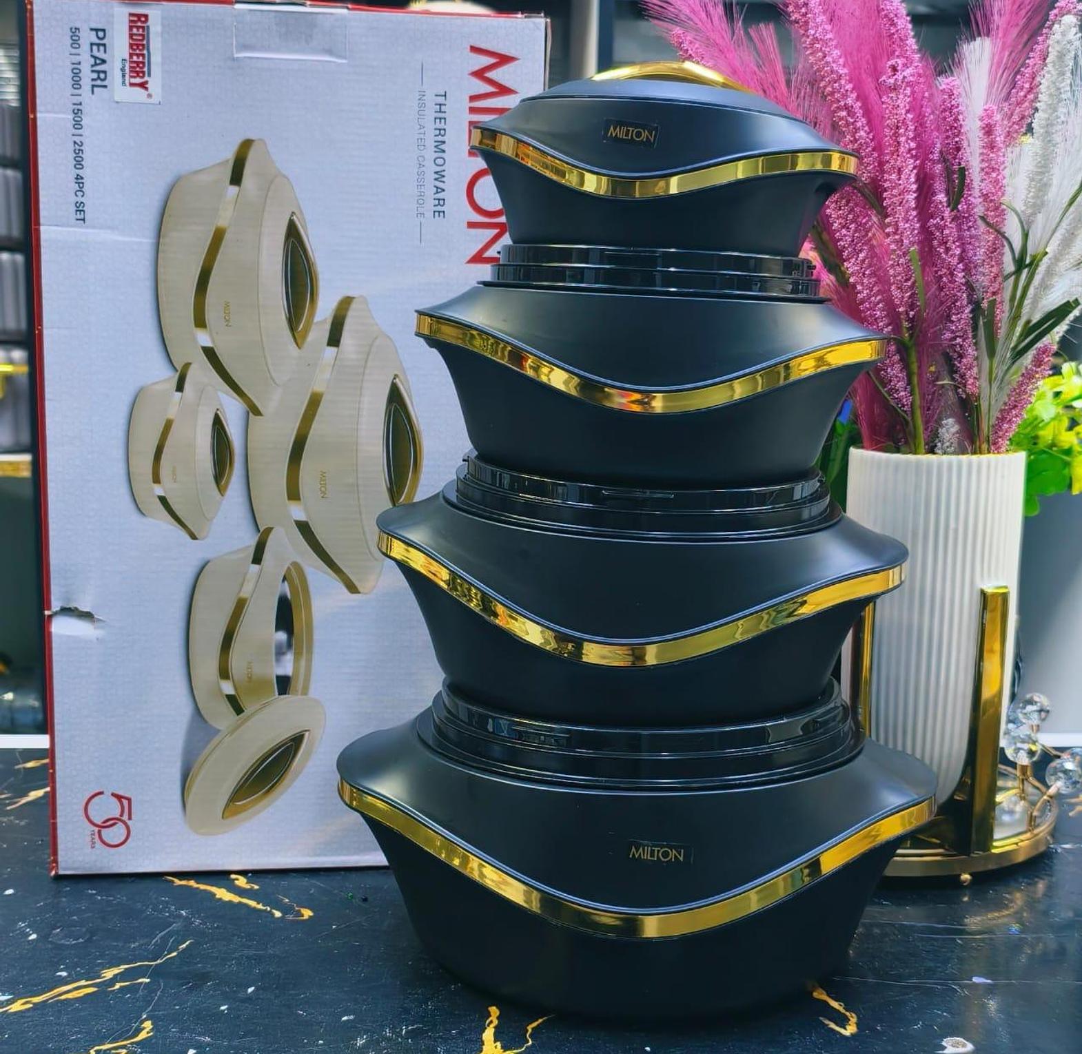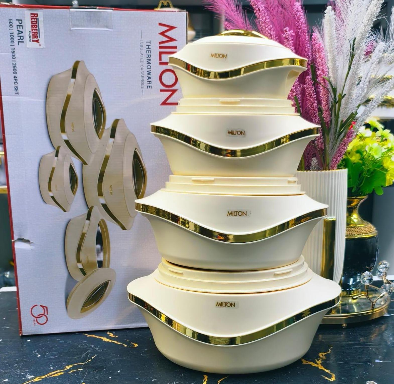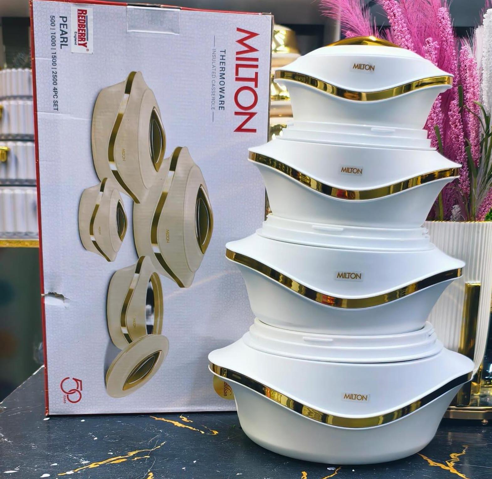 Keep your meals hot, fresh and ready to serve with this elegant 4PCS MILTON Hotpot Set. Designed with a sleek cream finish and gold detailing, these insulated food casseroles are perfect for modern kitchens and stylish serving. ▫️Set includes 4 insulated hotpots ▫️Capacities: 500ml, 1000ml, 1500ml & 2500ml ▫️High-quality thermoware insulation to retain heat longer ▫️Strong, durable outer body ▫️Tight-fitting lids to lock in freshness ▫️Lightweight & easy to carry ▫️Elegant design perfect for table serving Ideal for everyday home use, family dinners, gatherings, catering, and special occasions. A practical and stylish food storage solution for keeping rice, stews, chapati, vegetables and more warm for hours.